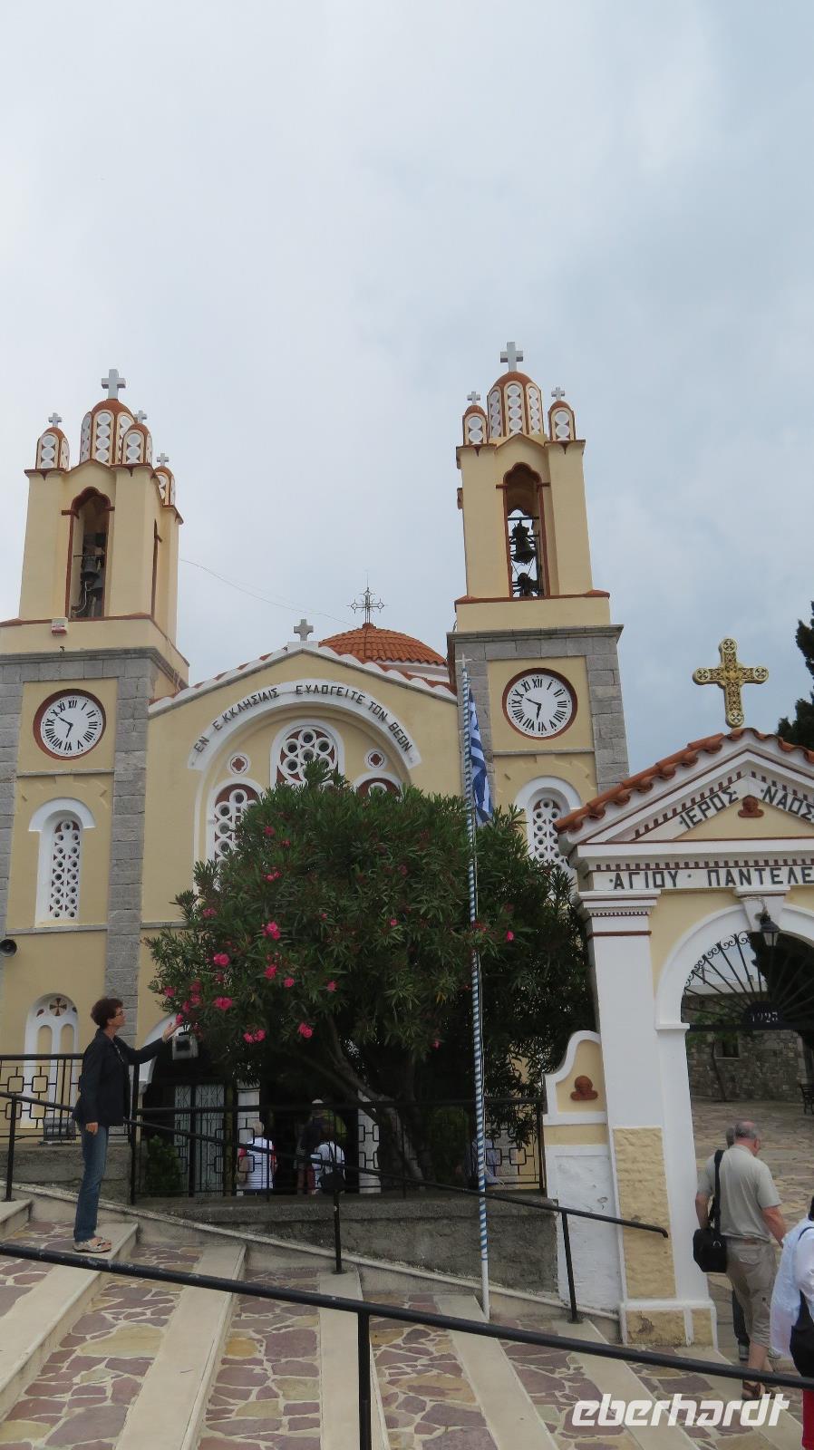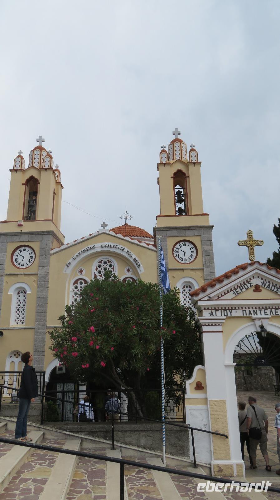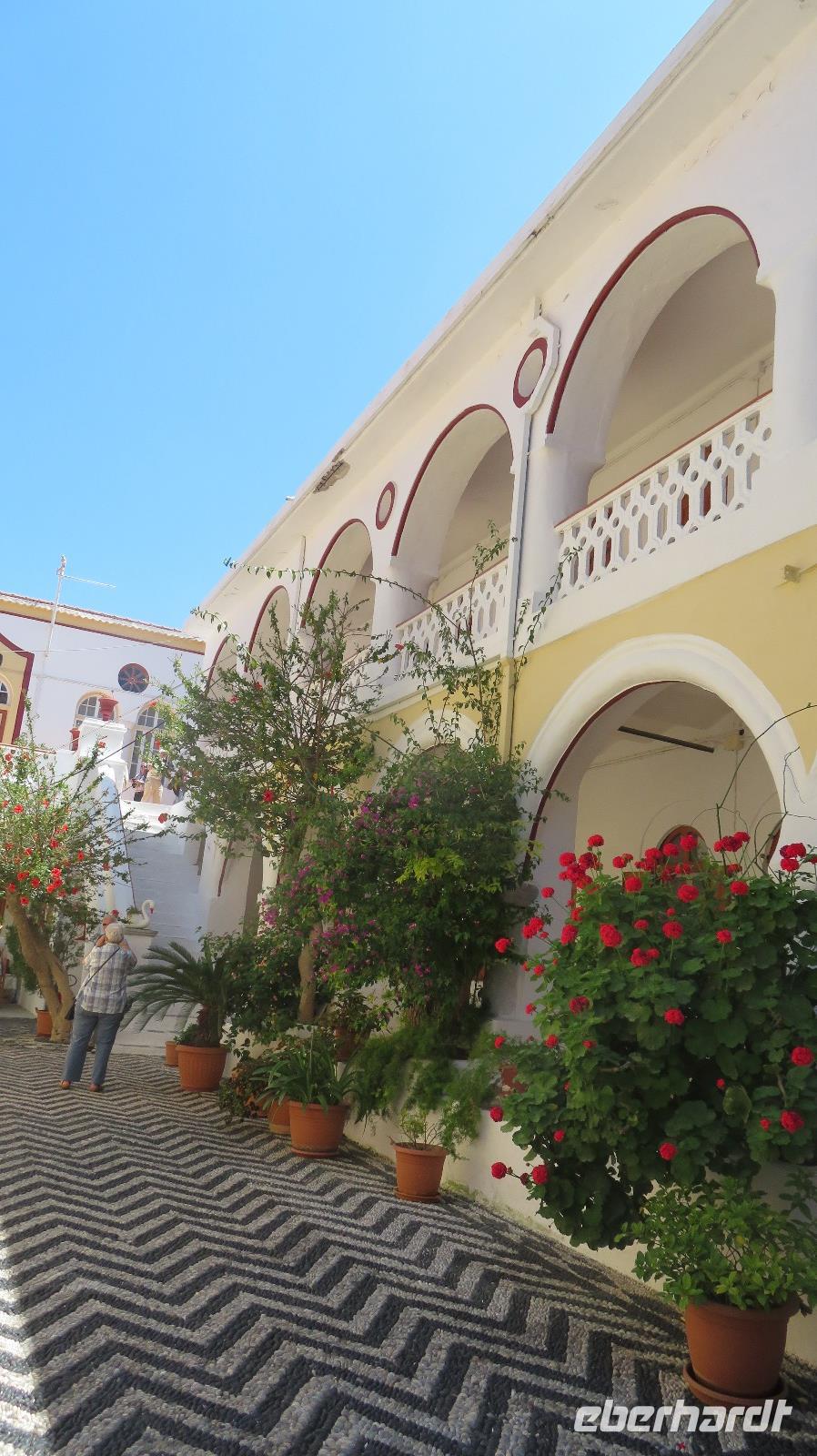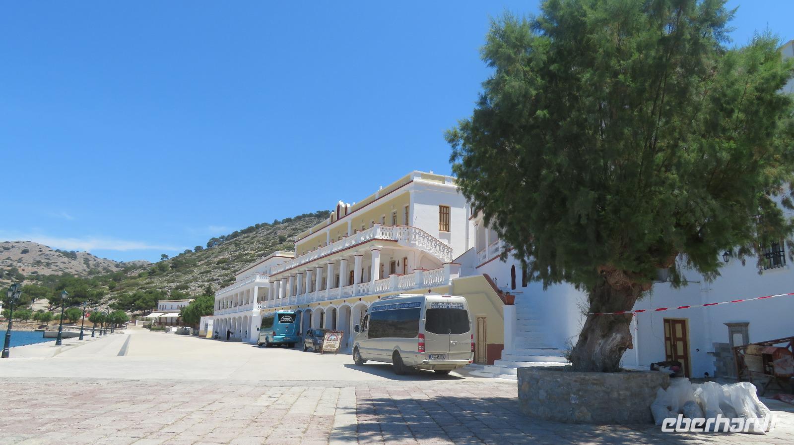 Da der 8. Mai hier Feiertag ist - hier wurde die Kapitulationsurkunde für die in der Südost-Ägäis verbliebenen deutschen Truppen nach dem 2. Weltkrieg unterschrieben und wird deshalb mit einer großen Militärparade gefeiert - ist viel los. Vom Schiff aus sehen wir die Parade und die vielen Menschen die im Hafen sind. Mit dem Bus fahren wir weiter zum Kloster Panormitis. Dieses wurde schon im byzantinischen Reich gegründet und ist dem Erzengel Michael geweiht. Die Klosteranlage wurde mehrmals zerstört, aber im 18 Jh. wieder aufgebaut.