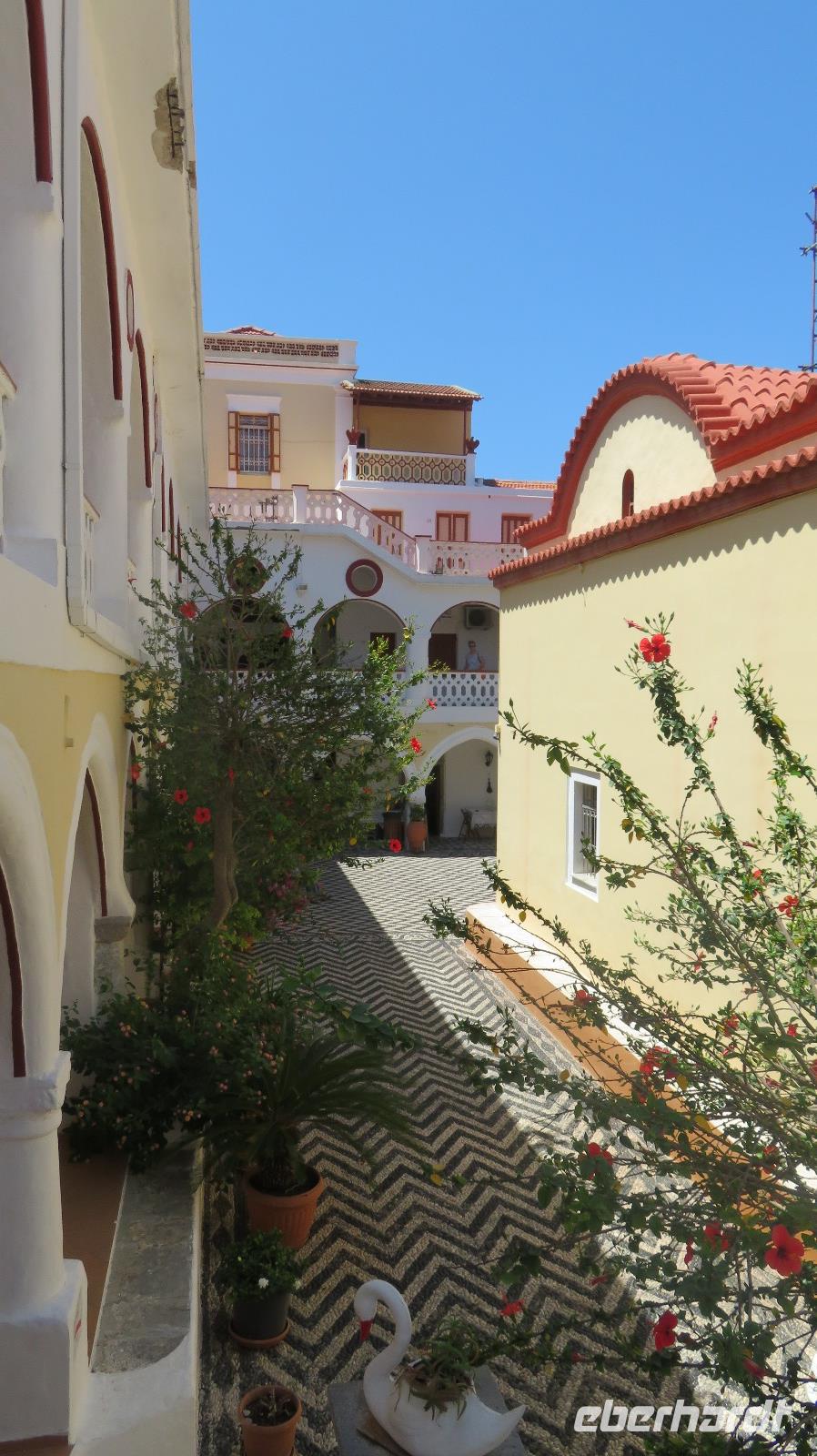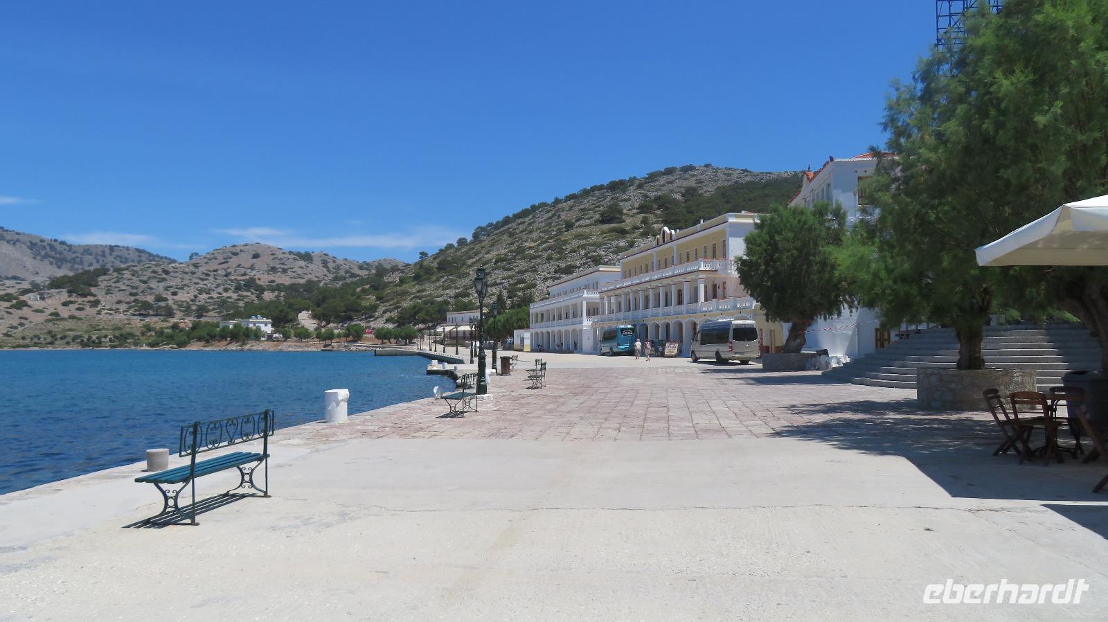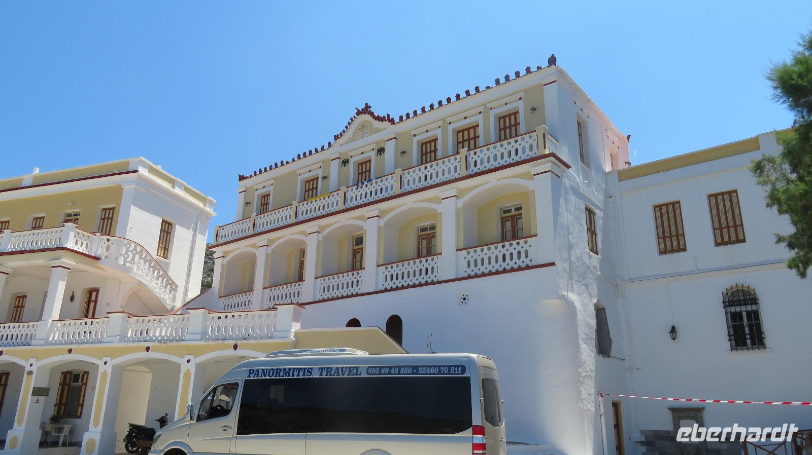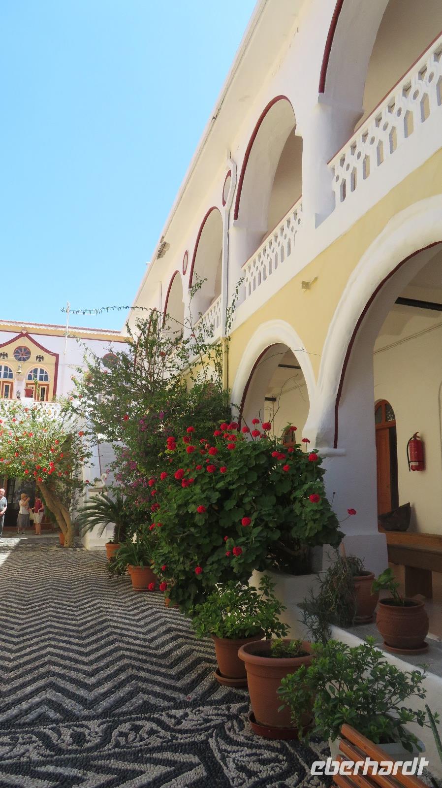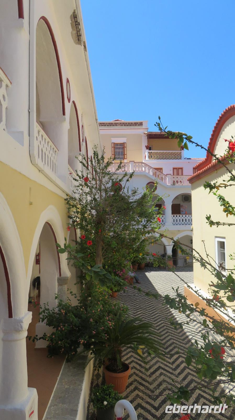 Da der 8. Mai hier Feiertag ist - hier wurde die Kapitulationsurkunde für die in der Südost-Ägäis verbliebenen deutschen Truppen nach dem 2. Weltkrieg unterschrieben und wird deshalb mit einer großen Militärparade gefeiert - ist viel los. Vom Schiff aus sehen wir die Parade und die vielen Menschen die im Hafen sind. Mit dem Bus fahren wir weiter zum Kloster Panormitis. Dieses wurde schon im byzantinischen Reich gegründet und ist dem Erzengel Michael geweiht. Die Klosteranlage wurde mehrmals zerstört, aber im 18 Jh. wieder aufgebaut.
