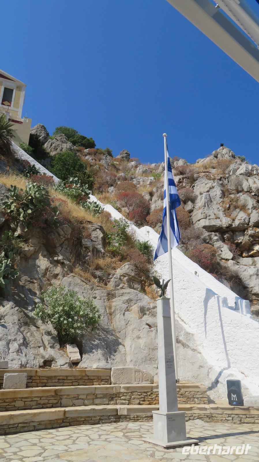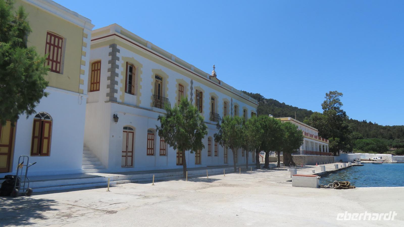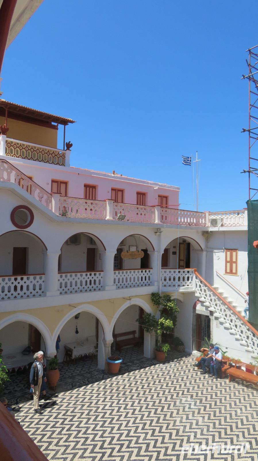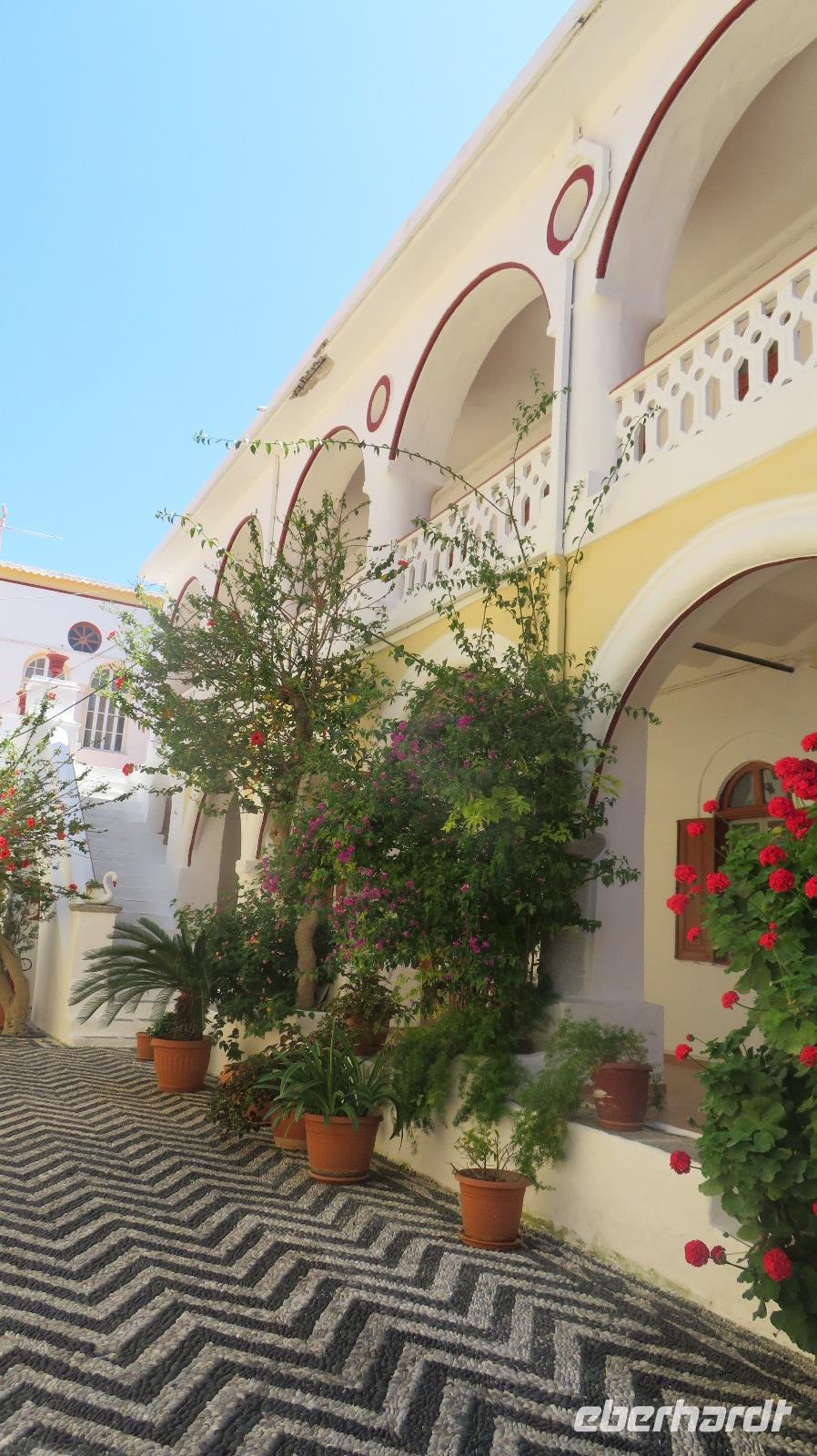 Da der 8. Mai hier Feiertag ist - hier wurde die Kapitulationsurkunde für die in der Südost-Ägäis verbliebenen deutschen Truppen nach dem 2. Weltkrieg unterschrieben und wird deshalb mit einer großen Militärparade gefeiert - ist viel los. Vom Schiff aus sehen wir die Parade und die vielen Menschen die im Hafen sind. Mit dem Bus fahren wir weiter zum Kloster Panormitis. Dieses wurde schon im byzantinischen Reich gegründet und ist dem Erzengel Michael geweiht. Die Klosteranlage wurde mehrmals zerstört, aber im 18 Jh. wieder aufgebaut.