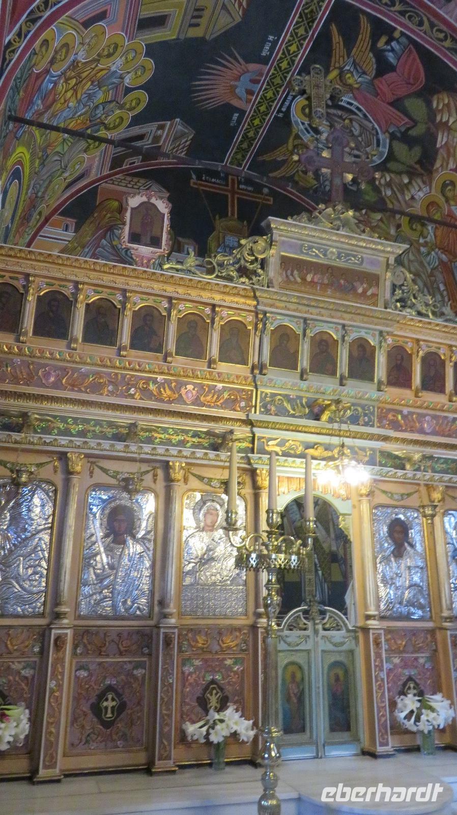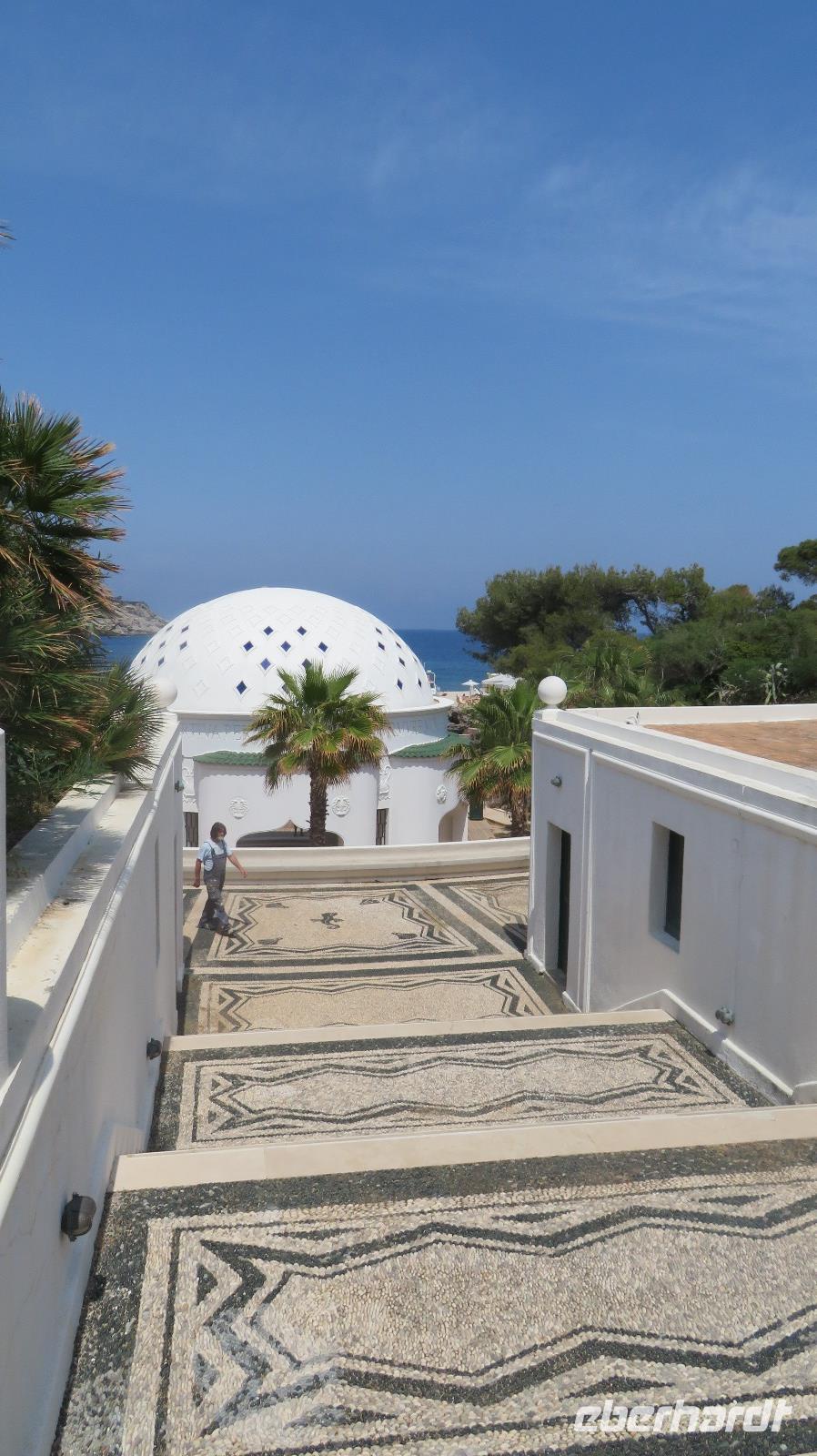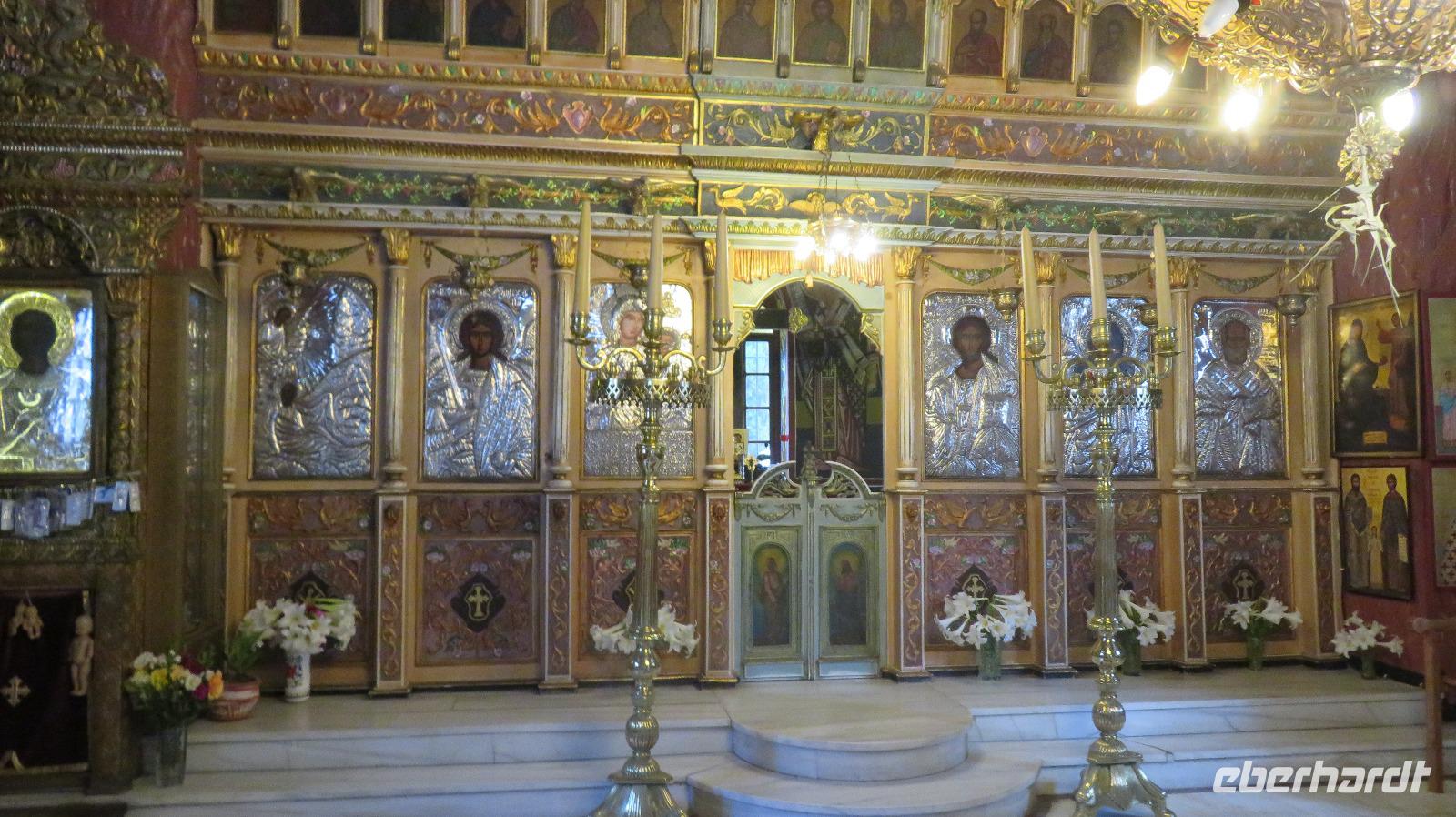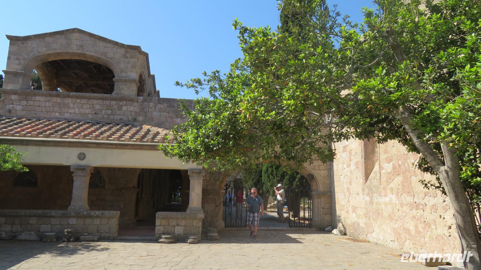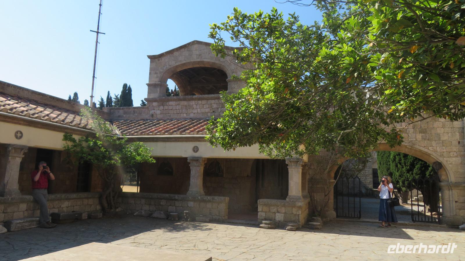 Da der 8. Mai hier Feiertag ist - hier wurde die Kapitulationsurkunde für die in der Südost-Ägäis verbliebenen deutschen Truppen nach dem 2. Weltkrieg unterschrieben und wird deshalb mit einer großen Militärparade gefeiert - ist viel los. Vom Schiff aus sehen wir die Parade und die vielen Menschen die im Hafen sind. Mit dem Bus fahren wir weiter zum Kloster Panormitis. Dieses wurde schon im byzantinischen Reich gegründet und ist dem Erzengel Michael geweiht. Die Klosteranlage wurde mehrmals zerstört, aber im 18 Jh. wieder aufgebaut.