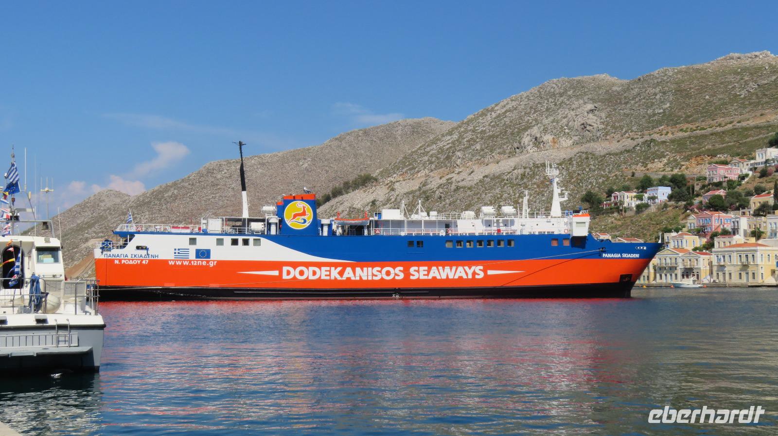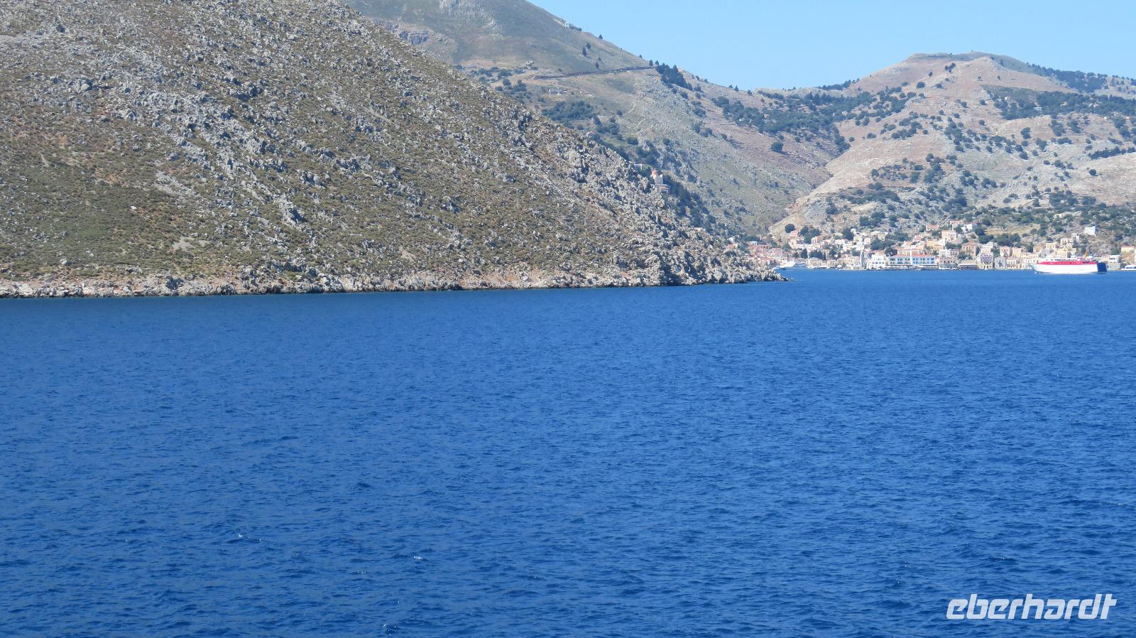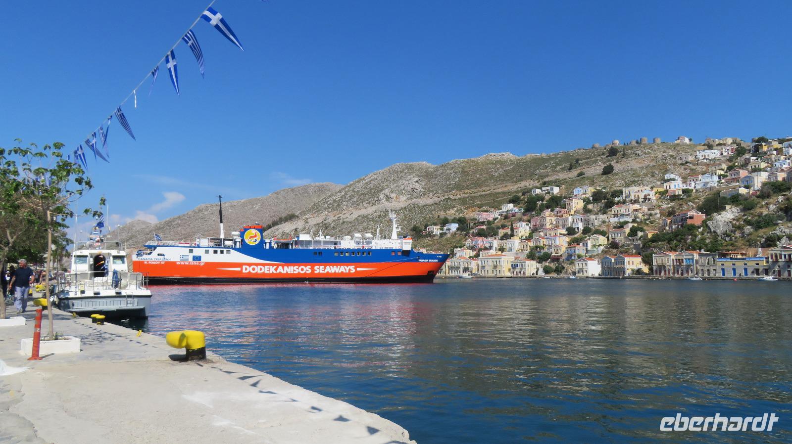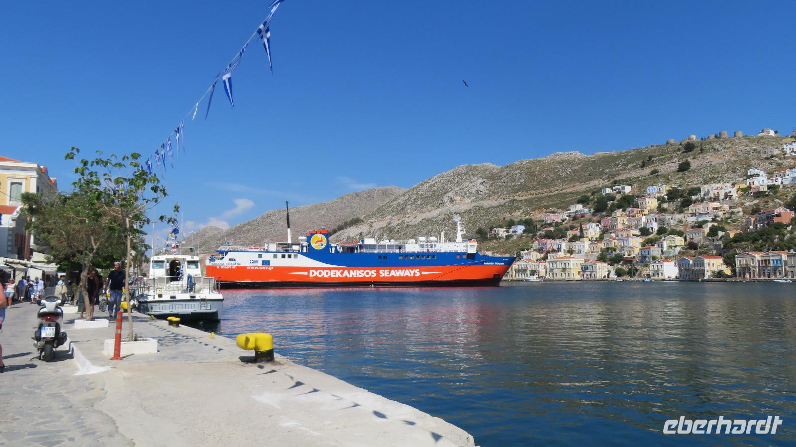 Wir starten früh gemeinsam mit dem Bus, der uns bis zum Hafen bringt. Dort geht es auf die große Fähre nach Symi. Entlang der türkischen Küste genießen wir die Fahrt oben auf Deck in der Sonne.