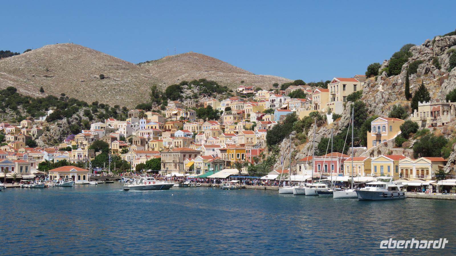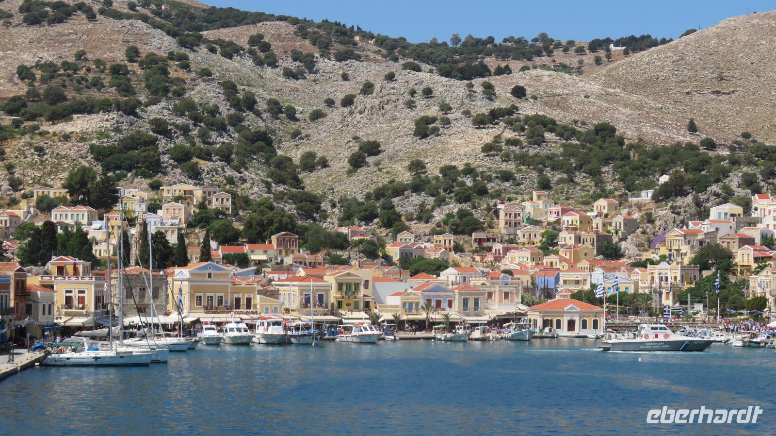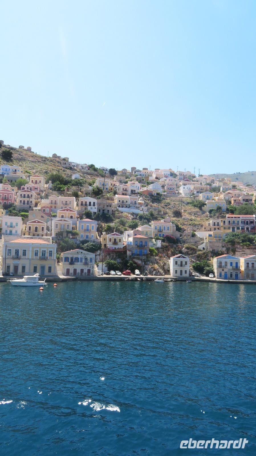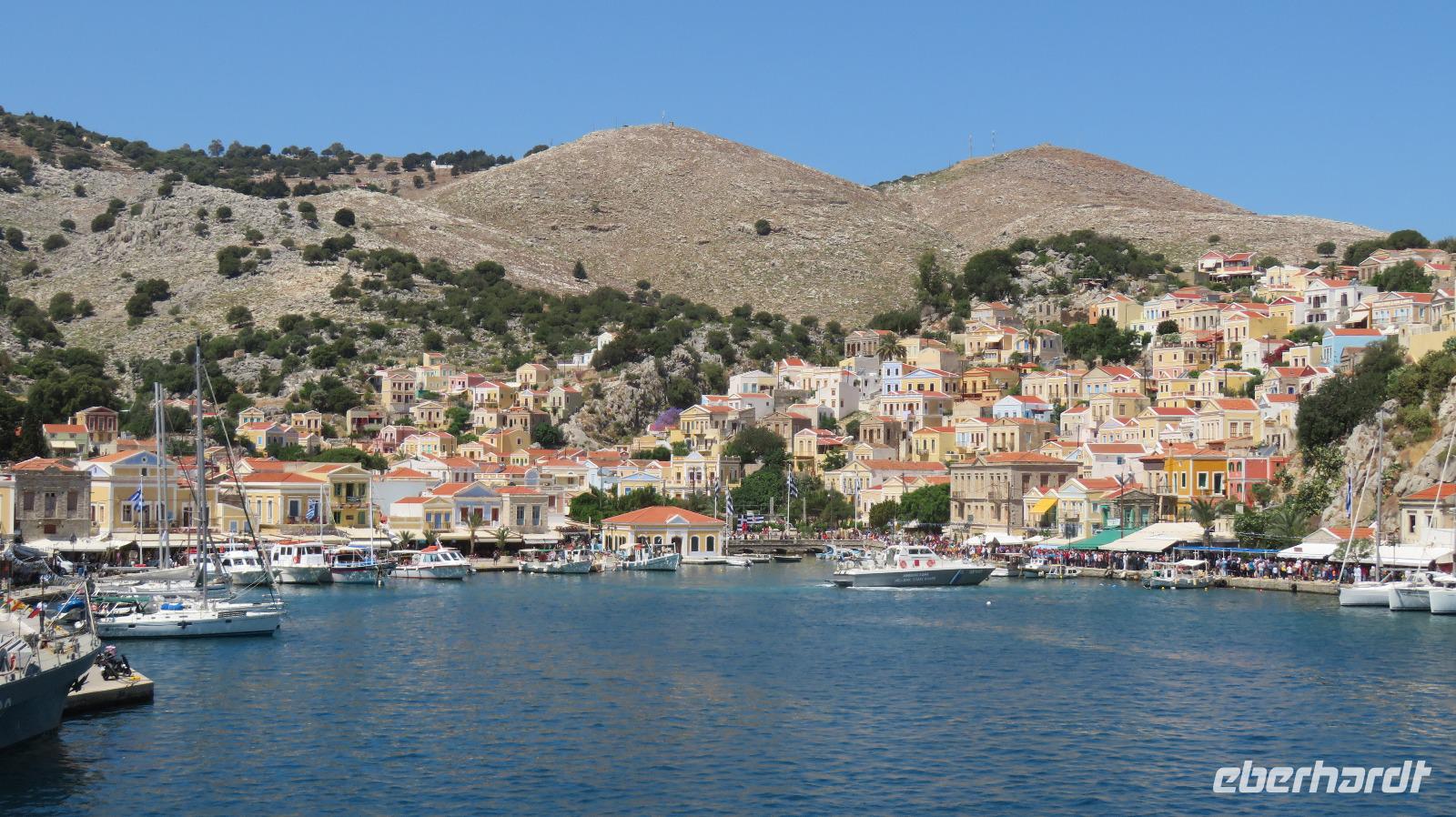 Symi ist malerisch. Die wunderschönen neoklassizistischen Häuser in ihren schönen Farben und der Hafen gefallen uns sehr.