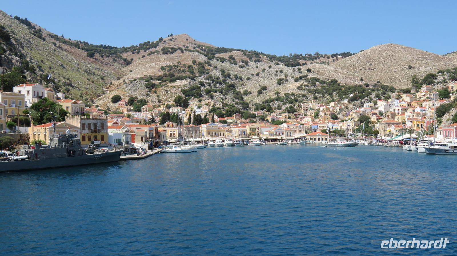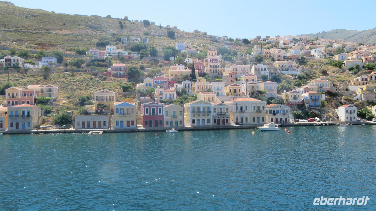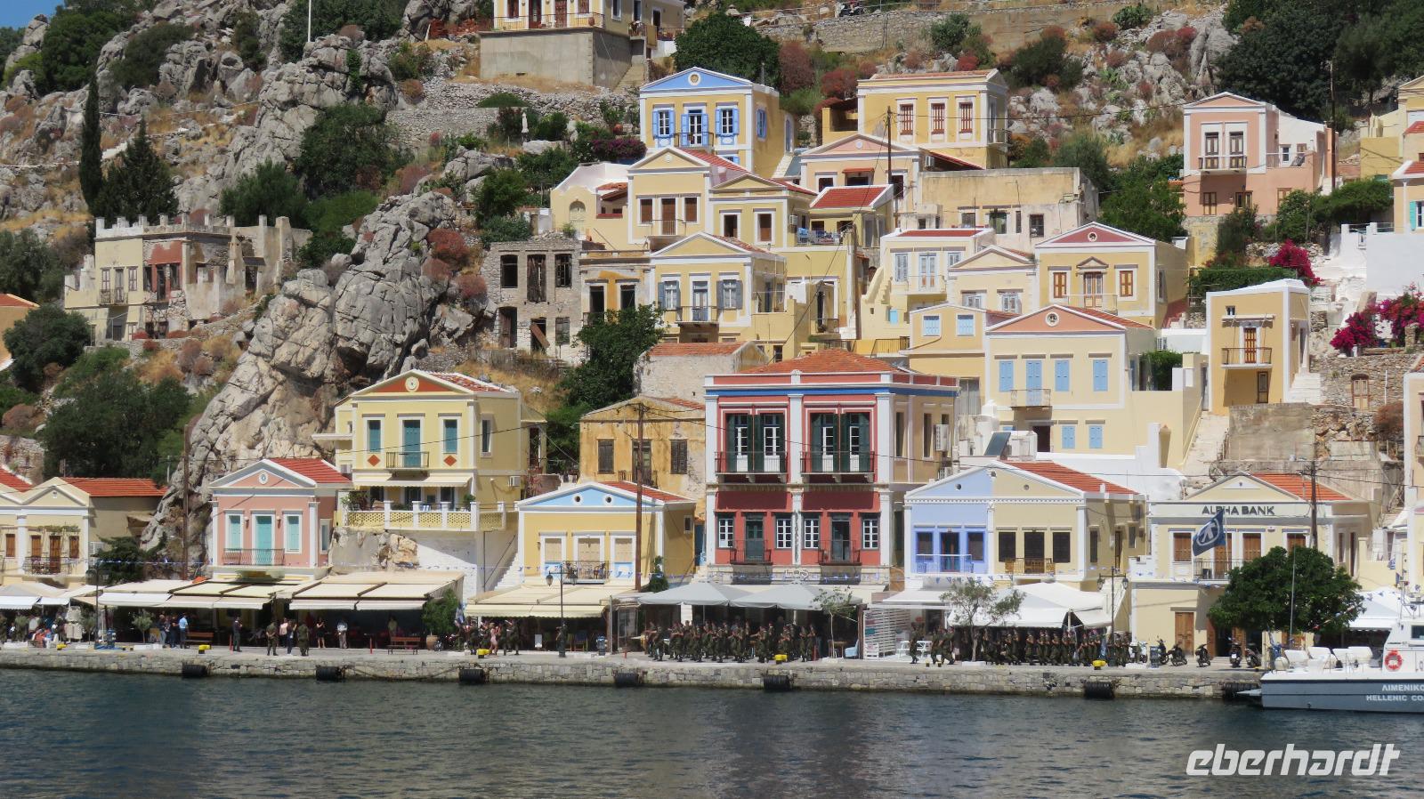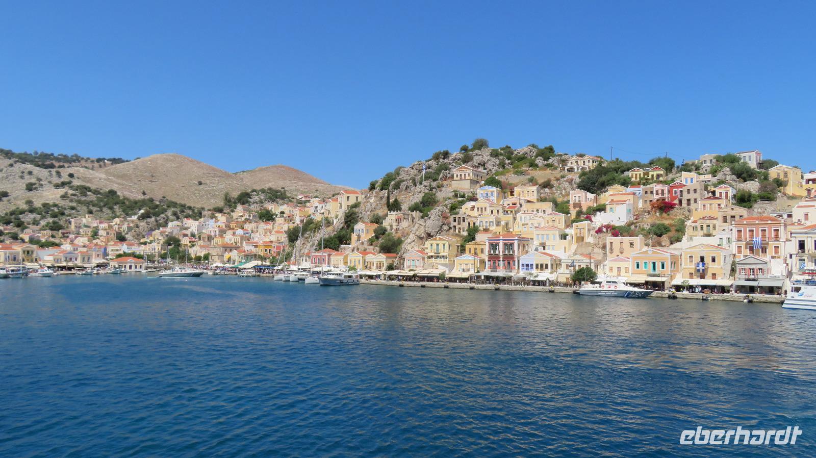 Symi ist malerisch. Die wunderschönen neoklassizistischen Häuser in ihren schönen Farben und der Hafen gefallen uns sehr.