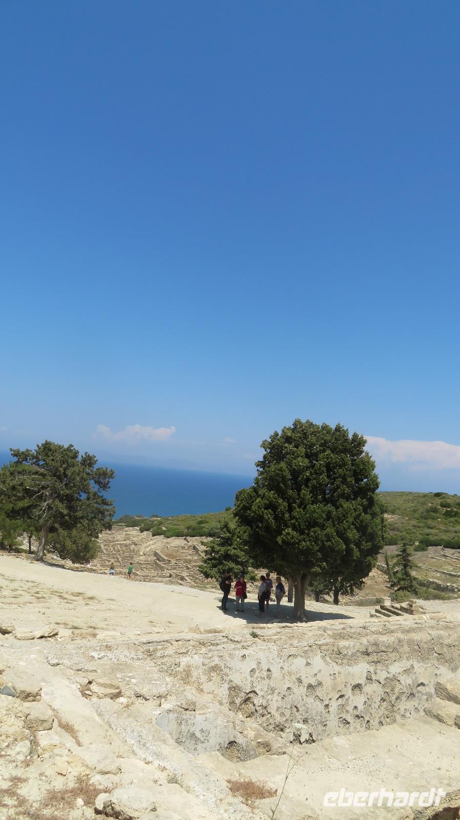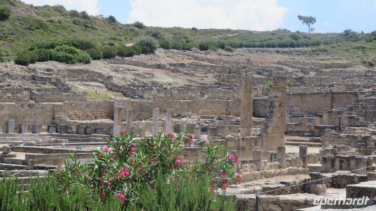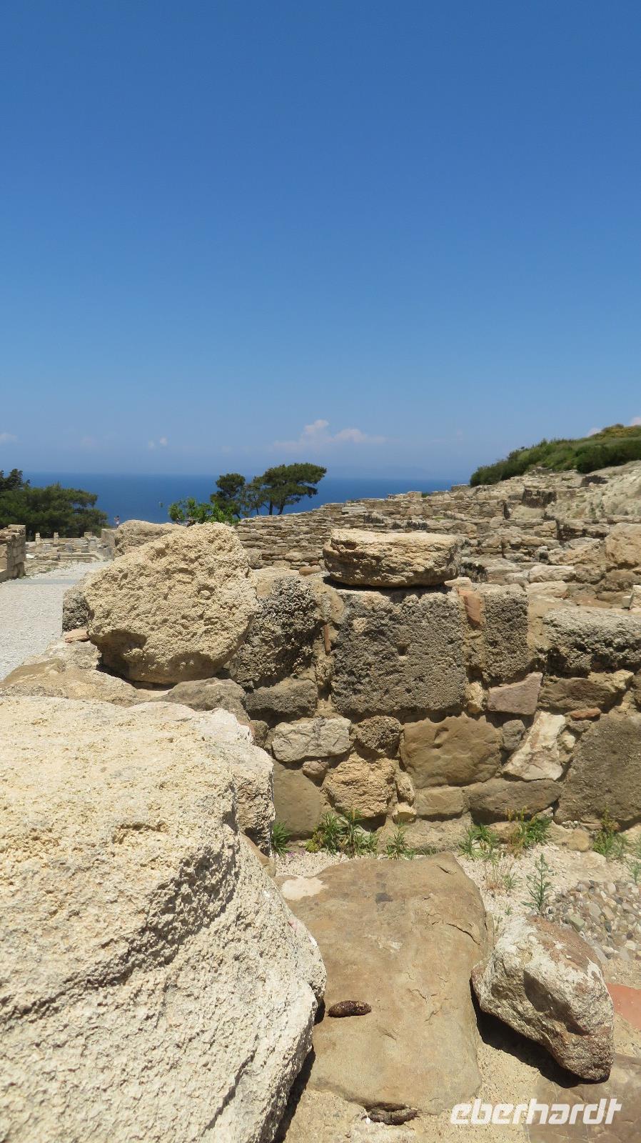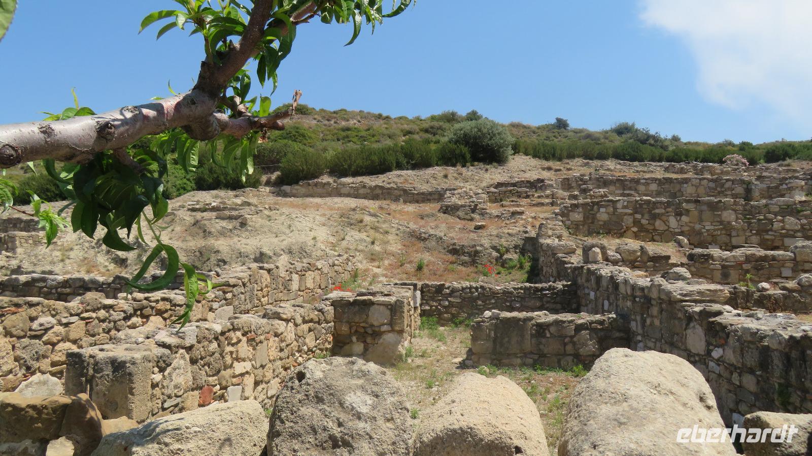Dann ging es weiter zur antiken Stadt Kamiros. Die Siedlungsreste stammen aus der Zeit 200 v. Chr. Als erstes kann man die Tempelanlagen sehen, dann kommen die Wohnbereiche. Unzählige kleine Mauerreste zeigen, wie es ausgesehen haben muss. Ganz oben befindet sich die Akropolis und die Zisterne - die gut zu erkennen ist.