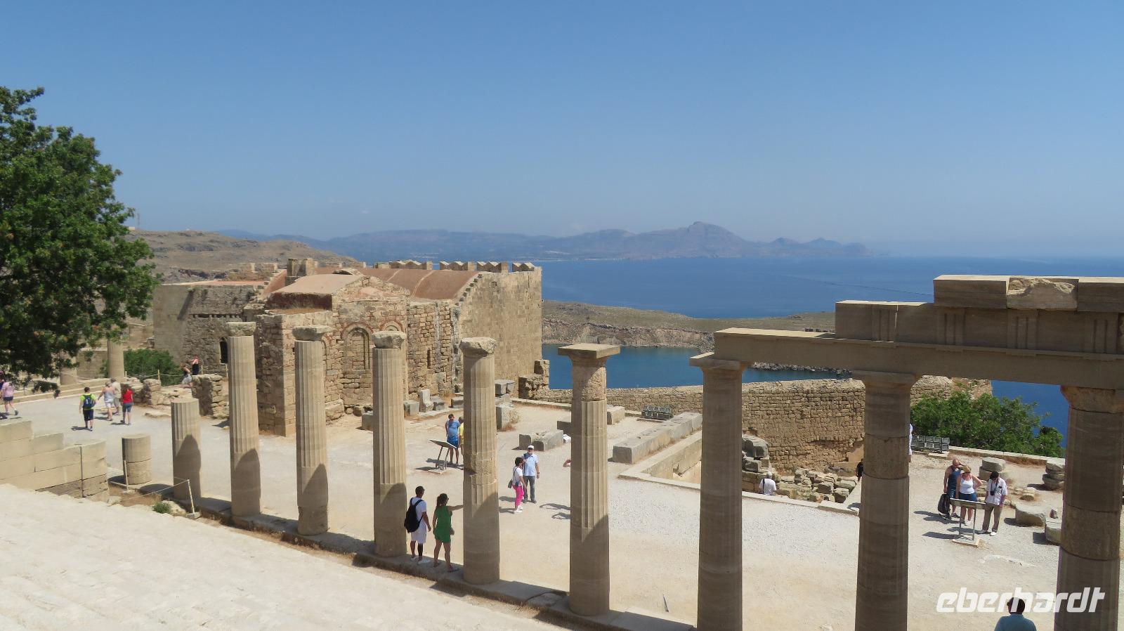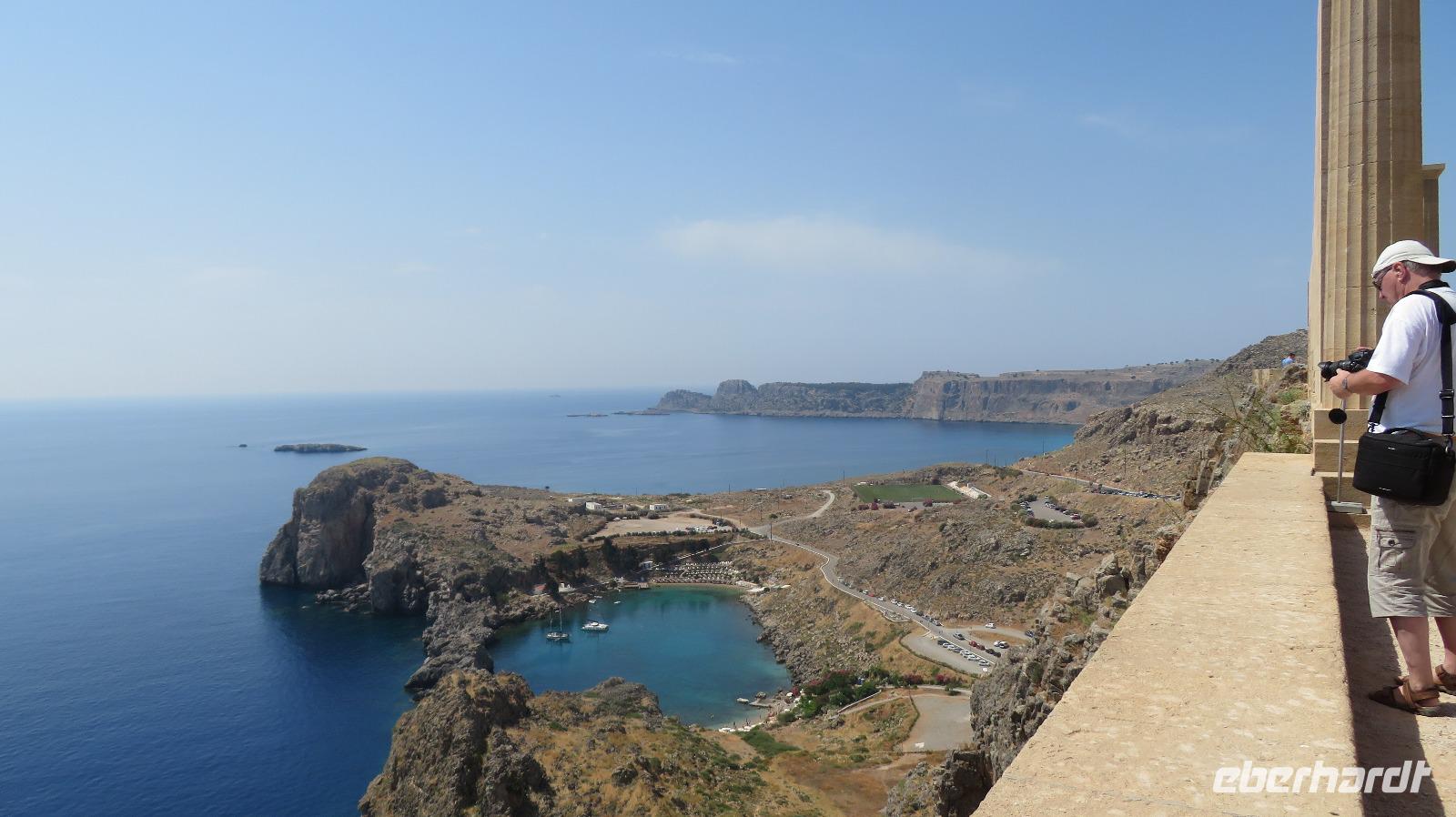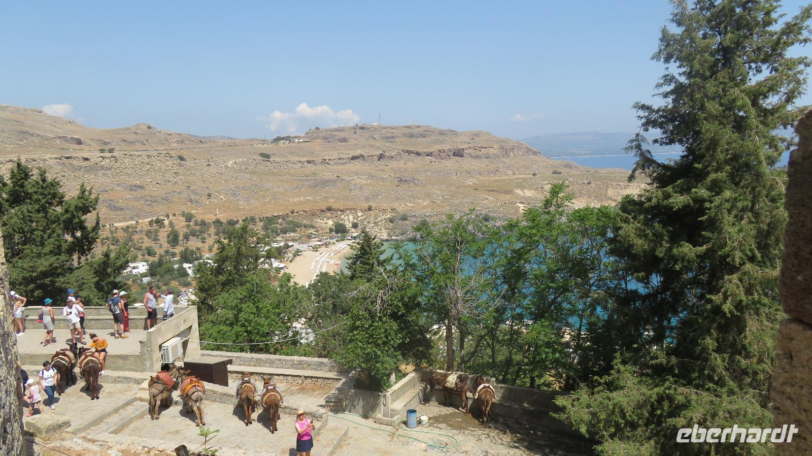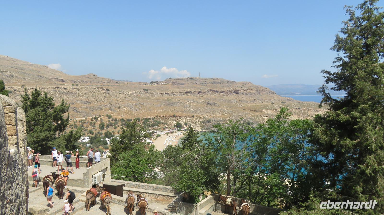 In Lindos wollen wir uns zuerst die Akropolis ansehen. Ein paar Mutige lassen sich von einem Esel hinauf bringen. Wir laufen durch die engen Gassen, vorbei an der Kirche und steigen die vielen Stufen aufwärts. Wer es bis ganz nach oben geschafft hat, wird mit einem phantastischen Blick entschädigt. Wir bestaunen die Akropolis und die Anlage. Die berühmte St. Pauls Bucht ist auch gut zu sehen.