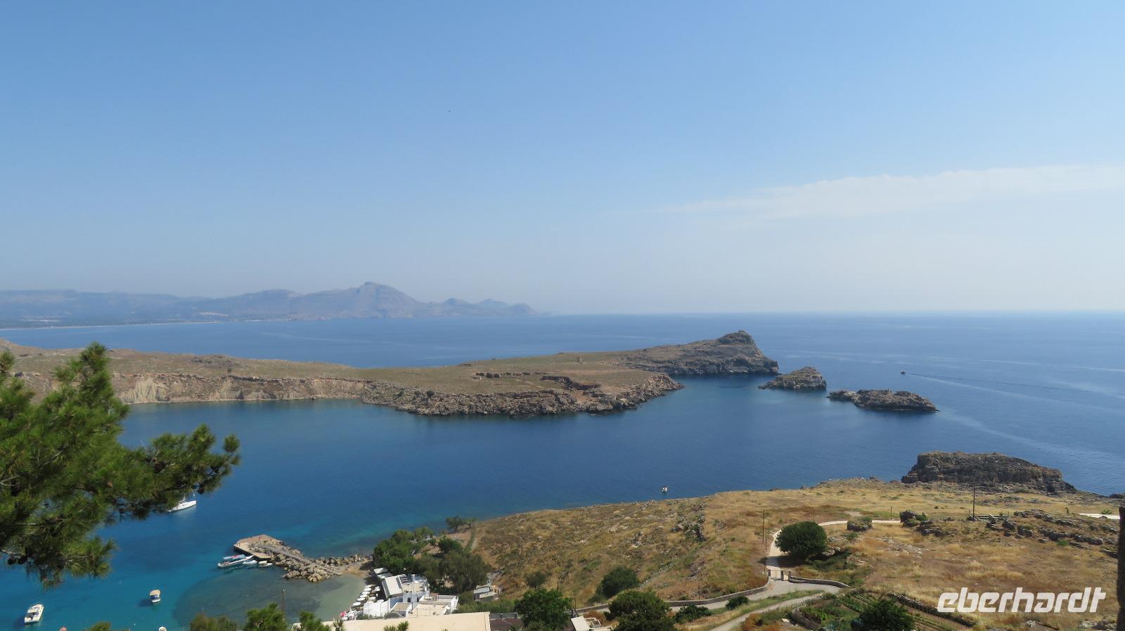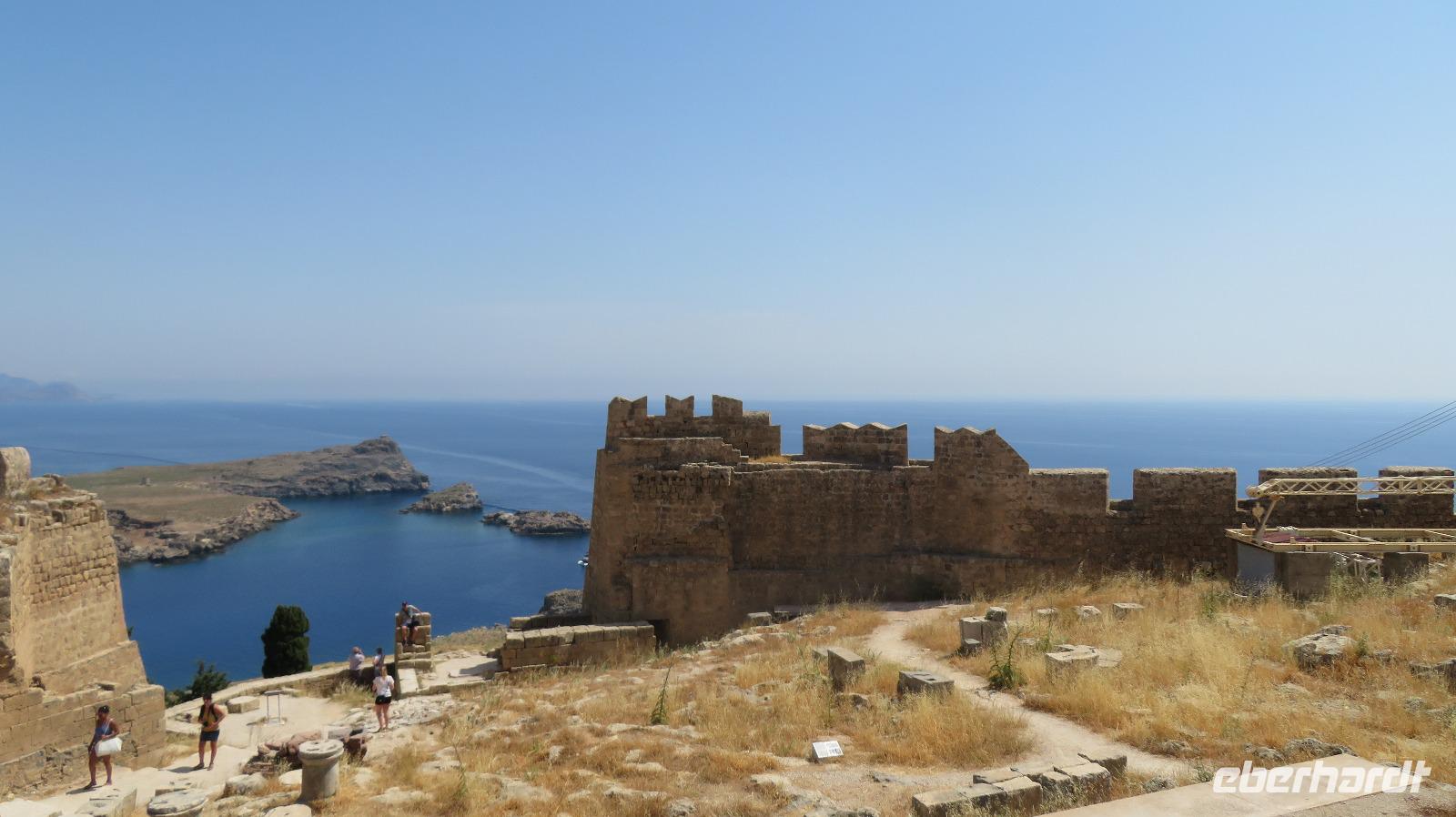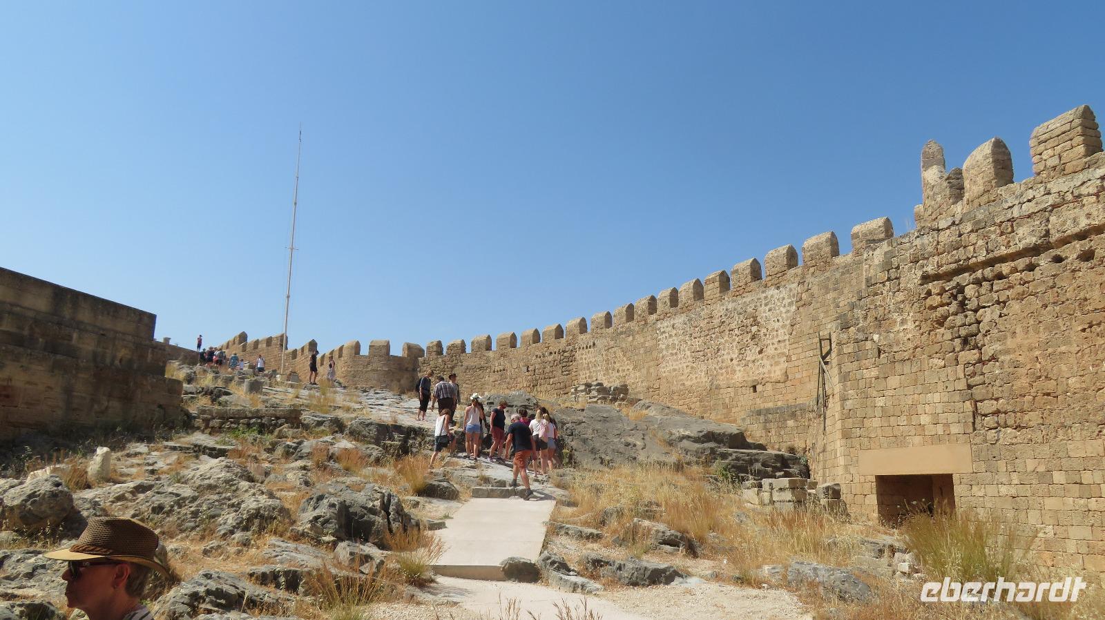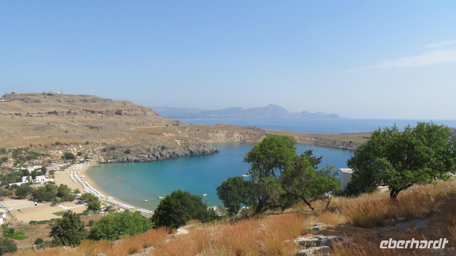 In Lindos wollen wir uns zuerst die Akropolis ansehen. Ein paar Mutige lassen sich von einem Esel hinauf bringen. Wir laufen durch die engen Gassen, vorbei an der Kirche und steigen die vielen Stufen aufwärts. Wer es bis ganz nach oben geschafft hat, wird mit einem phantastischen Blick entschädigt. Wir bestaunen die Akropolis und die Anlage. Die berühmte St. Pauls Bucht ist auch gut zu sehen.
