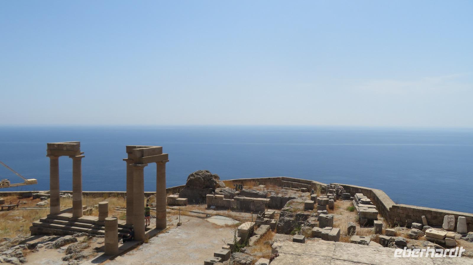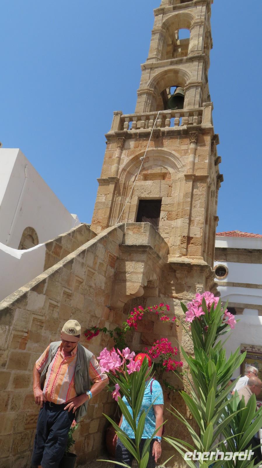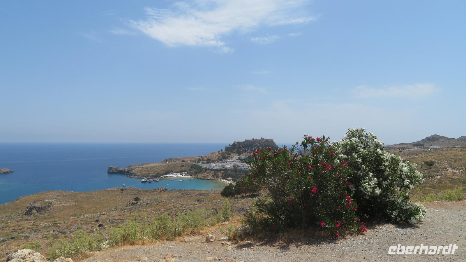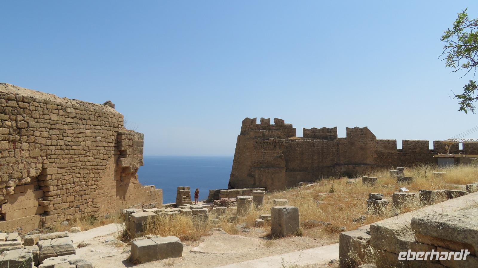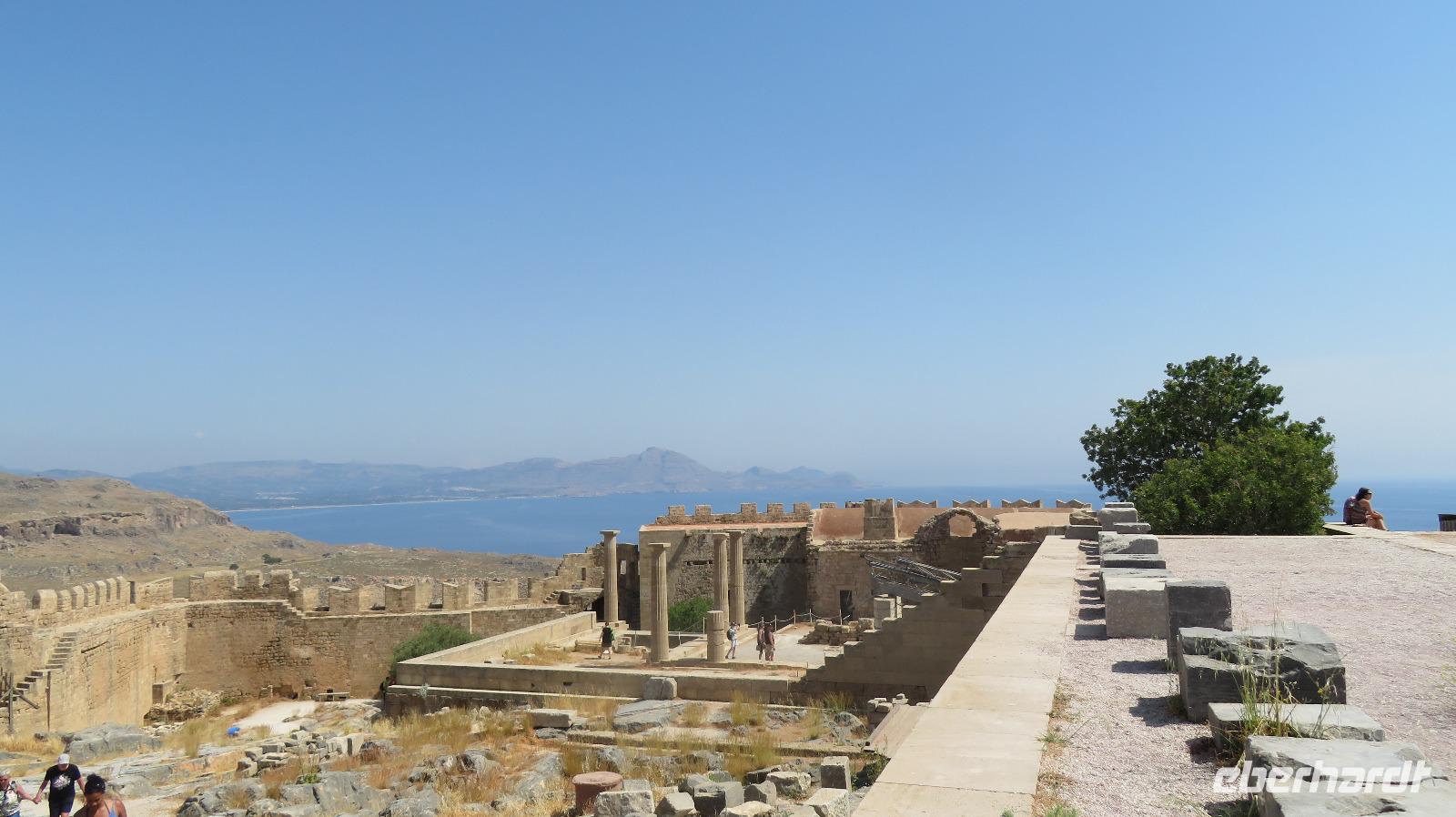 In Lindos wollen wir uns zuerst die Akropolis ansehen. Ein paar Mutige lassen sich von einem Esel hinauf bringen. Wir laufen durch die engen Gassen, vorbei an der Kirche und steigen die vielen Stufen aufwärts. Wer es bis ganz nach oben geschafft hat, wird mit einem phantastischen Blick entschädigt. Wir bestaunen die Akropolis und die Anlage. Die berühmte St. Pauls Bucht ist auch gut zu sehen.