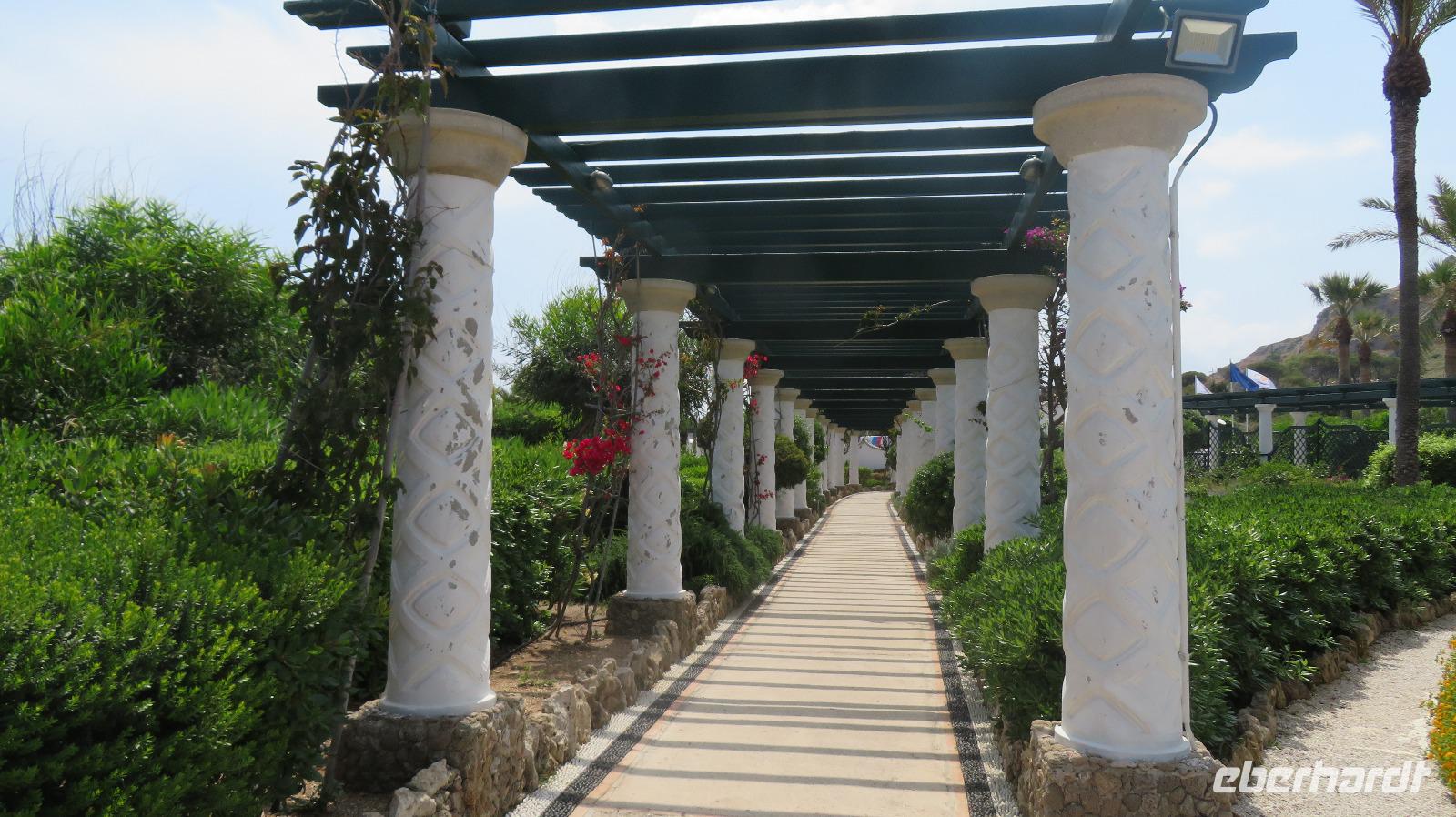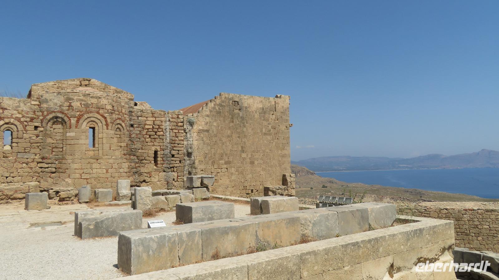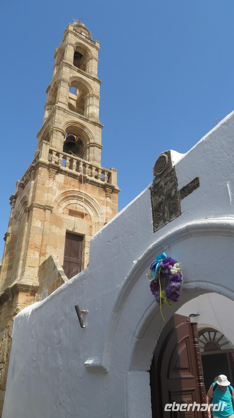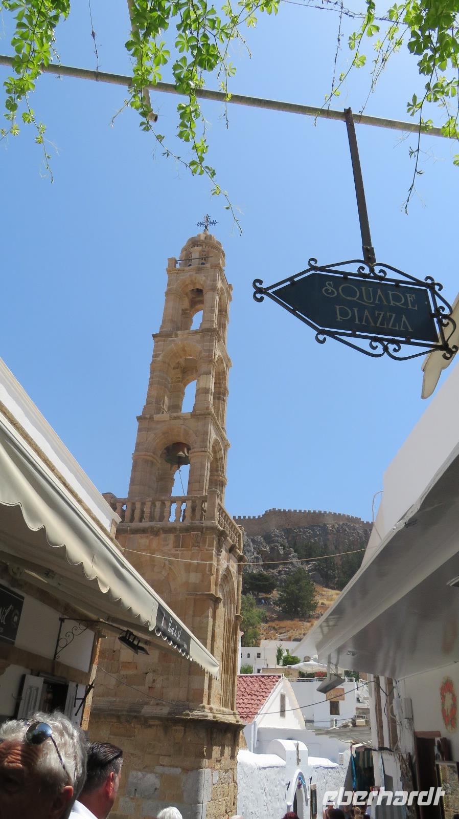 In Lindos wollen wir uns zuerst die Akropolis ansehen. Ein paar Mutige lassen sich von einem Esel hinauf bringen. Wir laufen durch die engen Gassen, vorbei an der Kirche und steigen die vielen Stufen aufwärts. Wer es bis ganz nach oben geschafft hat, wird mit einem phantastischen Blick entschädigt. Wir bestaunen die Akropolis und die Anlage. Die berühmte St. Pauls Bucht ist auch gut zu sehen.