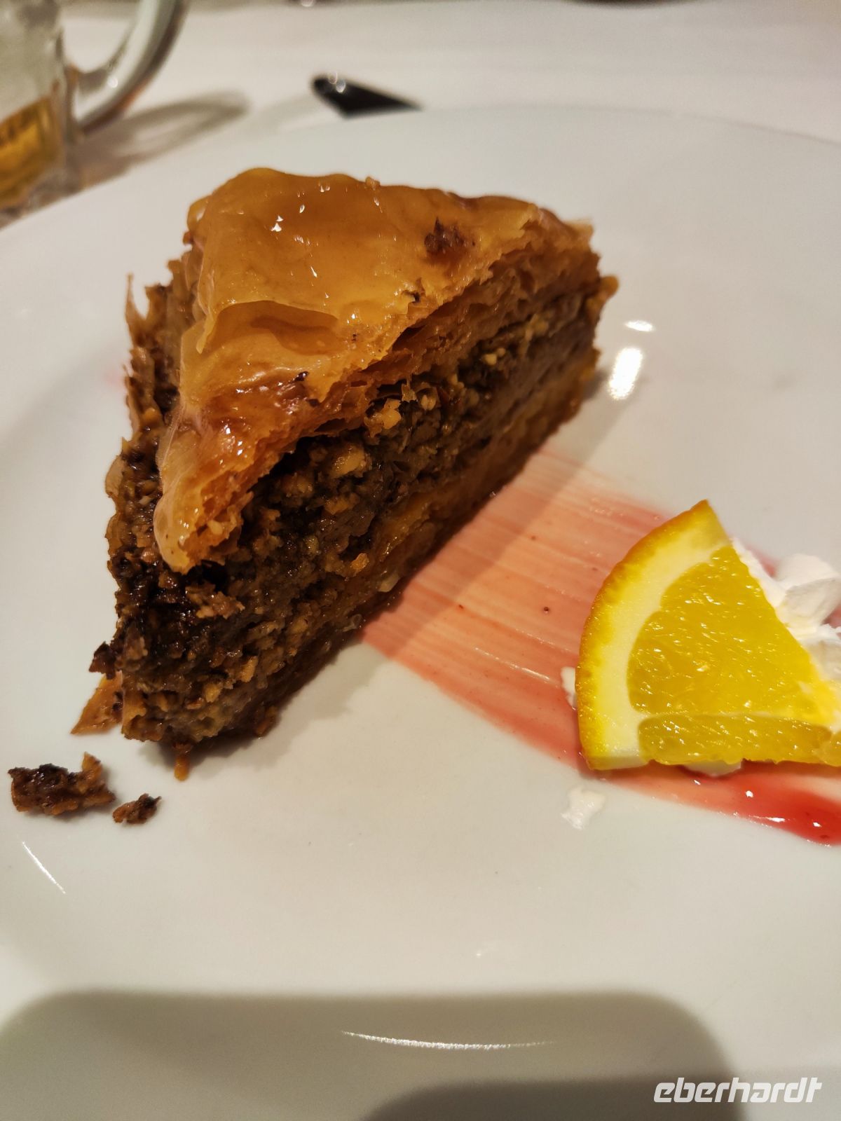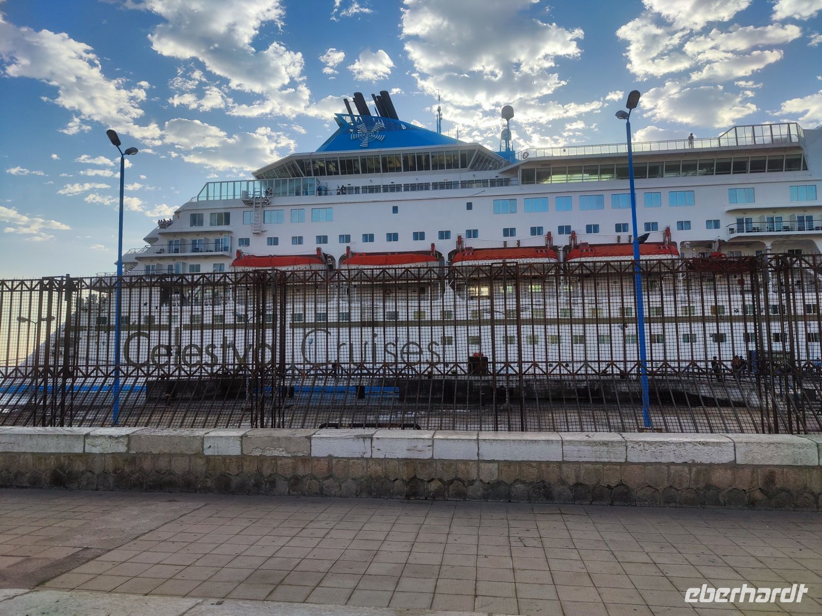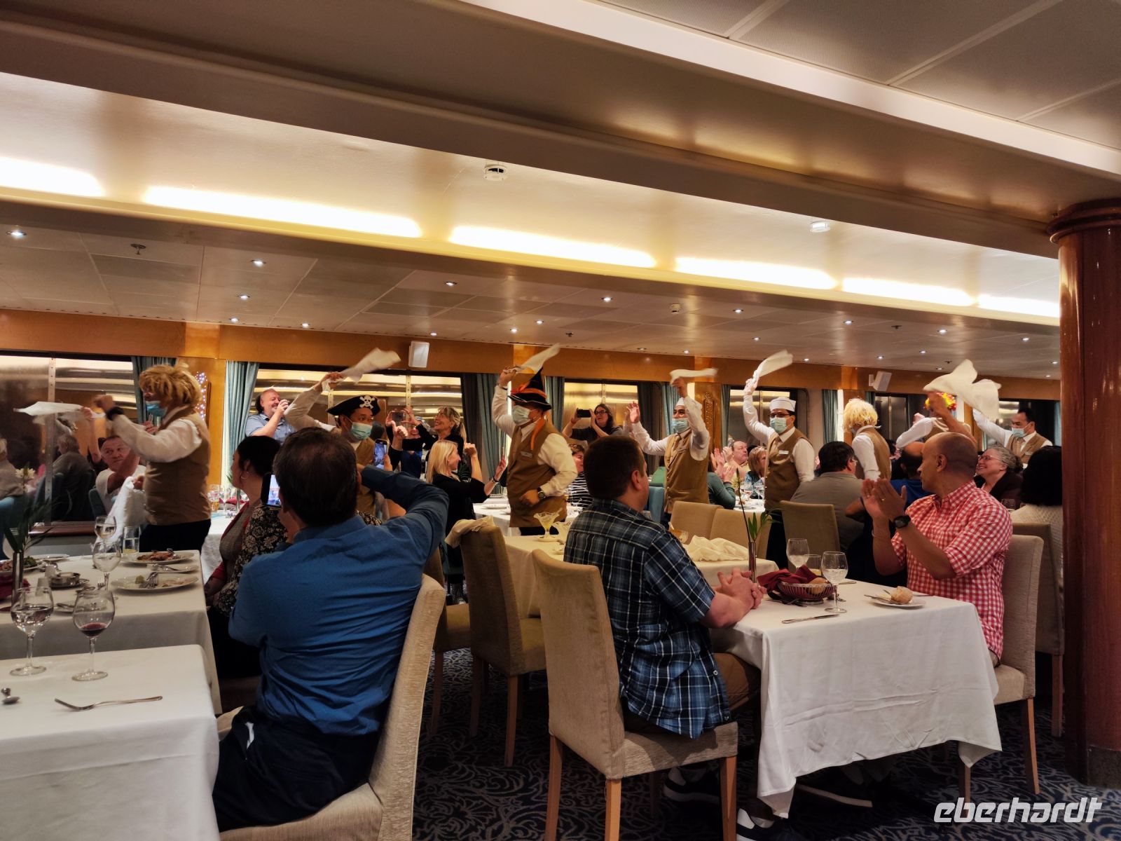 Den heutigen Tag verbrachten wir auf hoher See und genossen die Annehmlichkeiten des Schiffes. Bei gutem Essen und Animation fühlten wir uns sehr wohl am Bord unseres Kreuzfahrtschiffes Celestyal Crystal. Das Schiff hat eine Länge von 162 Metern und eine Breite von 25,64 Metern. Bei einem Tiefgang von max. 5,92 Metern fahren wir mit max 18 Knoten durch das östliche Mittelmeer. Auf den 10 Decks finden 1200 Passagiere und 400 Crew-Mitglieder Platz finden. Das Schiff wurde 1980 im Finnischen Turku gebaut und fährt unter der Maltesischer Flagge. Unser Abendessen nahmen wir diesmal auf Deck 8 im a la Carte Restaurant ein, was auch für die nächsten Tage unsere Wahl werden sollte. Am Abend erfreuten wir uns über eine tolle Cabaret Show und anschließender Vorstellung des Kapitäns und seiner engsten Offizieren. Zum Schluss konnten wir mit einen Sekt anstoßen. Auf Ihr Wohl Herr Kapitän.