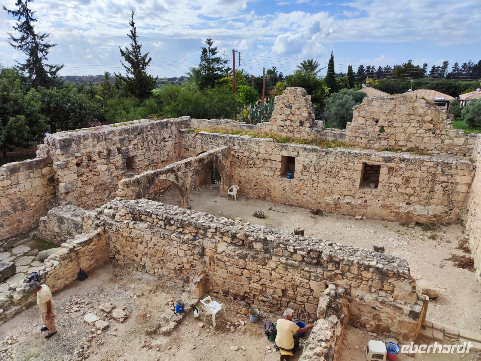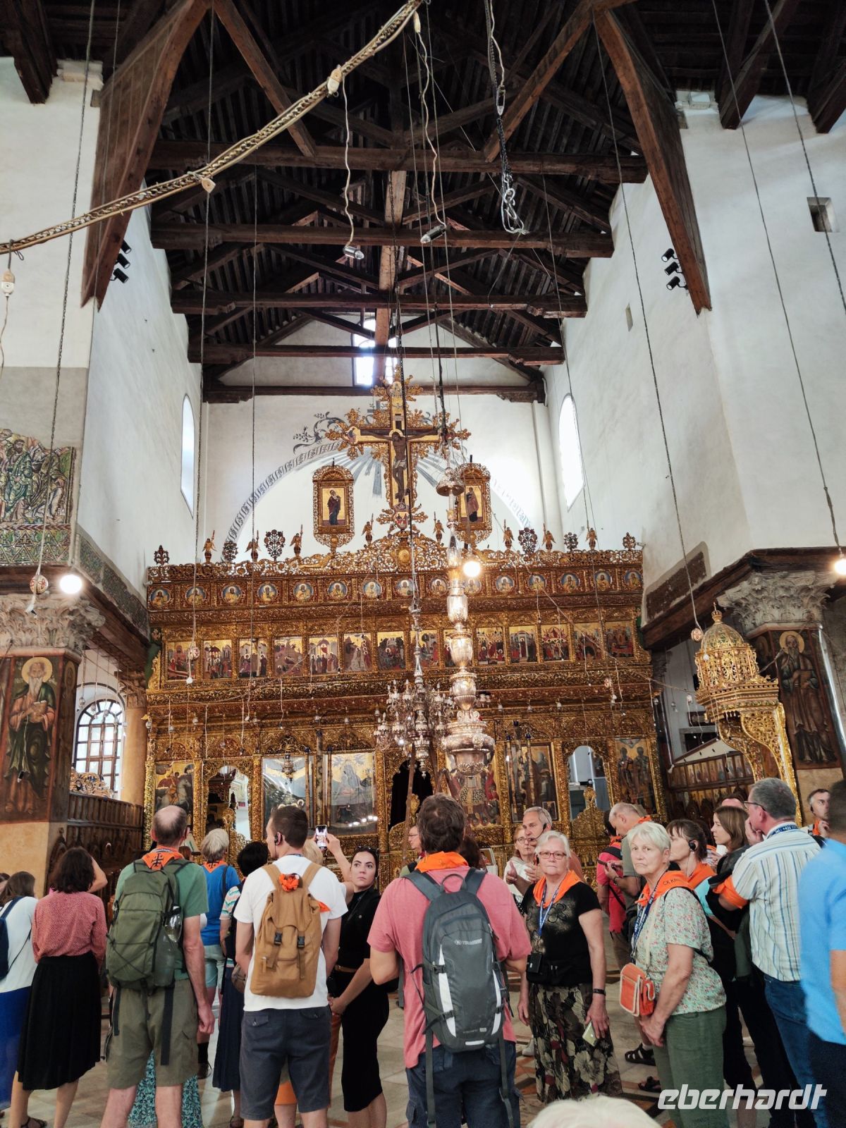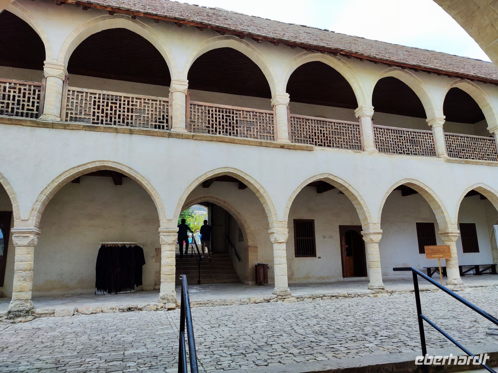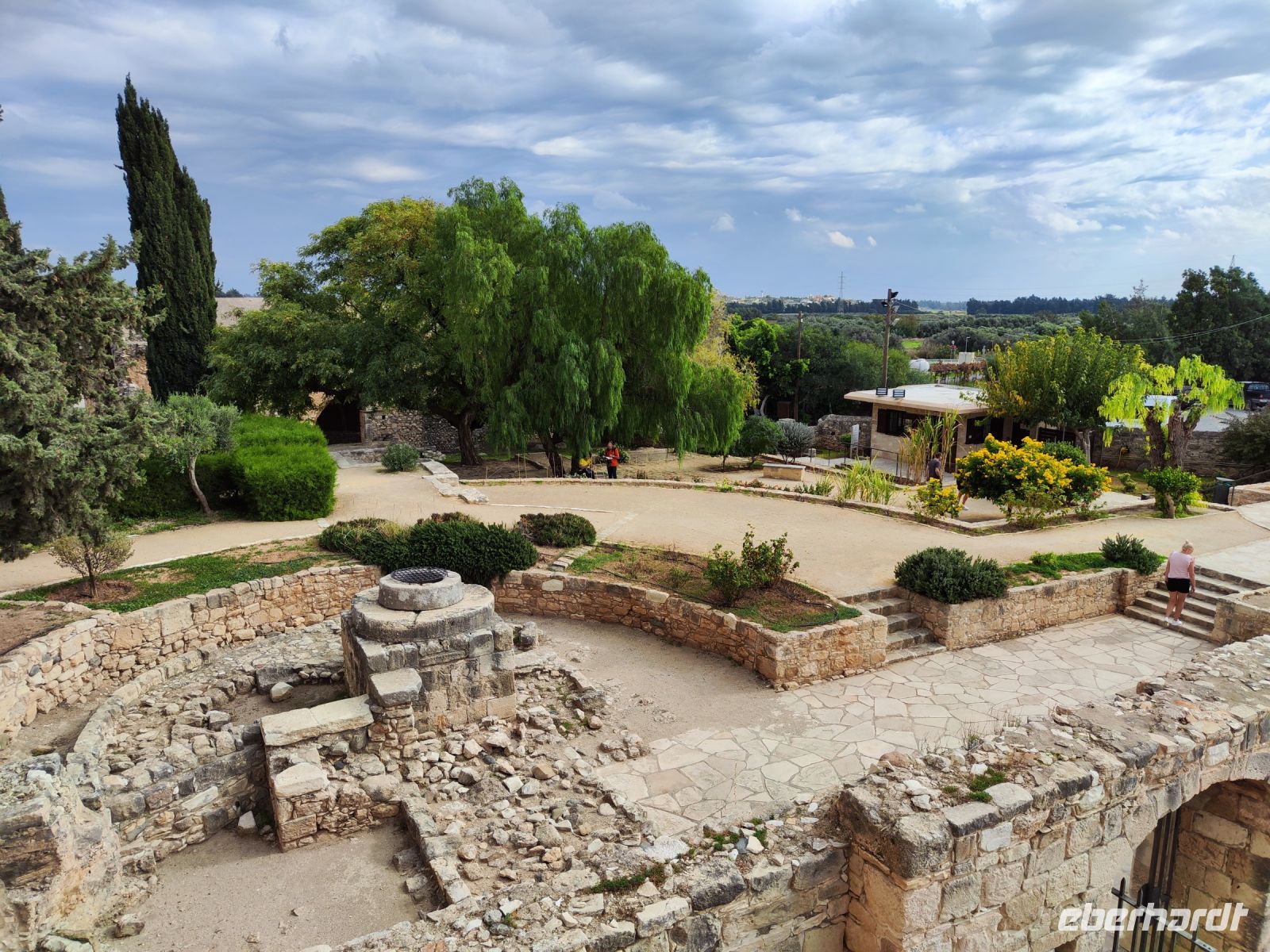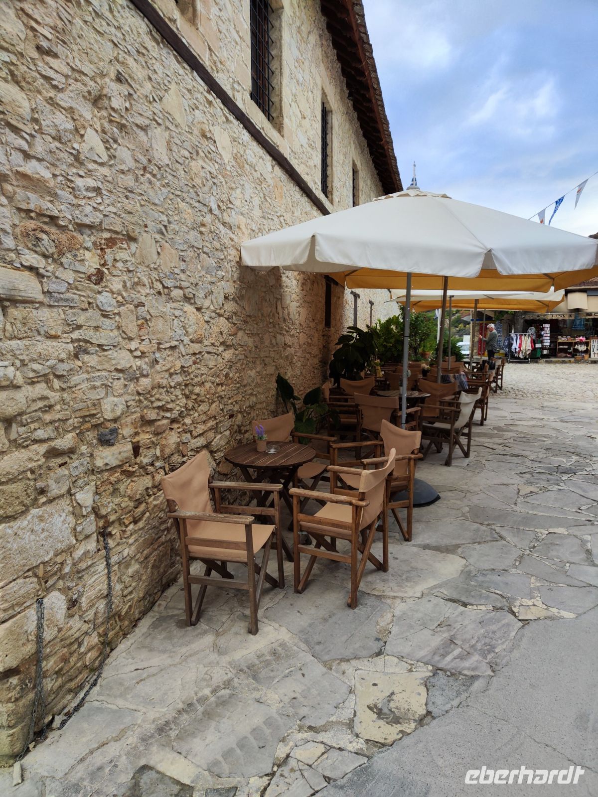 Unser heutiger Tag startete entspannter als die vorherigen Tage. Nach einem ausgiebigen Frühstück gingen wir um die Mittagszeit von Bord. Im Hafen von Limassol erwartete uns schon unser toller örtliche Reiseleiter Antonis. Limassol ist nach der Hauptstadt Nikosia die zweitgrößte Stadt des Landes. Limassol war allerdings nicht unser Ausflugsziel, sondern wir wollten entschleunigt das Hinterland kennen lernen. Unser erster Anlaufpunkt war die mittelalterliche Burg Kolossi, die im 13. Jahrhundert entstanden ist. Die Geschichte der Burg Kolossi ist eng mit der Geschichte des Johanniter-Ordens verbunden. Nach der Belagerung von Akkon in Israel mussten die Ritter des Ordens des Heiligen Johannes von Jerusalem aus ihrer Heimat fliegen. Die fleißigen Johanniter erbauten die Burg Kolossi als Zufluchtsort und lebten hier über hunderte Jahre, bis sie nach Rhodos weiterzogen. Berühmt wurde auch ihr Dessertwein, den sie als süßen Wein kelterten und als Vin de Commandarie exportierten. Nach heutzutage gilt der Commandaria als typischer Dessertwein für Zypern, den wir auch gemeinsam mit Antonis verkosteten. Weiter führte uns unsere Route in das Bergland. Im kleinen Dörfchen Vouni, wo ca. 30 Menschen lebten, wurden wir zu einem traditionellen zypriotischen Meze-Essen abseits der Touristen-Routen eingeladen. Das Meze-Essen kann man am ehesten mit einem Tapas-Essen vergleichen. Uns wurden viele verschiedene Vorspeise serviert und wir konnten uns einen Eindruck über die kulinarischen Spezialitäten Zypern machen. Gesättigt führten wir unseren Ausflug fort und besuchten das Bergdorf Omodos im Troodos Gebirge. Das hübsche Winzerdorf bezauberte uns mit seinen schmalen Gassen und hübschen Läden. Gemeinsam mit Antonis besichtigten wir noch eine traditionelle Weinpresse und das Kloster Timios Stavros, das Kloster zum Heiligen Kreuz. Abschließen fuhren wir zurück nach Limossol und lauschten Antonis Geschichten. Ach ja, die richtigen Antworten, die man in keinem Reiseführer nachlesen kann sind übrigens: 11 Menschen plus 2 Rinder, Salz und Zitrone zum Zähneputzen und Zitrone und Kaffeepulver bei Magenproblemen.