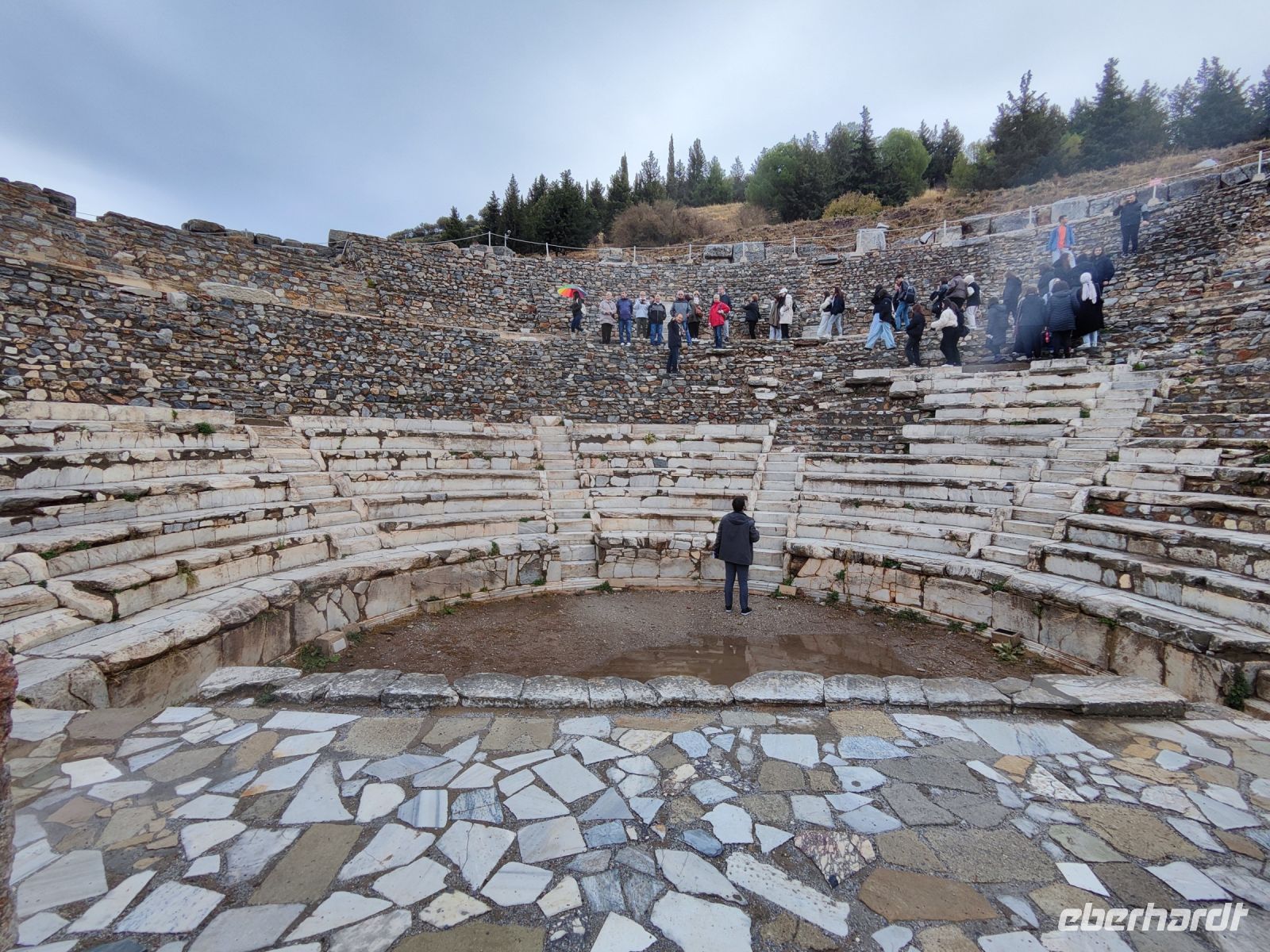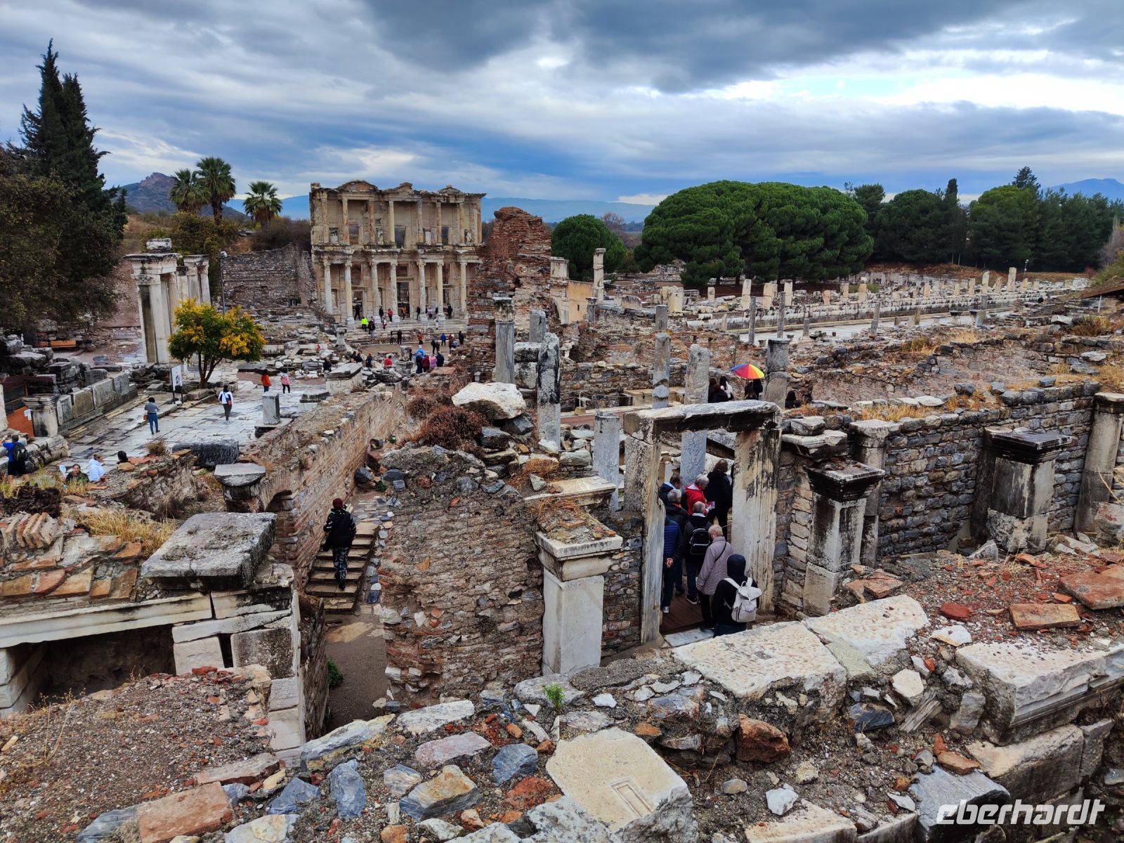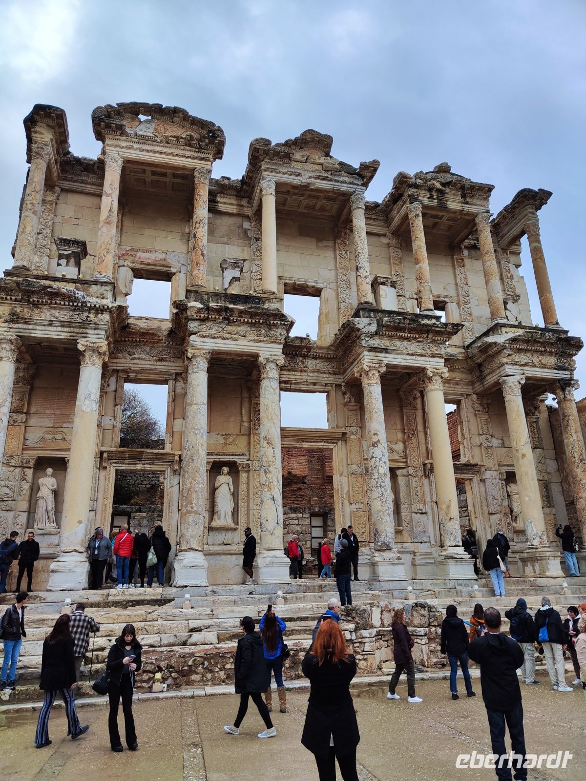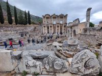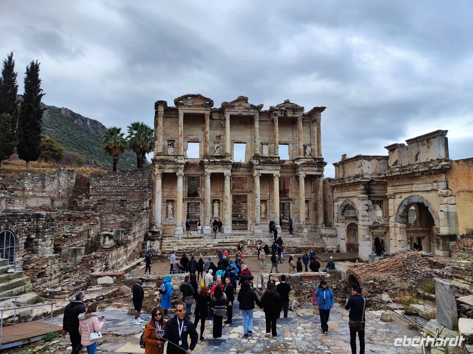 Ein neuer Tag, ein neues Reiseziel. Allerdings machten uns zunächst das Wetter in der Türkei einen Strich durch die Rechnung. Bei unserer Ankunft in Kusadasi stürmte und regnete es. Unsere kompetenten Ansprechpartner auf dem Boot beschlossen glücklicherweise kurzfristig den Anflug auf eine Stunde zu verschieben und tatsächlich hörte es später auf zu regnen. Unser Ziel: Die nächste antike Stadt zu erobern: Ephesus! Gemeinsam mit unserem herausragenden örtlichen Reiseleiter Yücel besuchten wir die antike Ausgrabungsstätte Ephesos oder Efes (wie das Bier :-) ). Die gewaltige Ausgrabungsstätte bot sehr viel zu sehen und ließ uns erahnen, welche Pracht hier früher geherrscht haben musste. Seit dem Jahr 2015 gehört Ephesos zum UNSECO Kulturweltwerbe und das vollkommen zu Recht. Die antike Hafenstadt Ephesos galt zu ihren Hochzeiten als das bedeutendste Handelszentrum des Mittelmeerraums. Über den Zeitraum von mehreren Jahrhunderten befand sich Ephesos unter dem Einfluss von verschiedenen Herrschern. Früher war es eine Stätte des Glaubens der Göttin Kybele und dem Artemiskult, später eine der wichtigsten Stätten des Christentums. Besonders eindrucksvoll war das große Theater, die Marmorstraße, die untere Agora (Marktplatz), der Hadrianstempel und die Bibliothek des Celsus. Die Bibliothek war mit seinen bunten Fassaden zur Hochphase von Ephesos nur einem schönen Gebäude unter vielen. Heutzutage ist die Bibliothek das absolute Aushängeschild von Ephesos. Erbaut wurde die Bibliothek 135 n. Chr. von einem Herrn Aquila zur Erinnerung an seinen Vater Celsus. Dieser war zu Lebzeiten Statthalter der Provinz Asia. Österreichischen Archäologen gelang es in den siebziger Jahren aus 850 Trümmerteilen zumindest die Fassade wieder in einen fast originalen Status zu versetzen. Eine eindrucksvolle Erinnerung an die Vergangenheit. Im großen Theater aus dem 3. Jahrhundert haben früher bis zu 25.000 Zuschauer Platz gefunden und auch heute noch werden Freiluftkonzerte hier gespielt. Nach dem beeindruckten Ausflug in die Vergangenheit, stoppten wir noch kurz an einer Leder-Fabrik, bevor wir zurück auf Schiff fuhren. Hier hatten wir den Nachmittag zur freien Verfügung und konnten in Kusadasi noch letzte Shopping-Besorgungen erledigen. Am Abend speisten wir zum letzten Mal in unserem liebgewonnenen Restaurant und wurden von der Crew mit einer kleinen Tanzeinlage überrascht. Gemütlich ließen wir den letzten Abend an Bord bei einem Getränk ausklingen.