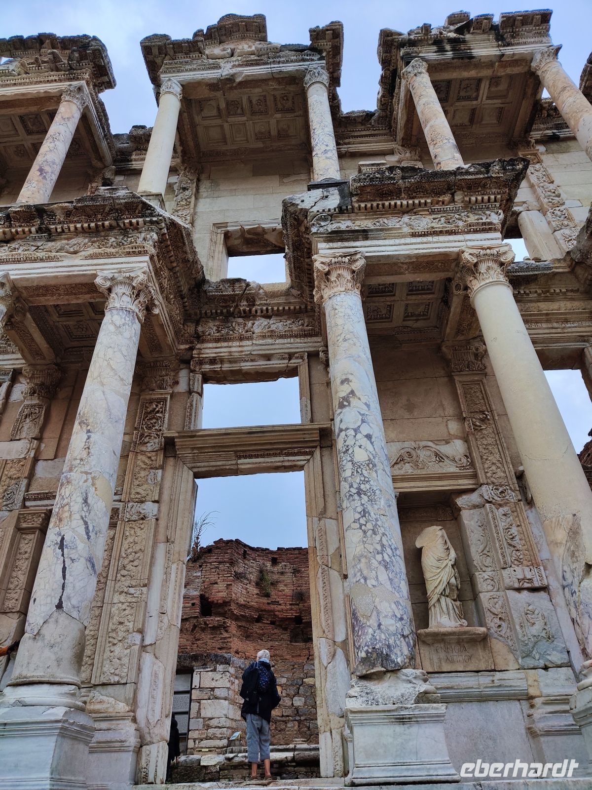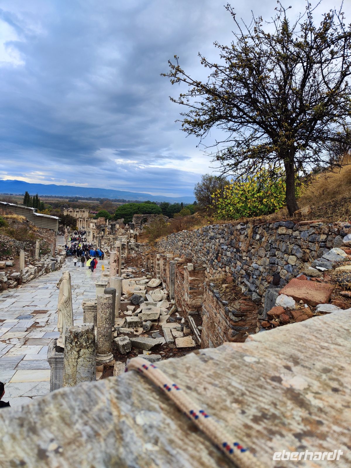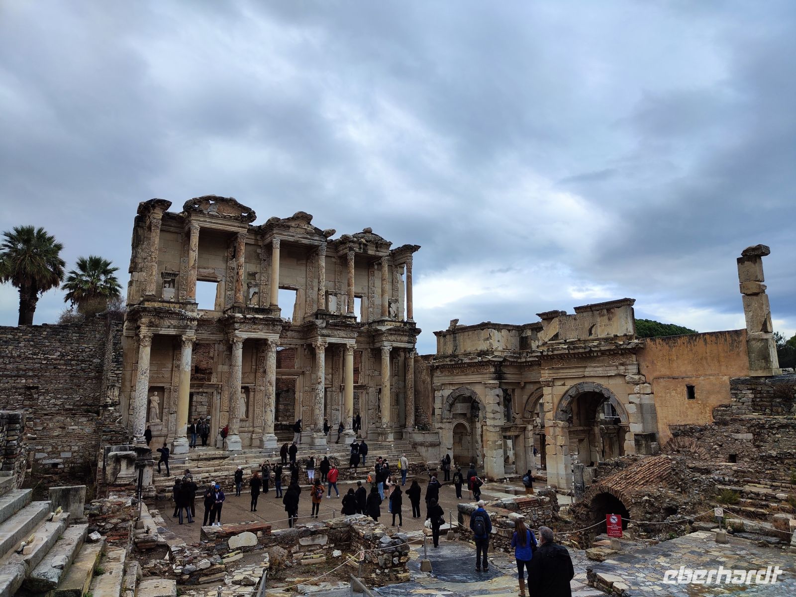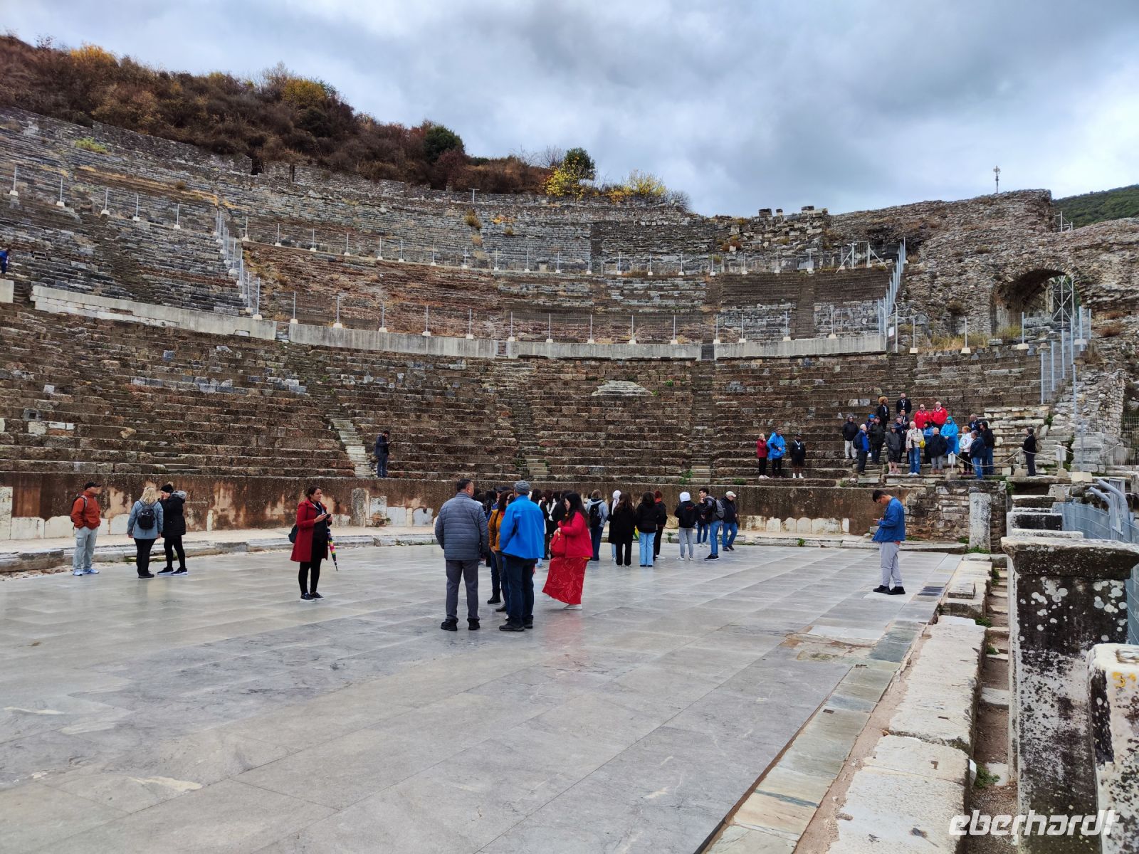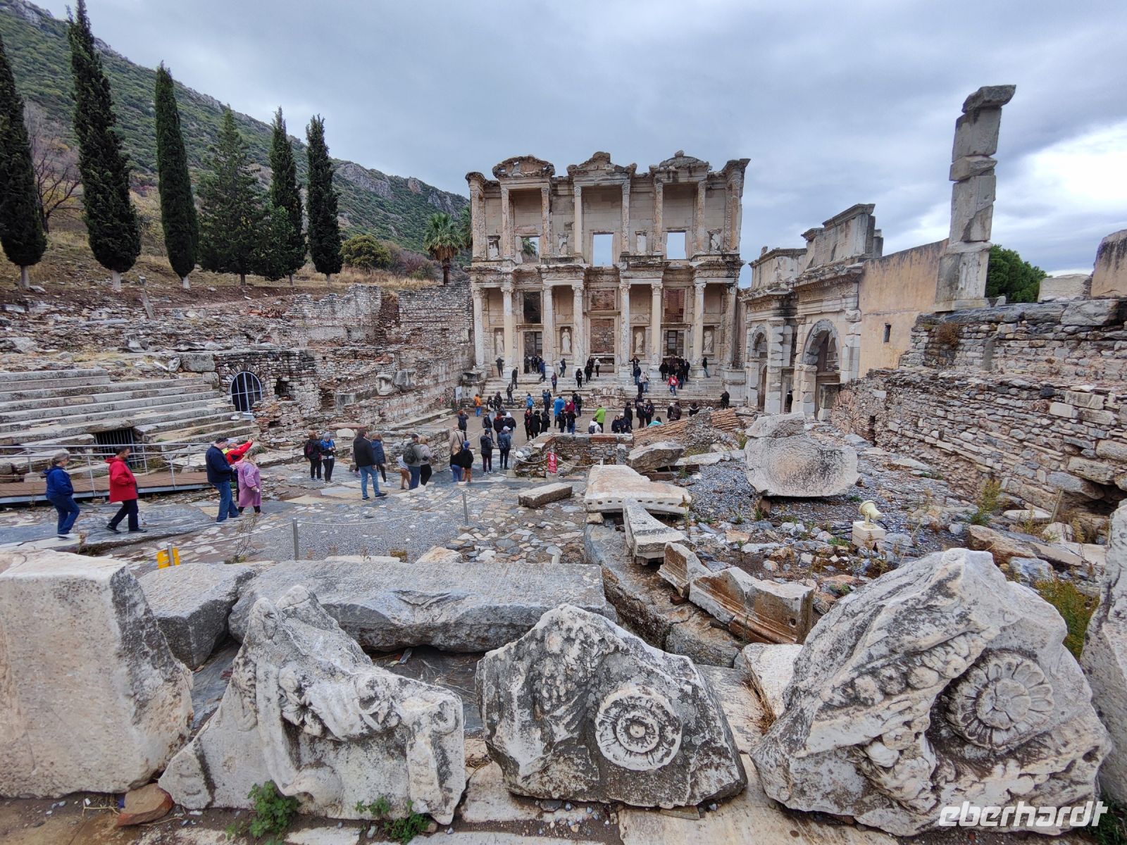 Ein neuer Tag, ein neues Reiseziel. Allerdings machten uns zunächst das Wetter in der Türkei einen Strich durch die Rechnung. Bei unserer Ankunft in Kusadasi stürmte und regnete es. Unsere kompetenten Ansprechpartner auf dem Boot beschlossen glücklicherweise kurzfristig den Anflug auf eine Stunde zu verschieben und tatsächlich hörte es später auf zu regnen. Unser Ziel: Die nächste antike Stadt zu erobern: Ephesus! Gemeinsam mit unserem herausragenden örtlichen Reiseleiter Yücel besuchten wir die antike Ausgrabungsstätte Ephesos oder Efes (wie das Bier :-) ). Die gewaltige Ausgrabungsstätte bot sehr viel zu sehen und ließ uns erahnen, welche Pracht hier früher geherrscht haben musste. Seit dem Jahr 2015 gehört Ephesos zum UNSECO Kulturweltwerbe und das vollkommen zu Recht. Die antike Hafenstadt Ephesos galt zu ihren Hochzeiten als das bedeutendste Handelszentrum des Mittelmeerraums. Über den Zeitraum von mehreren Jahrhunderten befand sich Ephesos unter dem Einfluss von verschiedenen Herrschern. Früher war es eine Stätte des Glaubens der Göttin Kybele und dem Artemiskult, später eine der wichtigsten Stätten des Christentums. Besonders eindrucksvoll war das große Theater, die Marmorstraße, die untere Agora (Marktplatz), der Hadrianstempel und die Bibliothek des Celsus. Die Bibliothek war mit seinen bunten Fassaden zur Hochphase von Ephesos nur einem schönen Gebäude unter vielen. Heutzutage ist die Bibliothek das absolute Aushängeschild von Ephesos. Erbaut wurde die Bibliothek 135 n. Chr. von einem Herrn Aquila zur Erinnerung an seinen Vater Celsus. Dieser war zu Lebzeiten Statthalter der Provinz Asia. Österreichischen Archäologen gelang es in den siebziger Jahren aus 850 Trümmerteilen zumindest die Fassade wieder in einen fast originalen Status zu versetzen. Eine eindrucksvolle Erinnerung an die Vergangenheit. Im großen Theater aus dem 3. Jahrhundert haben früher bis zu 25.000 Zuschauer Platz gefunden und auch heute noch werden Freiluftkonzerte hier gespielt. Nach dem beeindruckten Ausflug in die Vergangenheit, stoppten wir noch kurz an einer Leder-Fabrik, bevor wir zurück auf Schiff fuhren. Hier hatten wir den Nachmittag zur freien Verfügung und konnten in Kusadasi noch letzte Shopping-Besorgungen erledigen. Am Abend speisten wir zum letzten Mal in unserem liebgewonnenen Restaurant und wurden von der Crew mit einer kleinen Tanzeinlage überrascht. Gemütlich ließen wir den letzten Abend an Bord bei einem Getränk ausklingen.