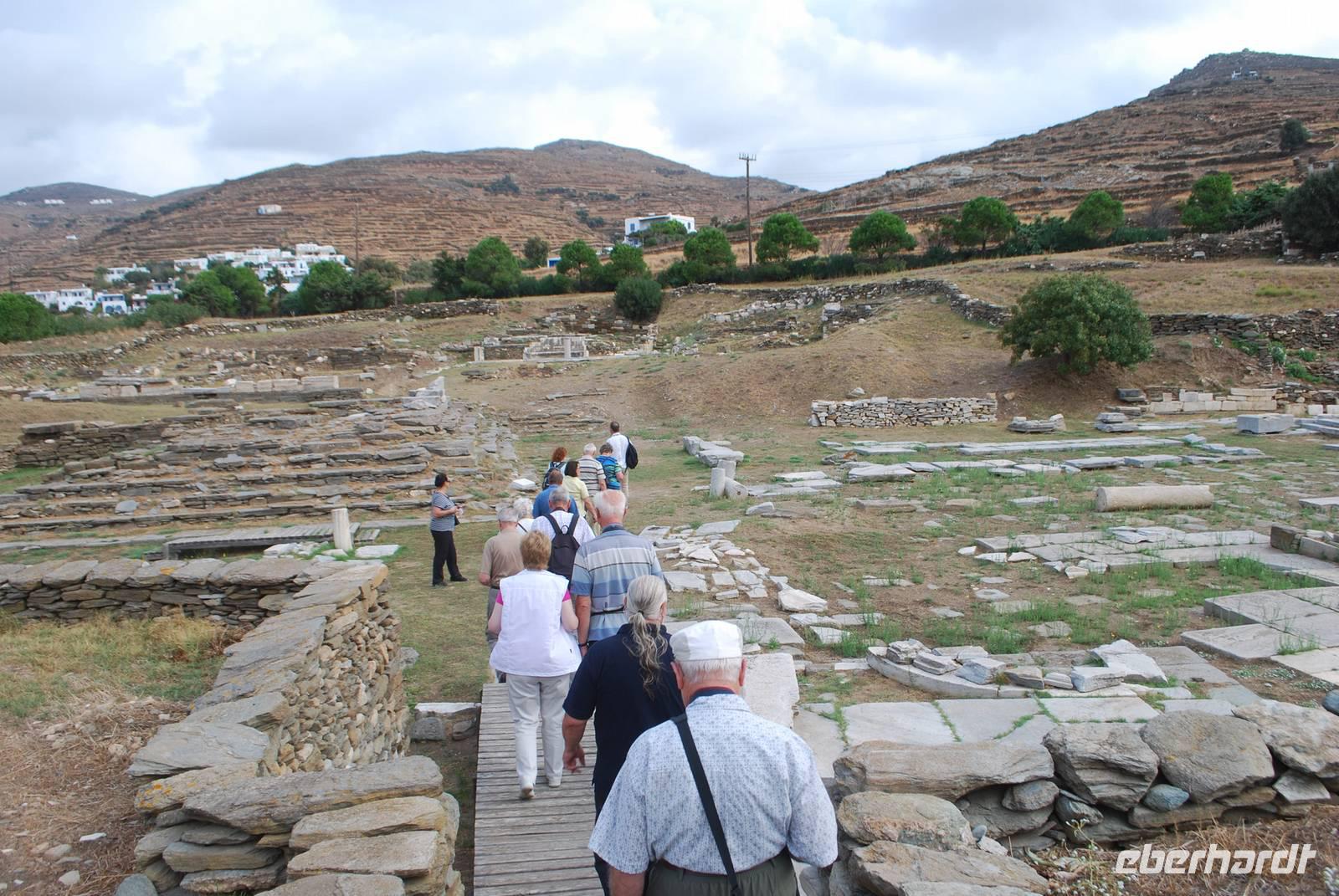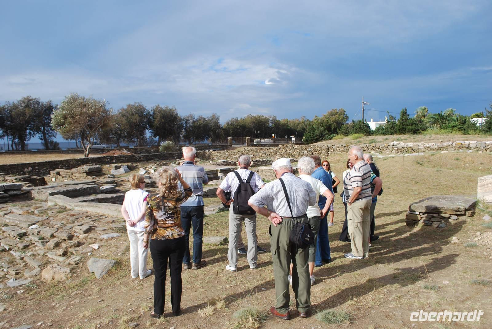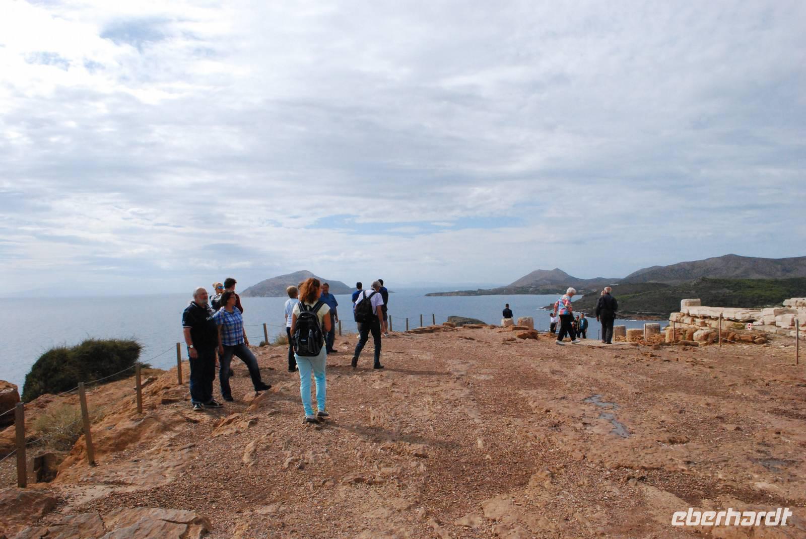 Der Tag beginnt um eine anständige Uhrzeit. Gegen 9 Uhr starten wir zu unserer Inselrundfahrt. Unserer erster Ziel hätten wir sogar zur Fuß erreichen können: das am Hotel ganz nah gelegenen Poseidon-Heiligtum. Obwohl wir schon zwei an Poseidon gewidmete Tempelanlagen besichtigt haben, erfahren wir durch Simeon, dass es doch wenige davon in Griechenland gibt. Die Besonderheit diese Anlage: sie ist nicht nur an Poseidon sondern auch an seine Gattin, Amphitrite gewidmet. Hier erfahren wir auch mehr über die Geburt der Götter: von den Chaos, zu den Titanen die von Zeus dann besiegt worden sind. Mit ihre zahlreichen Göttern, die jeder eine ganz besondere Funktion hatten, ist die griechische Religion der Antike schon relativ komplex.
