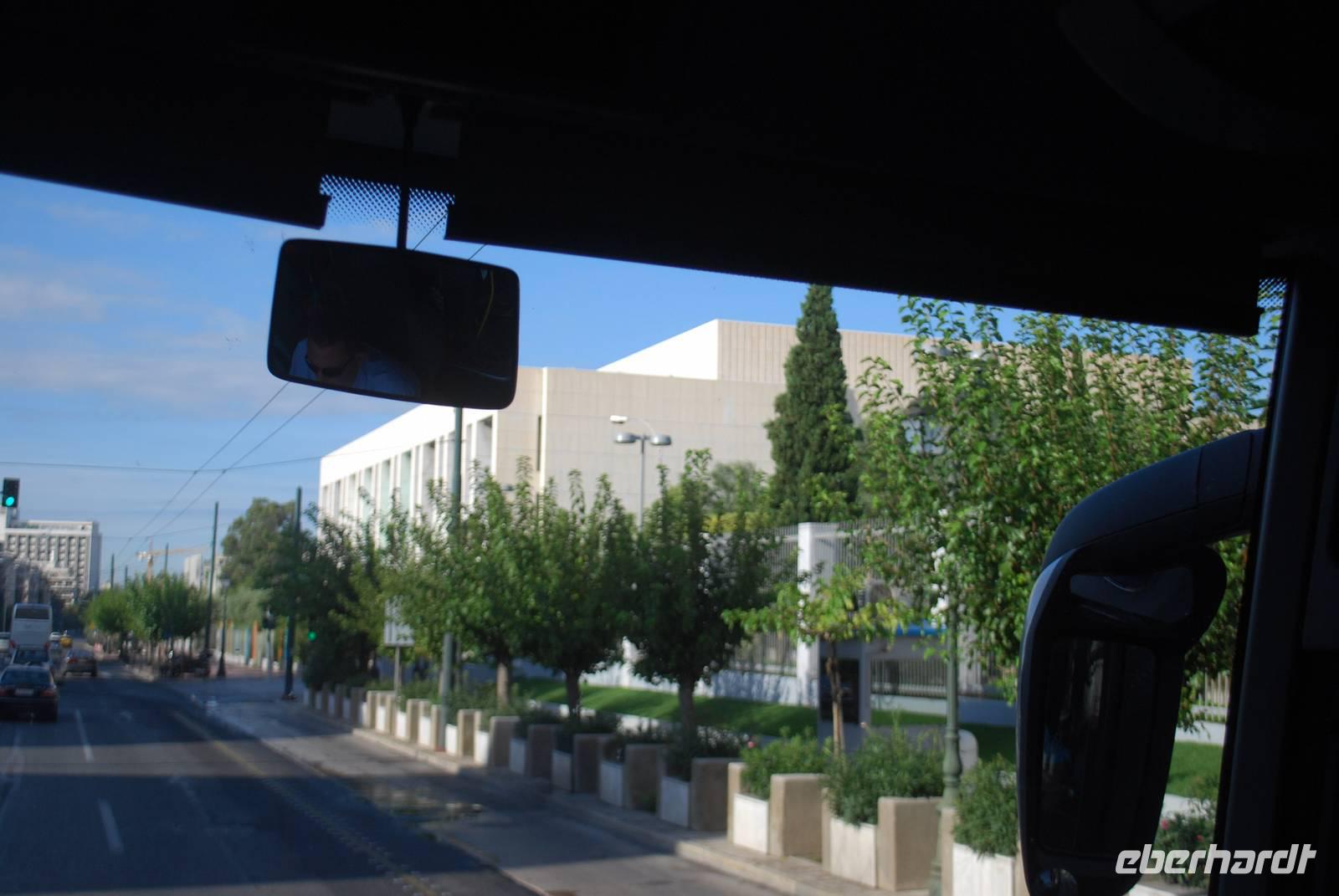 Unsere Reise beginnt sehr zeitig in Berlin, Leipzig und Dresden. Gegen 6 Uhr früh fliegen unsere Flugzeuge ab nach Frankfurt am Main, wo sich die ganze Gruppe dann zusammen trifft. Kurz vor 8 Uhr ist es auch erfolgt. Wir sind 15 insgesamt, die Reise kann richtig los gehen. Es ist mit ein bisschen Verspätung, dass wir Deutschland verlassen und uns Richtung Südosten begeben. Am frühen Nachmittag, unter schlechtem Wetter - glücklicherweise hatte es schon aufgehört zu regnen - kommen wir in die Hauptstadt Griechenland an: Athen. Simeon ist schon da und wartet bereits auf uns mit unserem Bus des Tages. Sobald das Gepäck im Bus ist, fahren wir los nach Süden.