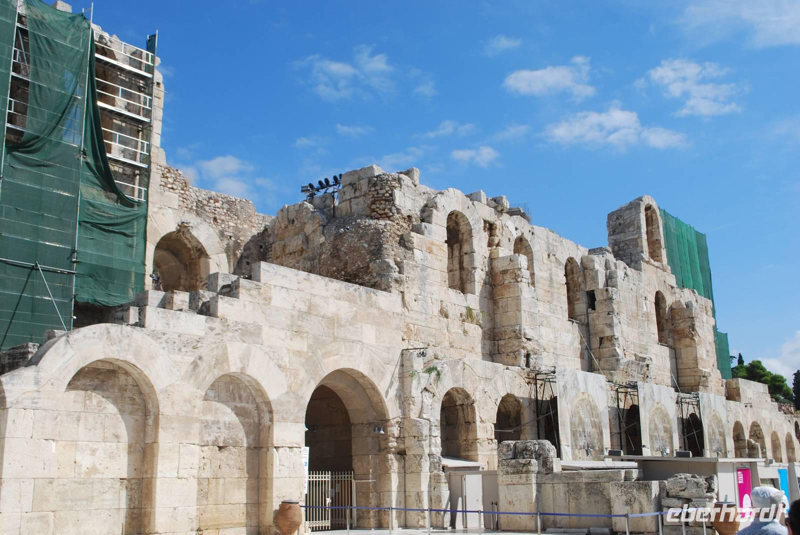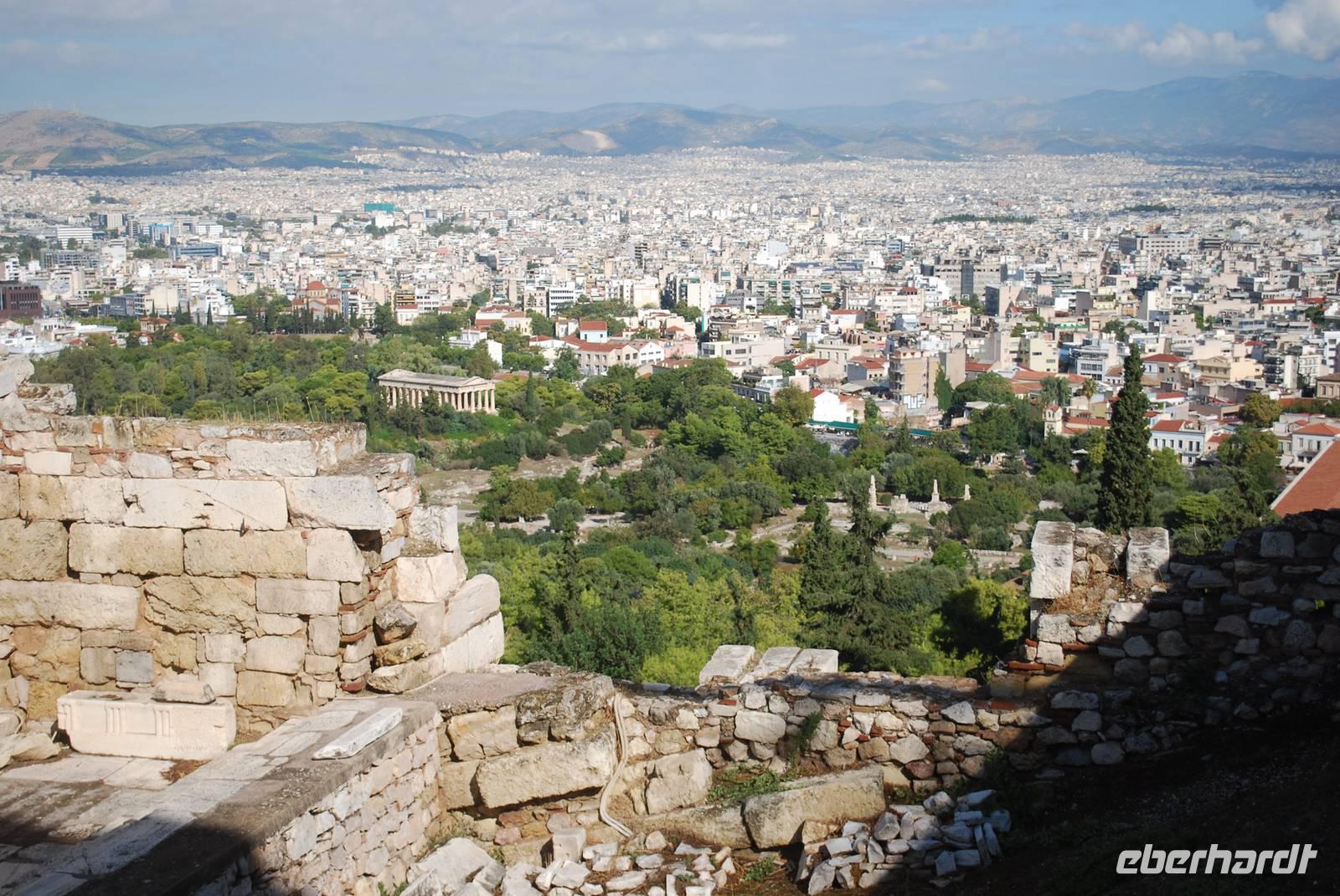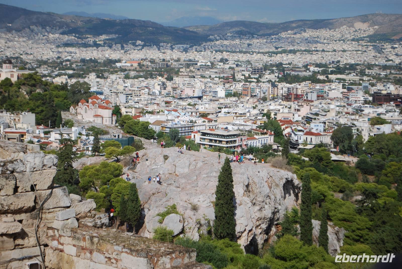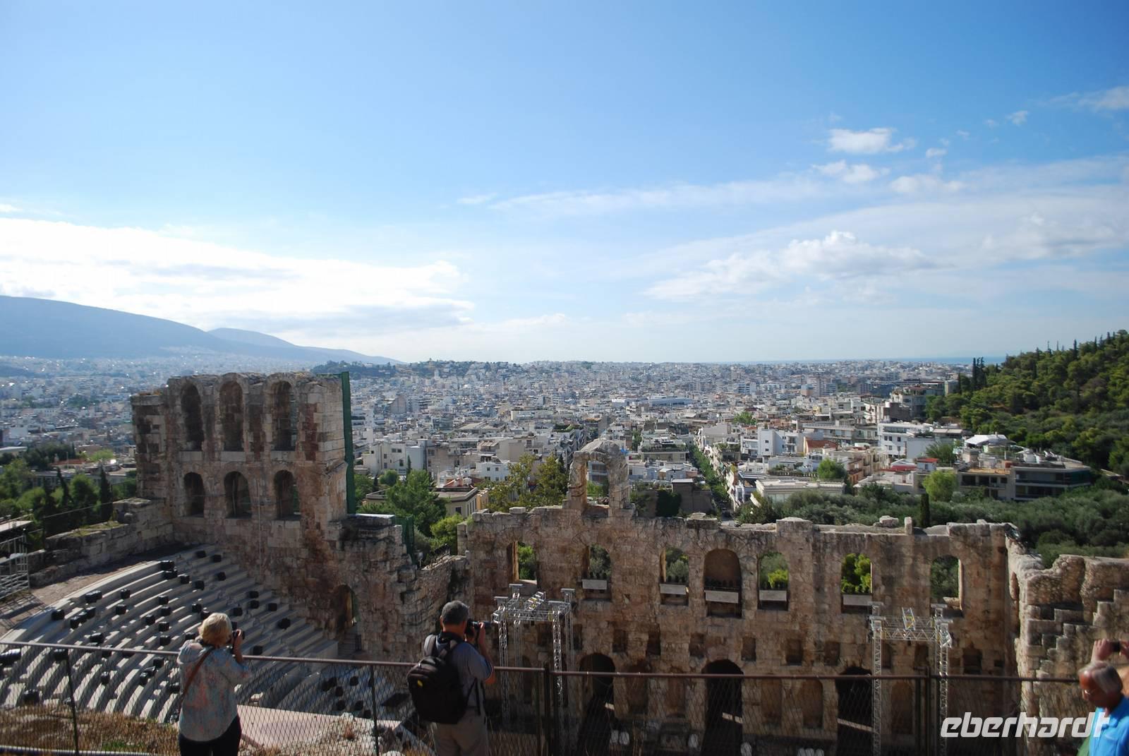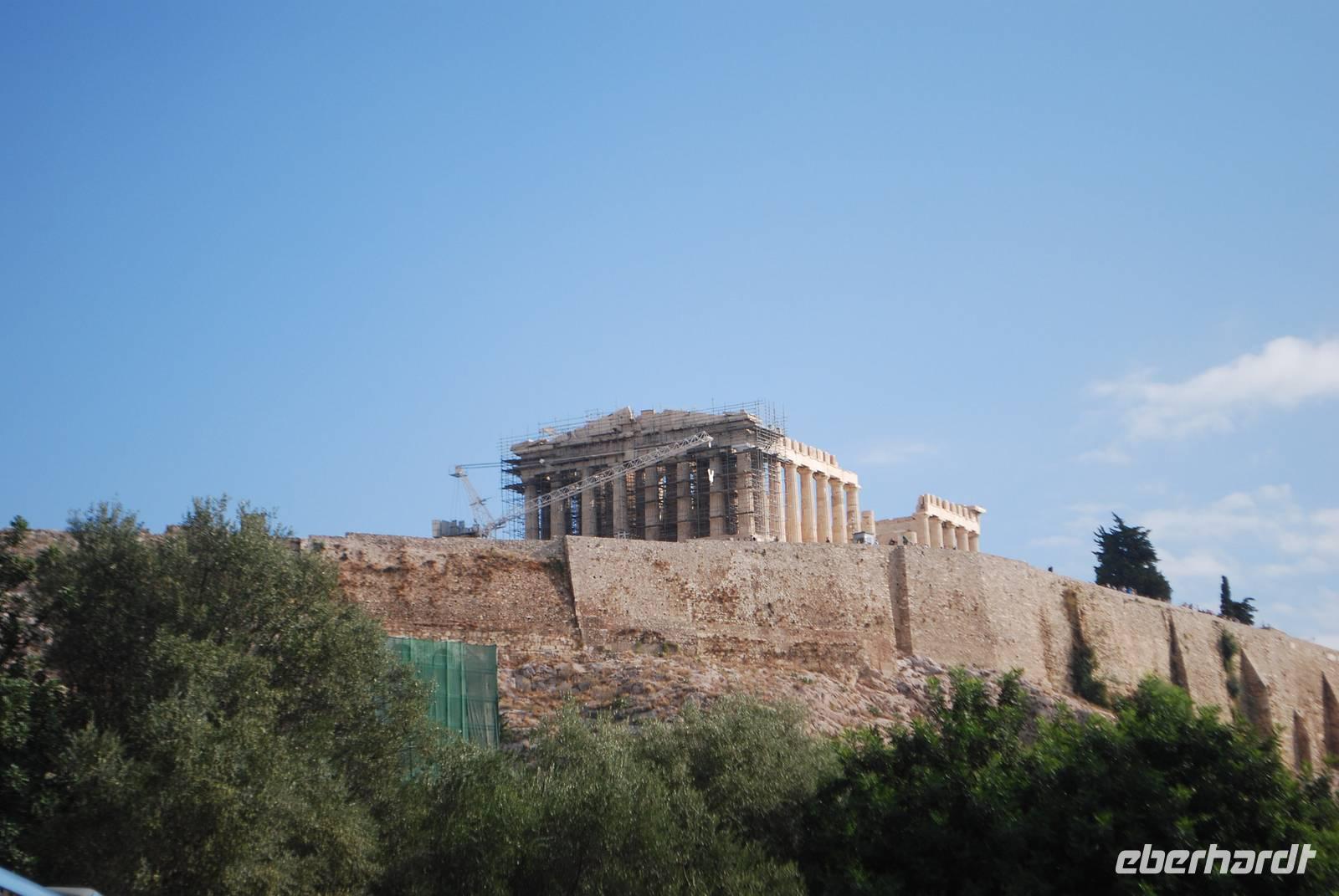 Wieder relativ zeitig verlassen Sie das Hotel für die Hauptstadt Griechenland. Nach einige „Abenteuer" mit dem Bus und das Eintreffen eines neuen Busses kommen wir gegen 09:30 Uhr in Athen, am Fuß des Akropolis an. Der Aufstieg ist relativ kurz aber auch sehr voll mit andere Besucher: es gibt nämlich ein Kreuzfahrtschiff der an dem Tag angelegt hat und die Akropolis ist auch Bestandteil deren Programm. Simeon macht uns dort eine sehr informative Führung, erklärt die unterschiedlichen Bauphasen der verschiedene Tempel, zeigt uns von oben die Agora, der Berg wo Paulus - einer der erste Apostel - gepredigt hat und der Platz für die Volksversammlung. Die Demokratie ist nämlich in Athen geboren und am Anfang haben sich alle freien Männer dort gesammelt um die wichtigen Entscheidungen zu treffen oder genauer gesagt, zu wählen. Auf der Akropolis sehen wir auch noch das ganz berühmter Parthenon, der ohne eine Explosion im 17 Jahrhundert noch fast vollständig wäre. Gegenüber steht der Erichteon, mit seine schöne Karyatiden - die Frauenstatuen, die die Rolle von Säulen spielen. Nach der Besuch der Akropolis gehen wir den Berg wieder runter in die Plaka, die Altstadt von Athen wo uns ein typisches Mittagessen in eine Taverne erwartet. Mit Reis gefüllte Weinblätter, in Öl eingelegt und gekochte Auberginen, einen Nusskuchen... Damit bekommen wir einem ersten - und positiven - Einblick in die griechische Gastronomie.