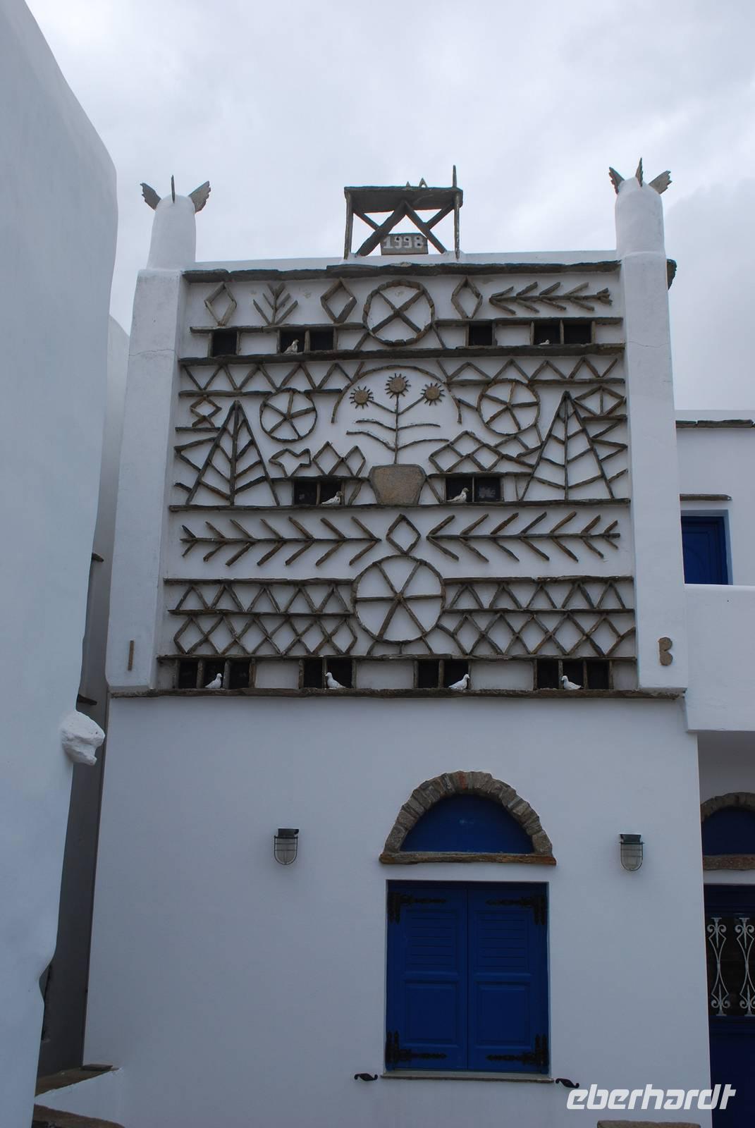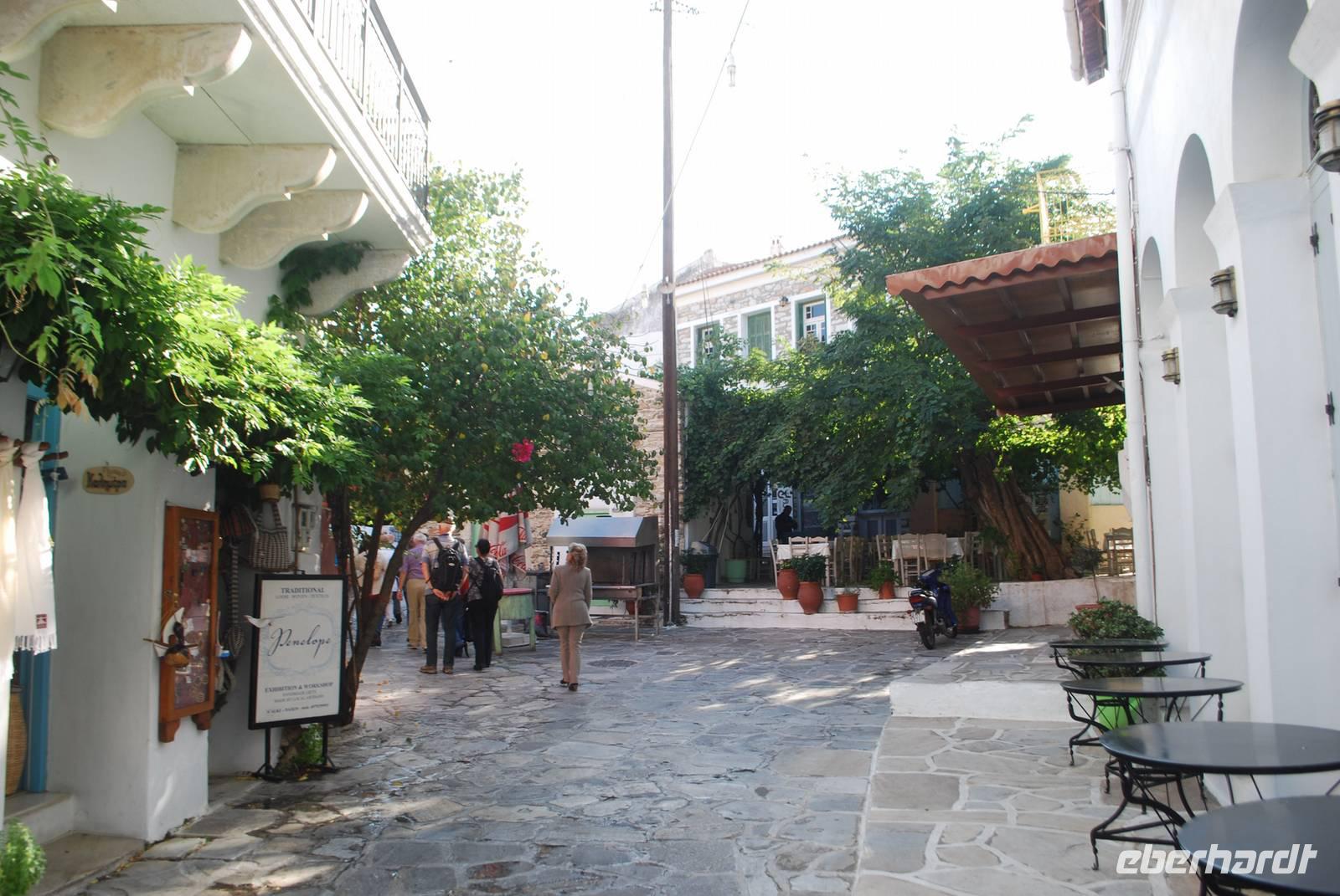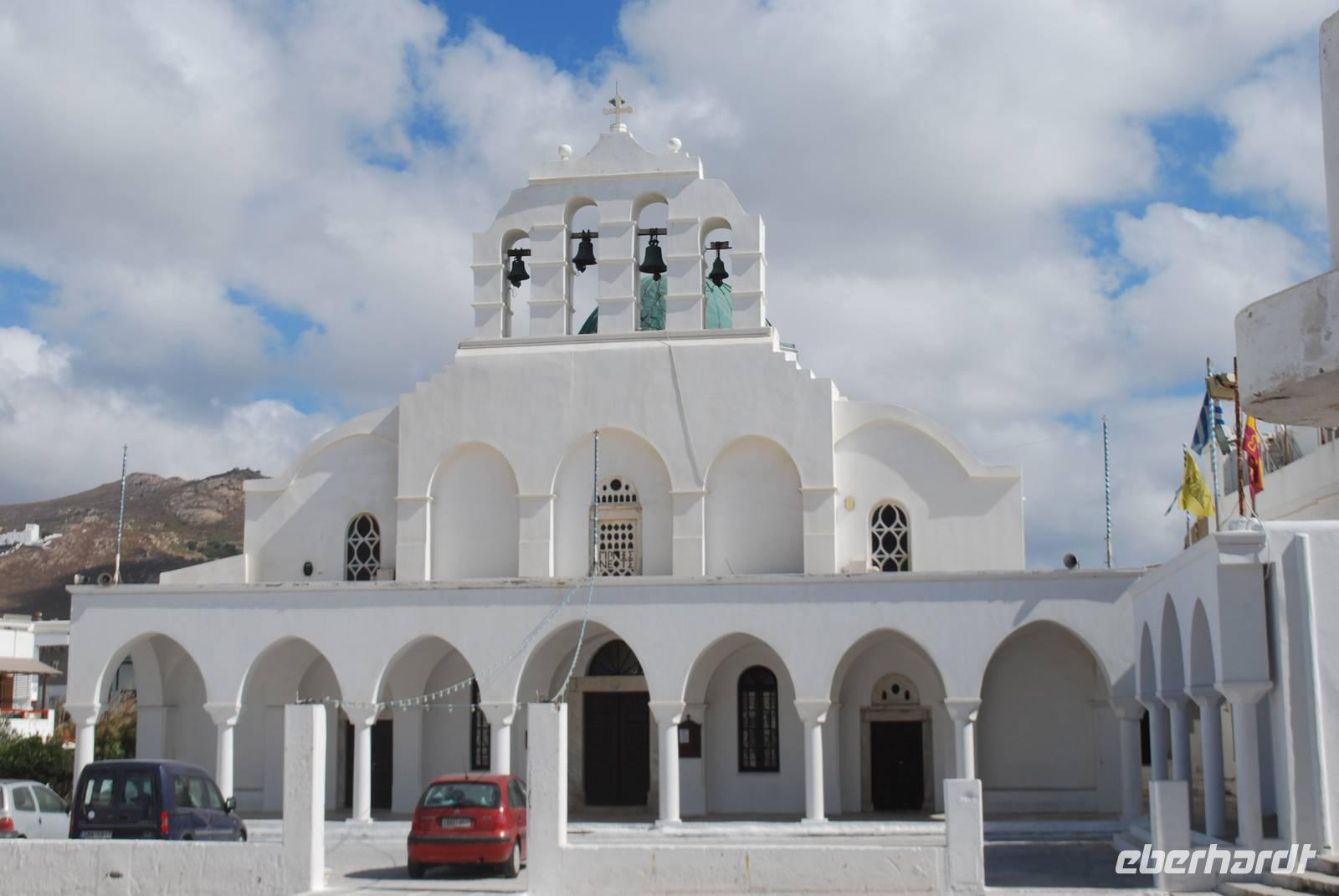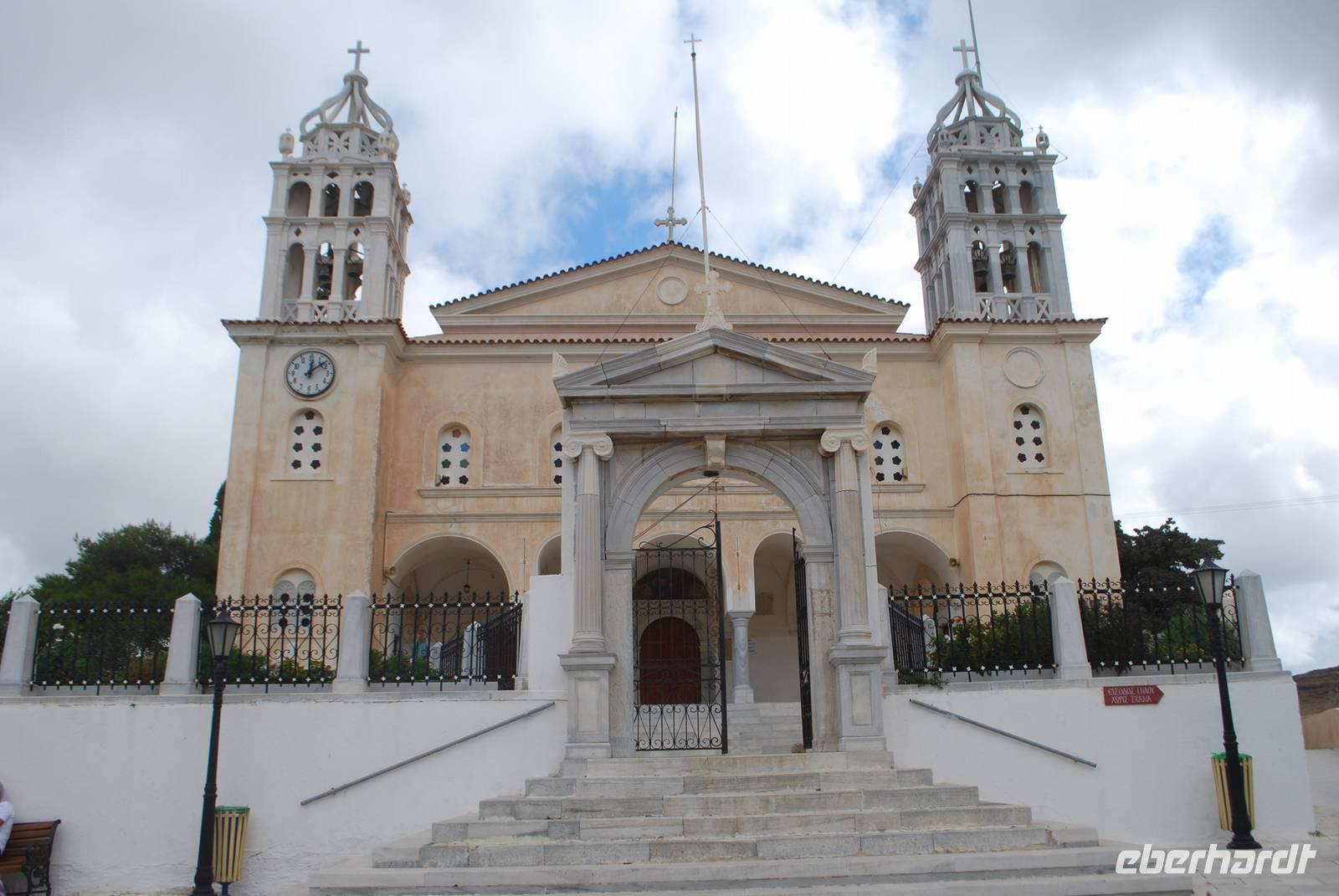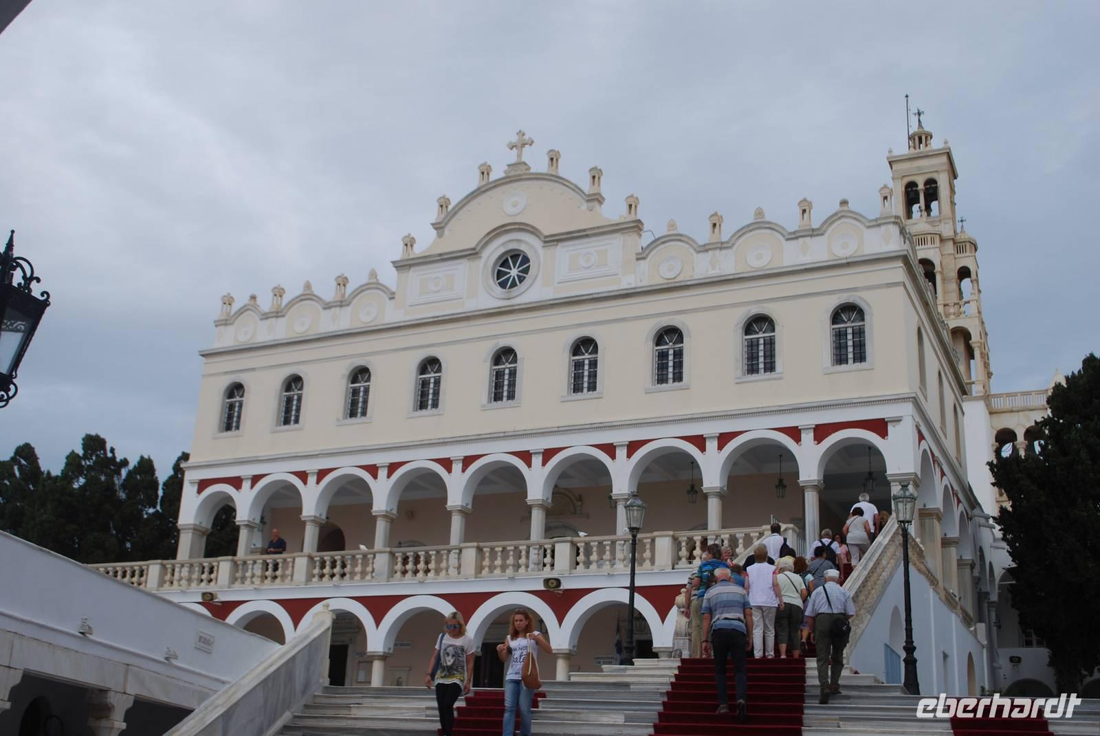 Danach erwartet uns einen weiteren Sakralbau. Dieser hat aber nichts mit der Antike zu tun sondern mit dem Christentum: es handelt sich um die Kirche der Panagia Evangelistria in Tinos-Stadt. Die orthodoxe Kirche wurde im 19. Jahrhundert gebaut, nachdem man hier eine Ikone gefunden hat. Die Ikone, genauso wie der Poseidon, der auf der Insel verehrt wurde, soll Krankheiten heilen, deswegen gibt es die Möglichkeit in den nah gelegene Votivshops kleine Silber- oder Goldplatten mit ein abgebildeten Bein oder Auge usw. je nach dem an welche Krankheit einem leidet. Wir können leider aus Respekt für den Gottesdienst, der gerade stattfindet nicht so lange in der Kirche bleiben, dafür haben wir aber noch ein bisschen Freizeit um entlang der Prozessionsstraße, die bis zum Hafen von Tinos führt, zu spazieren. Entlang der Prozessionsstraße befinden sich so viele Geschäften wo man Ikonen oder Weihwasser erwerben kann! Da wird die große Bedeutung diese Kirche und Tinos als Wallfahrtsort in Griechenland richtig deutlich.