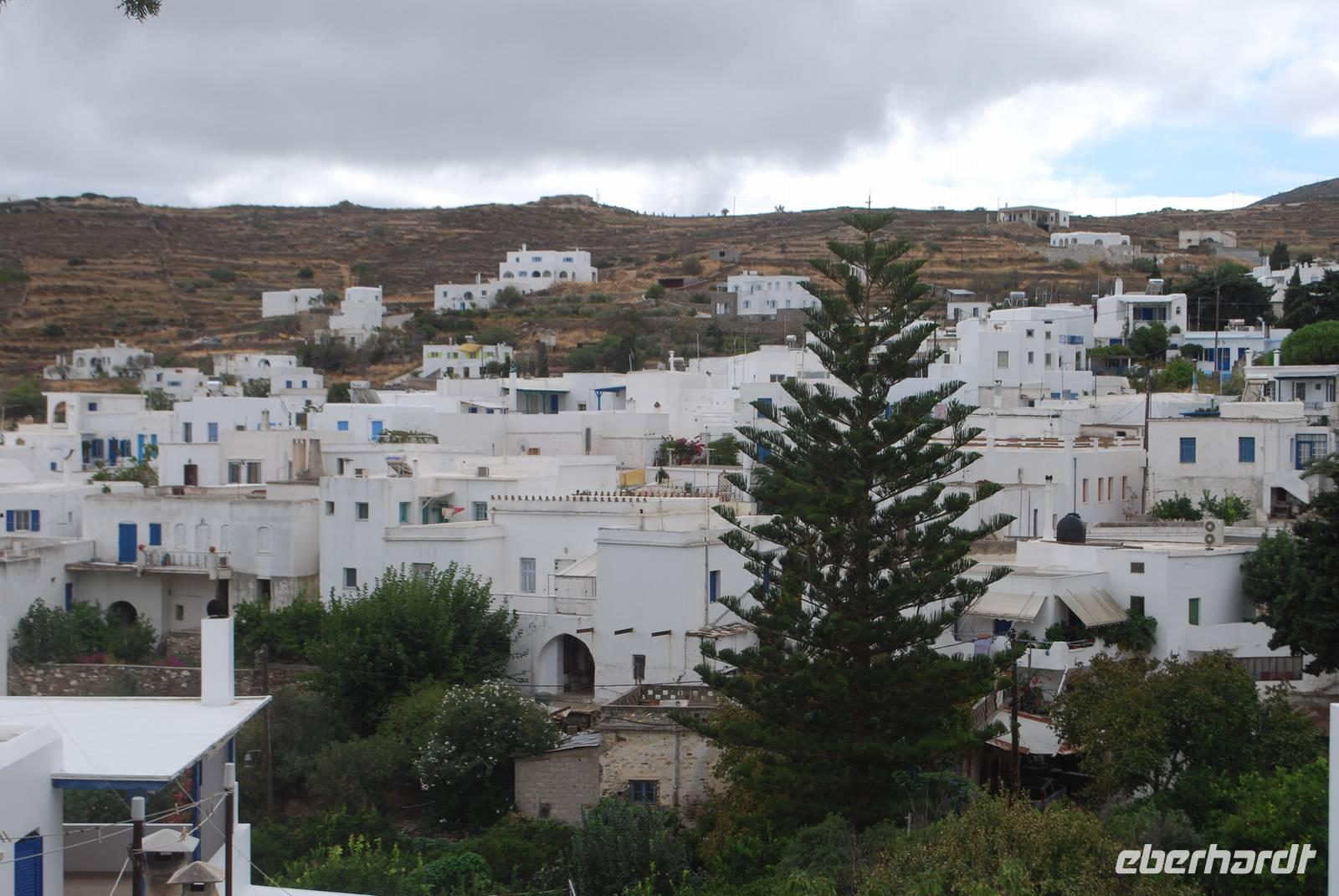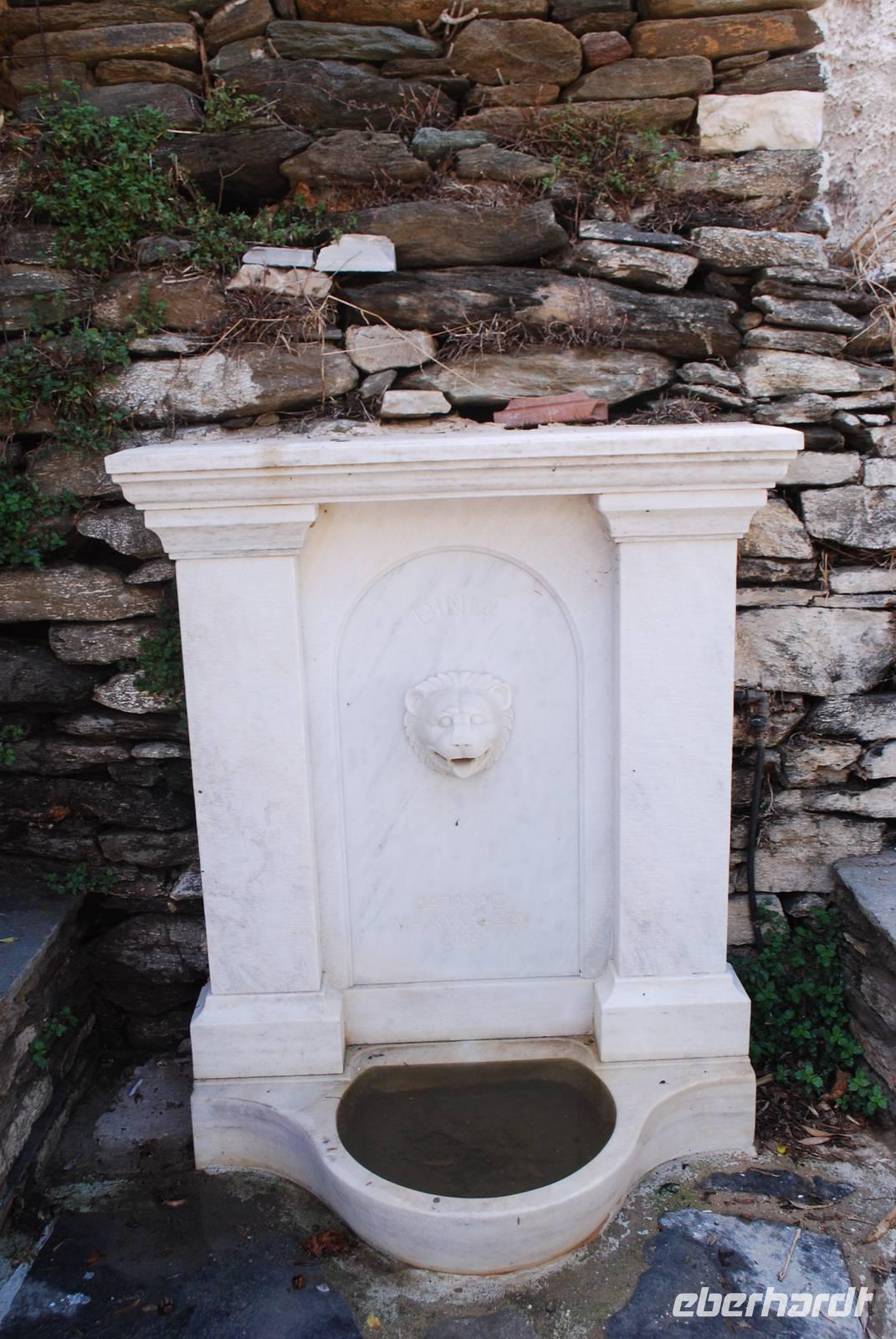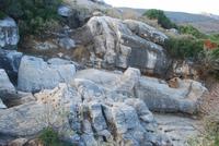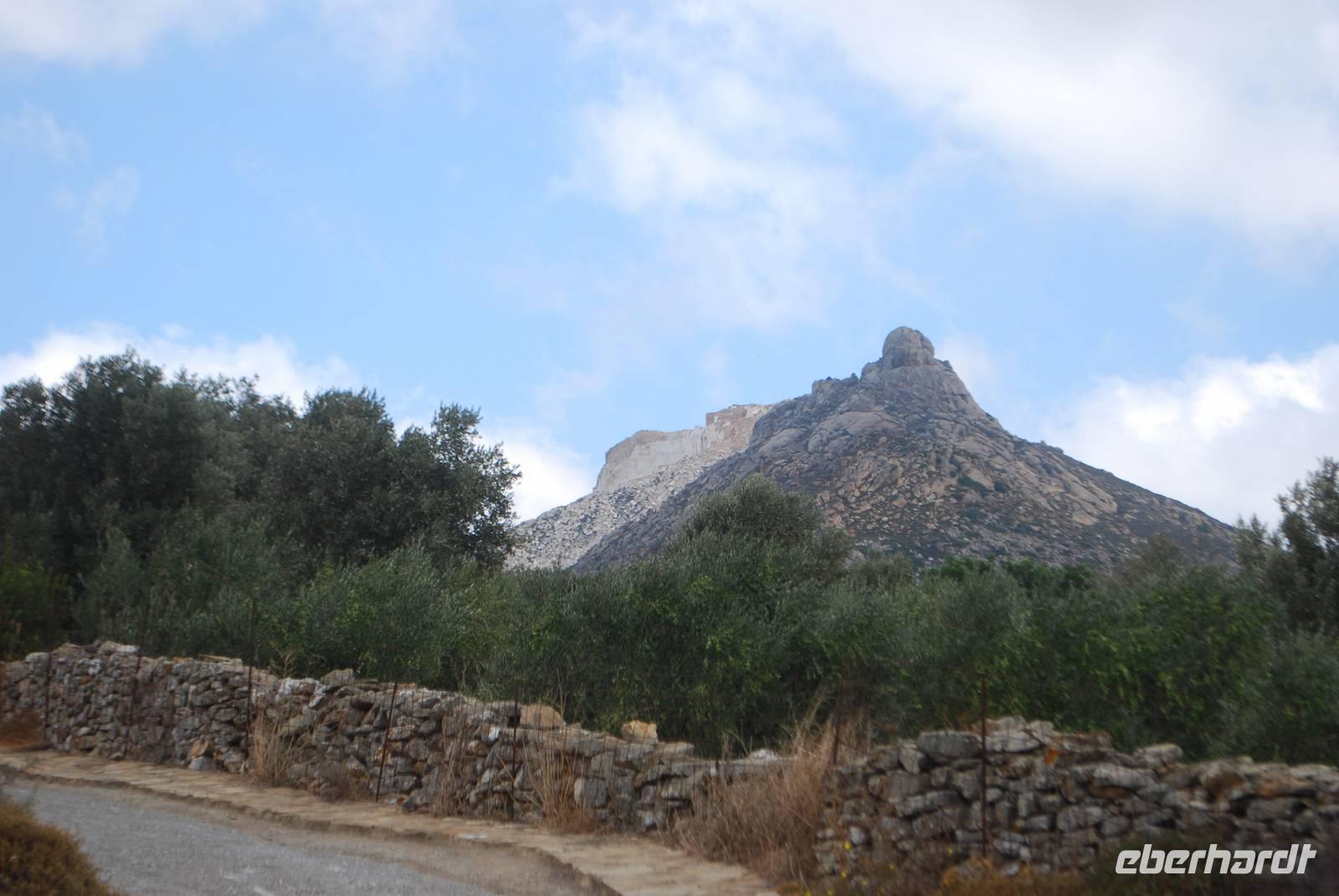 Anschließend fahren wir ins Inselinnere, zwischen Parikia und Lefkes, zu den ehemaligen Marmorbrüchen von Marithi. Insgesamt waren hier eine lange Zeit drei Stollen in Betrieb. Von dort kommt einer der hochwertigsten Marmore der Welt, schneeweiß und ganz fein. Nach und nach ist es aber zu aufwendig und zu teuer geworden, den Marmor in diesem Stollen abzubauen so, dass sie heutzutage nicht mehr in Betrieb sind. Es ist aber noch möglich Marmor zu finden: er befindet sich direkt unter unsere Füße! Wir brauchen uns nur bücken, ein Stein aufheben, es entweder polieren oder auf einem anderen Stein in Teile zerbrechen und schon haben wir in der Hand dieser berühmter Marmor. Wie überall sind wir von Katzen empfangen denn Griechenland ist das Land der Katzen par Excellence. Unweit von Marithi befindet sich das Bergdorf Lefkes mit seiner gewaltigen Kirche, die der Dreifaltigkeit gewidmet ist. Wir trinken erstens ein Kaffee in einem urigen Lokal am Anfang des Dorfes und machen uns dann auf dem Weg zur Kirche durch die kleinen weißen Häuser. Während unserer Spaziergang zeigt uns auch Simeon mehrere Pflanzen die hier einheimisch sind: unter anderem Kapern und Pistazien. An der Kirche angekommen können wir die schöne Kirchtürme aus Marmor bewundert. Die Kunst der Kirchtürme haben die Venezianer nach Griechenland gebracht und diese sind besonders schön. Man könnte die fast mit Spitzenarbeit vergleichen.