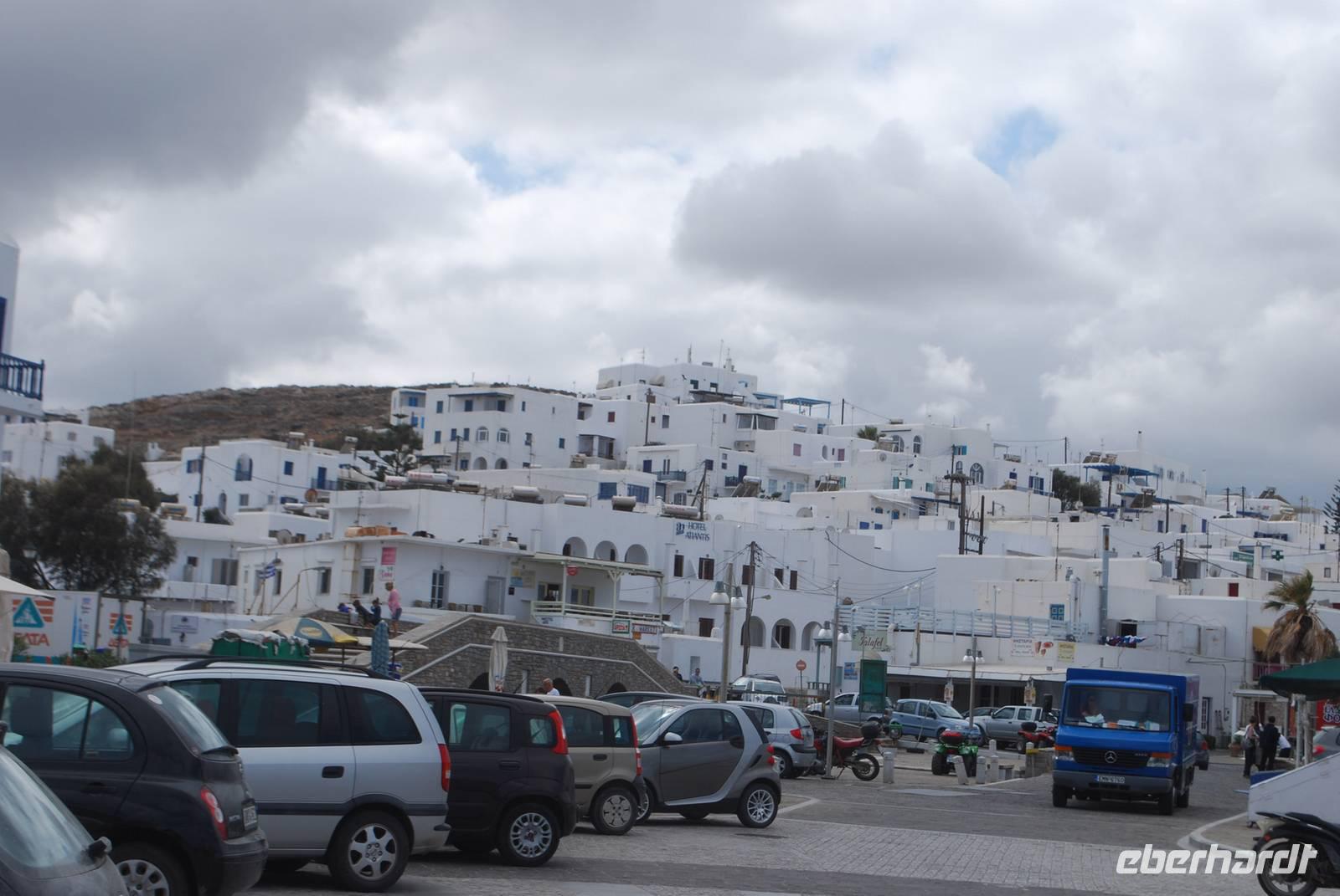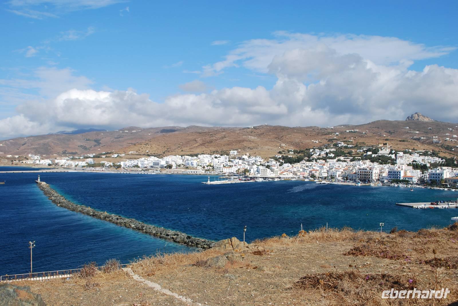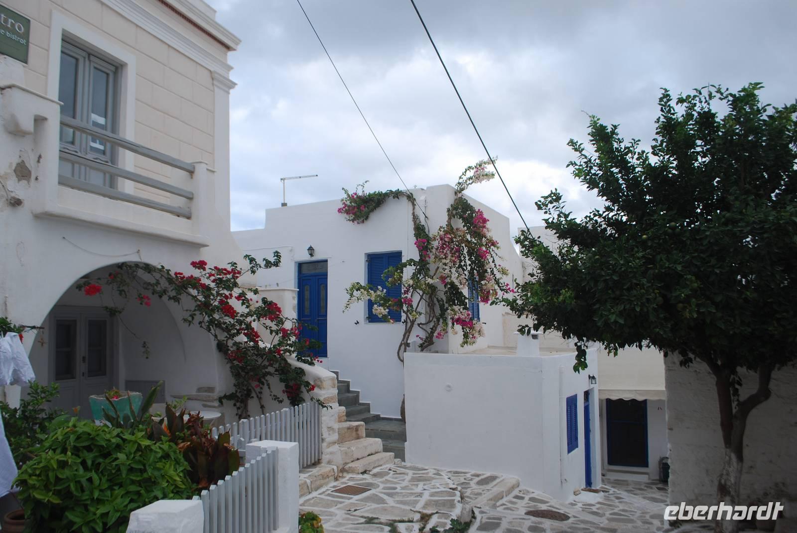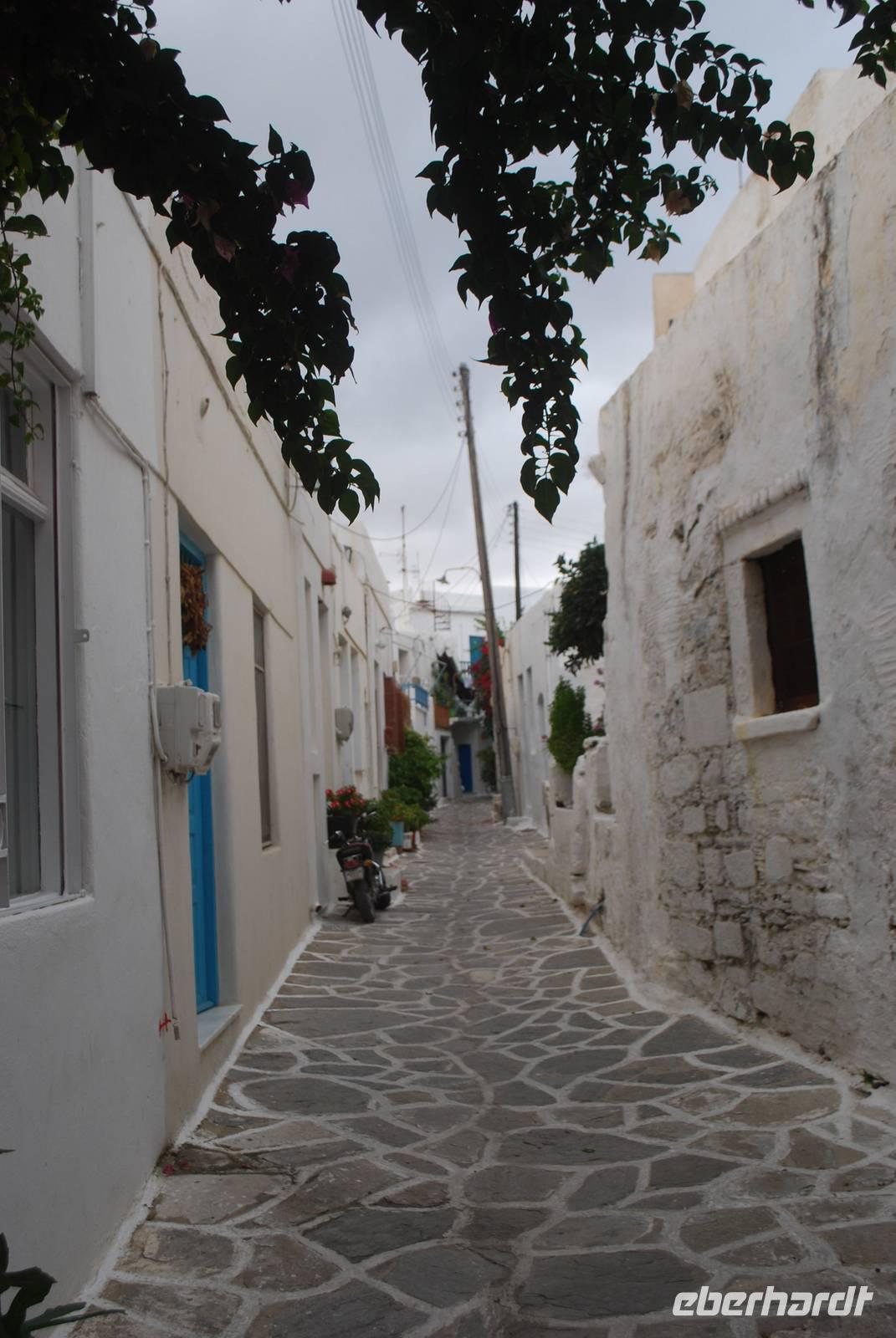 Paros ist eine der größten Inseln der Kykladen und auch eine der touristisch gesehen am besten ausgebaut. Die Insel haben wir am Abend erreicht, im Hafen von Parikia. Von dort bis zu unserem Hotel nahe Naousa im Norden der Insel sind es nur wenige Fahrminuten. Malerisch ans Meer gelegen ist das Hotel Saint Andrea eine richtige Ruhe- und Erholungsoase. Unsere Besichtigung der Insel beginnt mit dem Ort Parikia, die sogenannte Chora - der Hauptort - der Insel. Zahlreiche kleine Boutiquen, enge Gassen und der Rest eine beeindruckende fränkische Festung. Während eines Spazierganges bekommen wir von Simeon zahlreiche Erklärungen über diese Festung, die auch in Griechenland „Akropolis" genannt wird, und über den Ort allgemein.