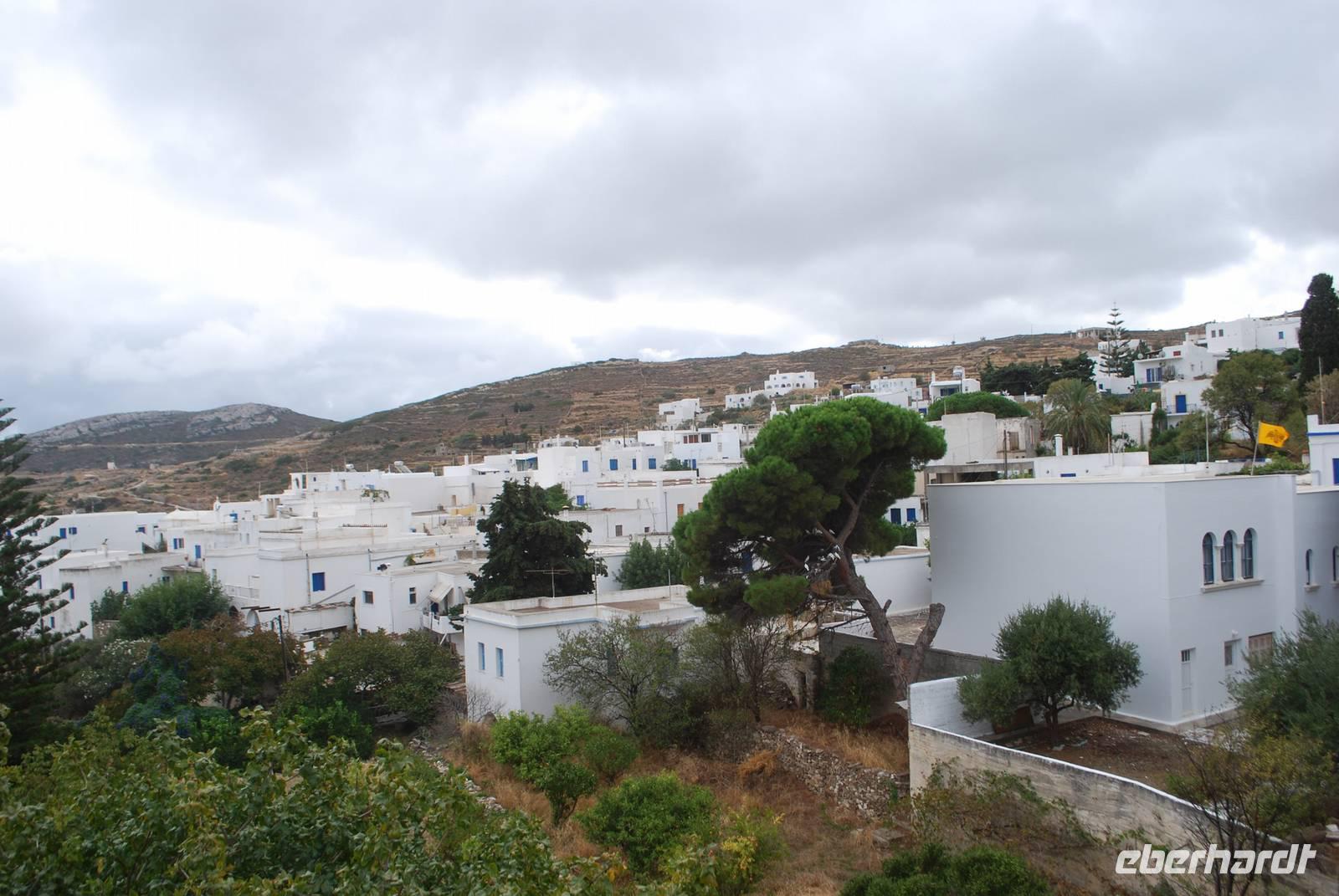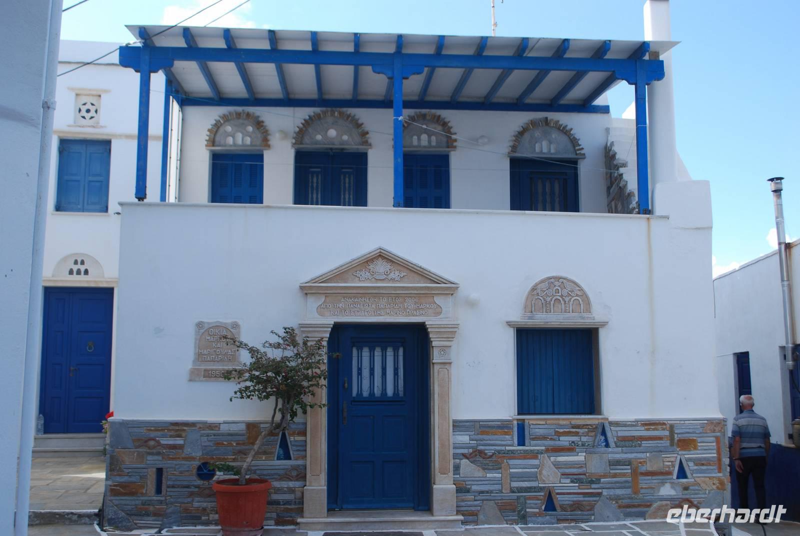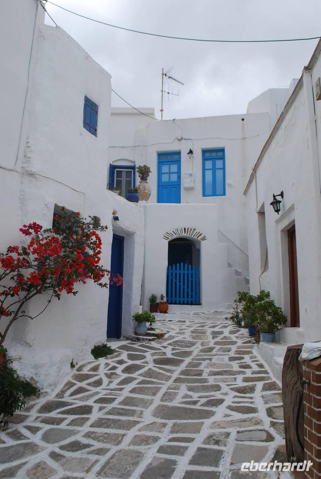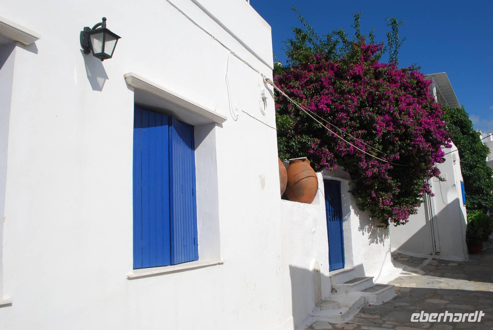 Paros ist eine der größten Inseln der Kykladen und auch eine der touristisch gesehen am besten ausgebaut. Die Insel haben wir am Abend erreicht, im Hafen von Parikia. Von dort bis zu unserem Hotel nahe Naousa im Norden der Insel sind es nur wenige Fahrminuten. Malerisch ans Meer gelegen ist das Hotel Saint Andrea eine richtige Ruhe- und Erholungsoase. Unsere Besichtigung der Insel beginnt mit dem Ort Parikia, die sogenannte Chora - der Hauptort - der Insel. Zahlreiche kleine Boutiquen, enge Gassen und der Rest eine beeindruckende fränkische Festung. Während eines Spazierganges bekommen wir von Simeon zahlreiche Erklärungen über diese Festung, die auch in Griechenland „Akropolis" genannt wird, und über den Ort allgemein.
