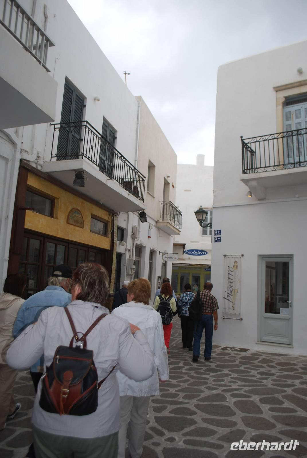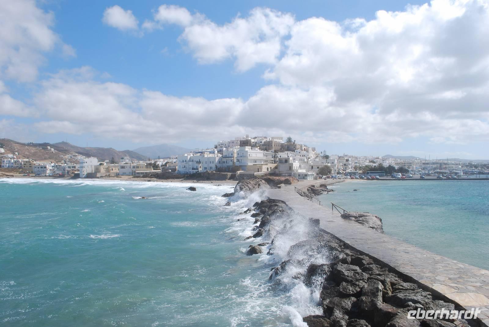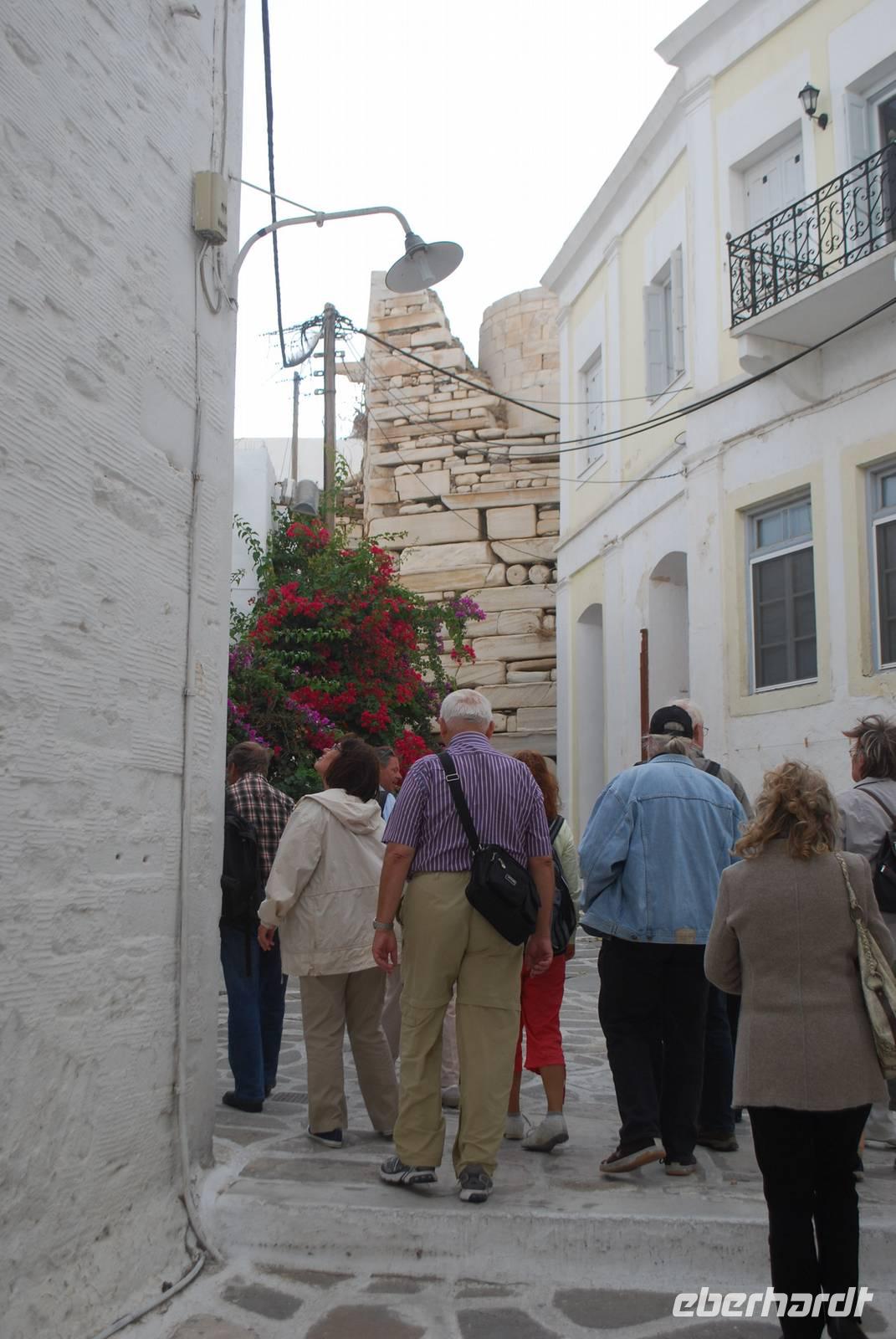An einem windigen, zum Glück aber sonnigen Tag, kommen wir auf Naxos an. Der erste Hingucker ist die Portara, das Tempeltor von Naxos. Aufgrund des starken Winds können wir aber nicht direkt nach unserer Ankunft dorthin laufen: die Wellen überspülen die Mole und machen den Spaziergang gefährlich und unangenehm. Dafür bekommen wir aber einen ausgiebigen Spaziergang durch die Altstadt der Chora von Naxos geboten. Der Altmarkt und alle kleine Gässchen sind übersät mit Juwelieren und hübschen kleinen Geschäften. Die Architektur des Ortes ist auch sehr gut geplant: nach Simeon´s Erklärungen sind die Häuser so dicht aneinander gereiht, weil es mehrere Vorteile bringt: Schutz vor der Sonne, Schutz vor dem Wind und vor allem auch Schutz vor den Piraten. Für einen Fremden ist es nämlich sehr einfach die Orientierung in den zahlreichen kleinen Straßen zu verlieren. Wir kommen bis zum Fuß der Burgfestung - der Akropolis - bevor wir wieder zum Hafen laufen. Die Akropolis werden wir später besichtigen. Nach dem Spaziergang haben wir noch Freizeit, um die Stadt auf eigene Faust zu erkunden und - für die ganz Mutigen unter uns - eventuell bis zur Portara zu laufen. Für die, die am ersten Tag auf Naxos nicht zur Portara gegangen sind, gab es den „offiziellen" Besuch am nächsten Morgen.