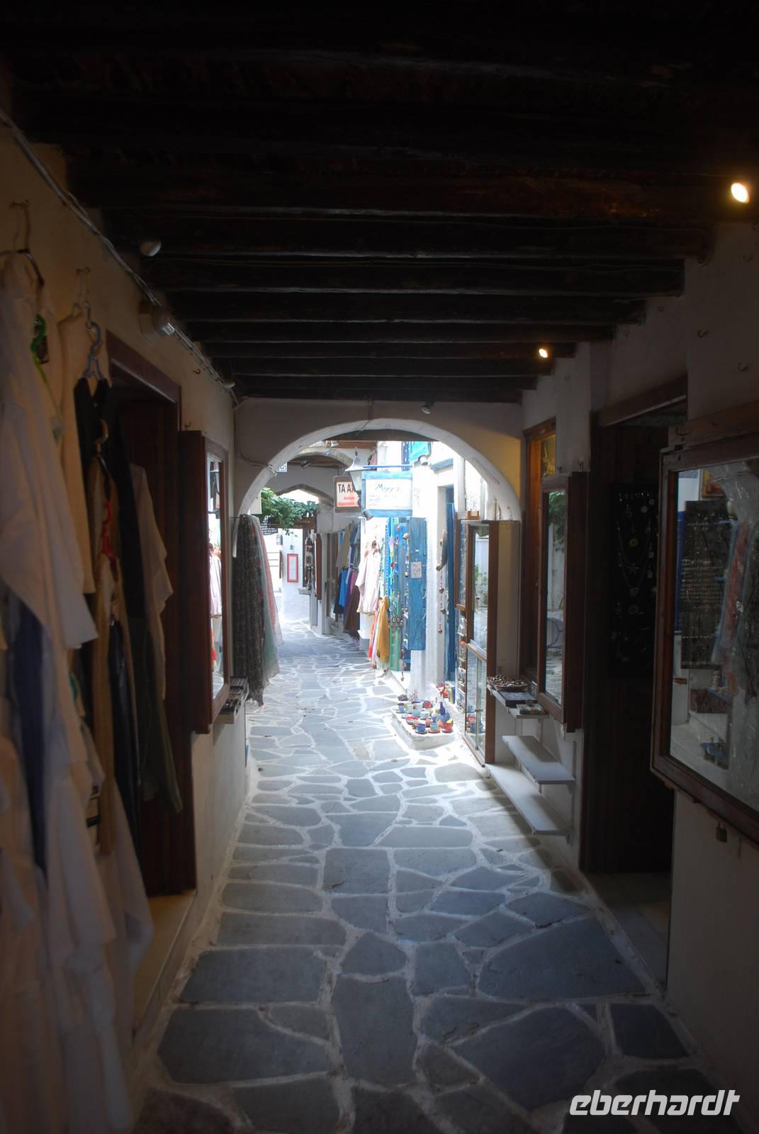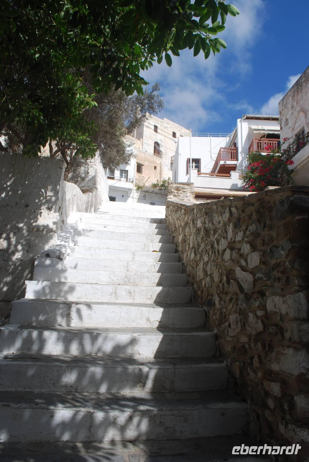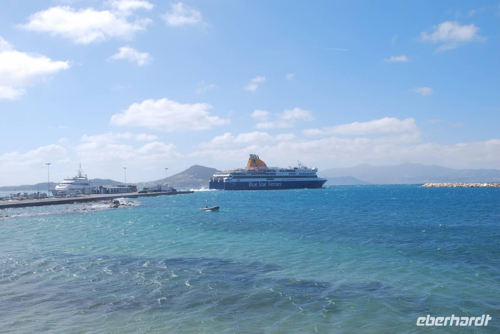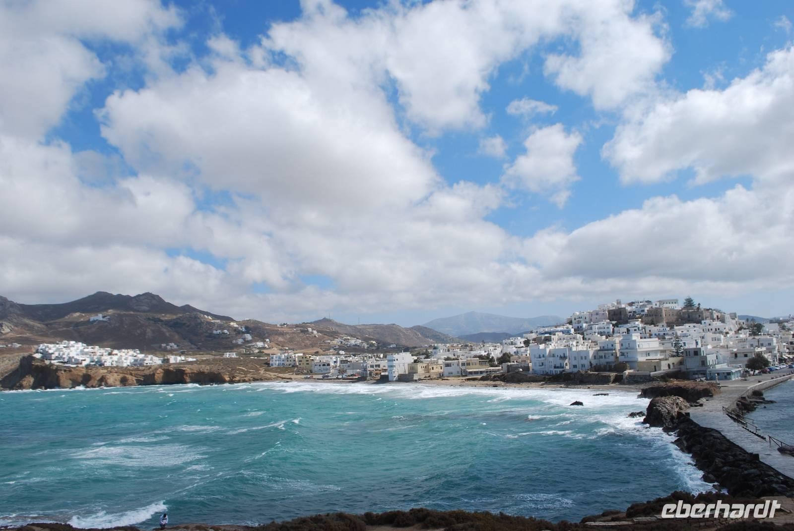 An einem windigen, zum Glück aber sonnigen Tag, kommen wir auf Naxos an. Der erste Hingucker ist die Portara, das Tempeltor von Naxos. Aufgrund des starken Winds können wir aber nicht direkt nach unserer Ankunft dorthin laufen: die Wellen überspülen die Mole und machen den Spaziergang gefährlich und unangenehm. Dafür bekommen wir aber einen ausgiebigen Spaziergang durch die Altstadt der Chora von Naxos geboten. Der Altmarkt und alle kleine Gässchen sind übersät mit Juwelieren und hübschen kleinen Geschäften. Die Architektur des Ortes ist auch sehr gut geplant: nach Simeon´s Erklärungen sind die Häuser so dicht aneinander gereiht, weil es mehrere Vorteile bringt: Schutz vor der Sonne, Schutz vor dem Wind und vor allem auch Schutz vor den Piraten. Für einen Fremden ist es nämlich sehr einfach die Orientierung in den zahlreichen kleinen Straßen zu verlieren. Wir kommen bis zum Fuß der Burgfestung - der Akropolis - bevor wir wieder zum Hafen laufen. Die Akropolis werden wir später besichtigen. Nach dem Spaziergang haben wir noch Freizeit, um die Stadt auf eigene Faust zu erkunden und - für die ganz Mutigen unter uns - eventuell bis zur Portara zu laufen. Für die, die am ersten Tag auf Naxos nicht zur Portara gegangen sind, gab es den „offiziellen" Besuch am nächsten Morgen.