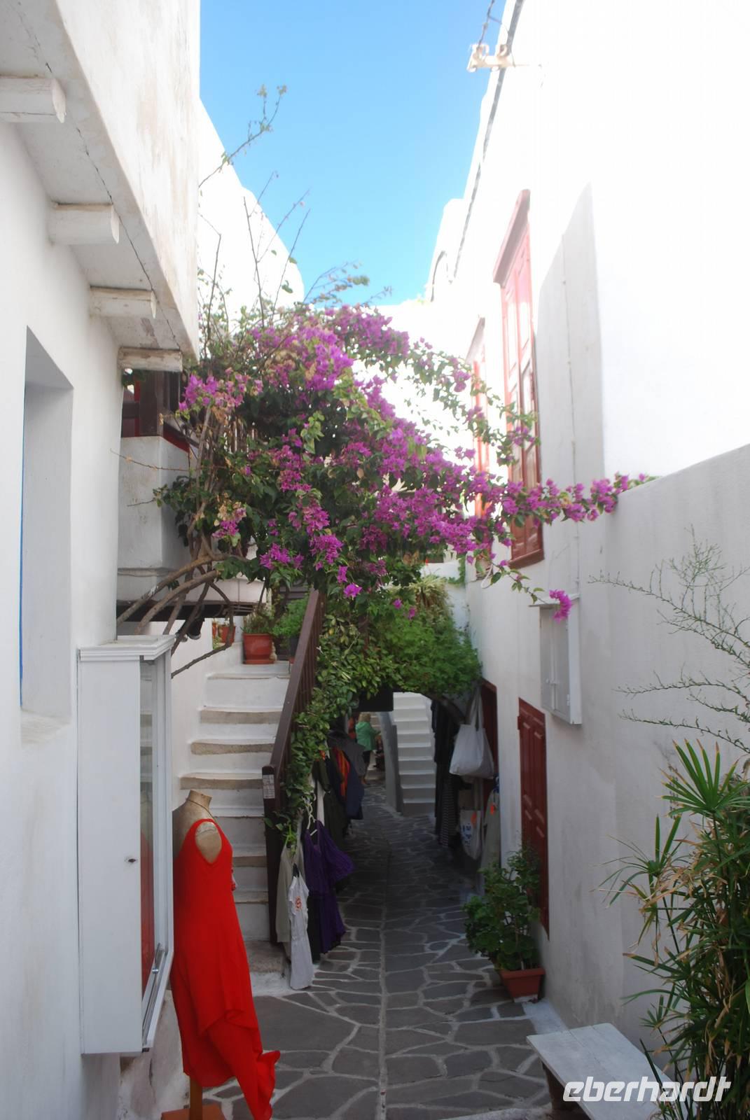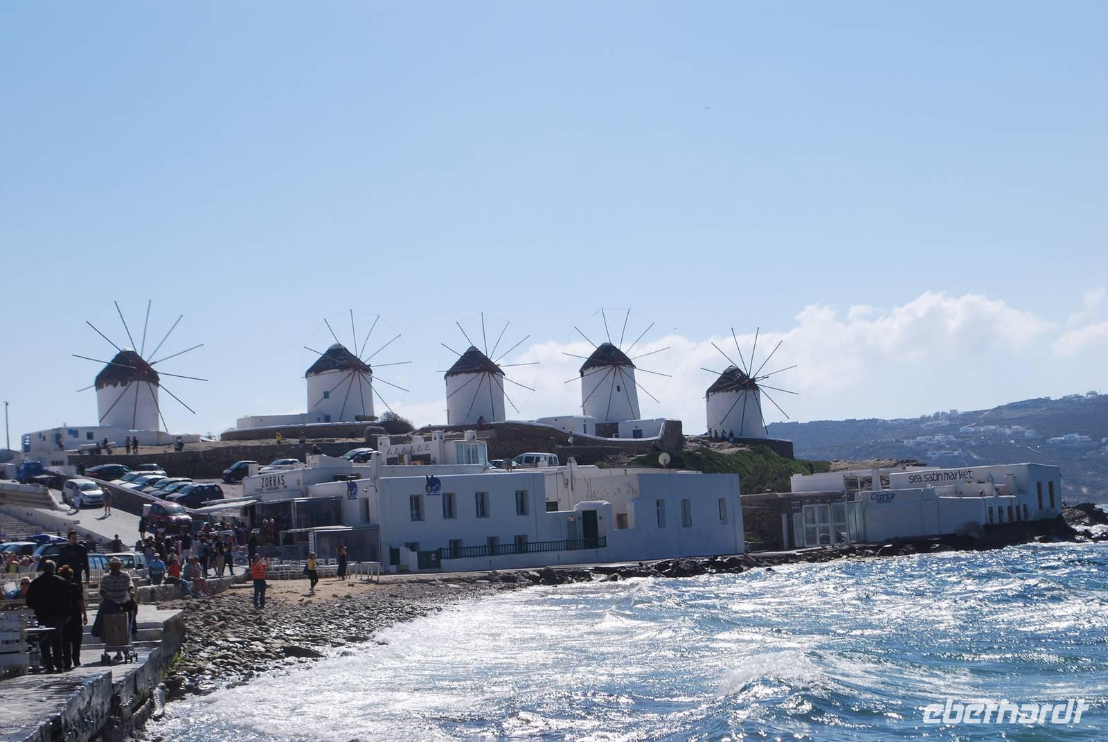 Am frühen Nachmittag wechselten wir die Insel und kamen auf Mykonos an. Mykonos ist das Saint-Tropez oder das Ibiza der Kykladen und Griechenland. Hier trifft sich die „High Society", um im Sommer am Strand zu feiern und zahlreiche Modemacher haben Geschäfte in den engen Gassen der Hauptstadt der Insel. Die kleinen Gassen, die wir erkundet haben, waren voll mit Leuten. Entlang des Meeres sind wir Zuerst an den Windmühlen, einer der Symbole von Mykonos, angekommen. Nach einem Fotostopp haben wir eine orthodoxe Kirche besichtigt, wo bald eine Taufe stattfinden sollte und sind dann in den kleinen Gässchen gelaufen bis wir anschließend Freizeit zum Ausruhen und einen Snack hatten. Am späten Nachmittag ging es dann zurück nach Naxos.