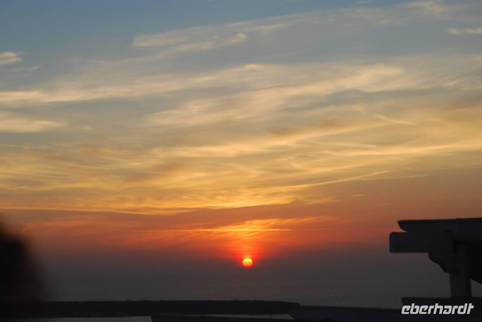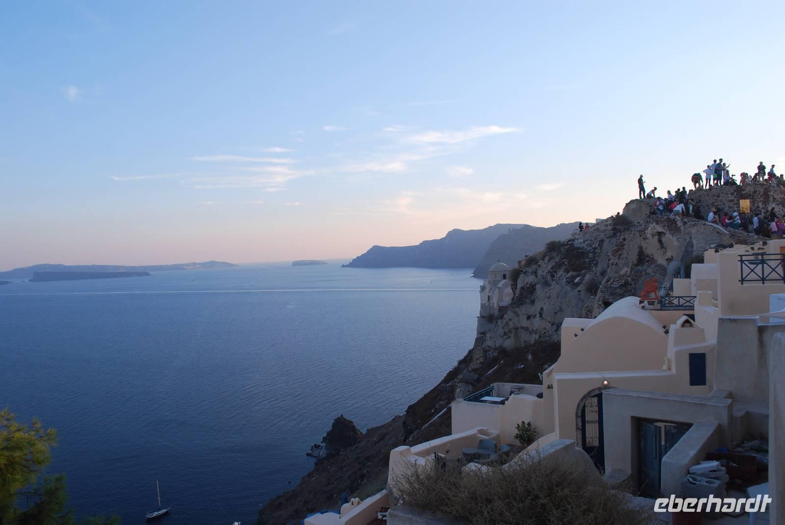 Die letzte Insel unsere Reise ist die beeindruckende Vulkaninsel Santorini, die wir an einem wunderschönen Tag erreichten. Das Schiff fuhr langsam entlang der Caldera des Vulkans bis zum Hafen. Auf unserer linke Seite zu sehen war Santorini, auf unserer rechten Seite die Vulkaninsel Kameni, ein Hügel aus schwarzem Lavagestein, der aus dem Meer ragt. Am Hafen angekommen hat uns ein schöner Bus der Farbe Pink abgeholt und uns auf eine kurvenreiche Straße bis zu unserem Hotel gebracht. Schon am Tag unserer Ankunft durften wir den ganz berühmten romantischen Sonnenuntergang in Oia betrachten - mit hundert von anderen Personen, was weniger romantisch ist.