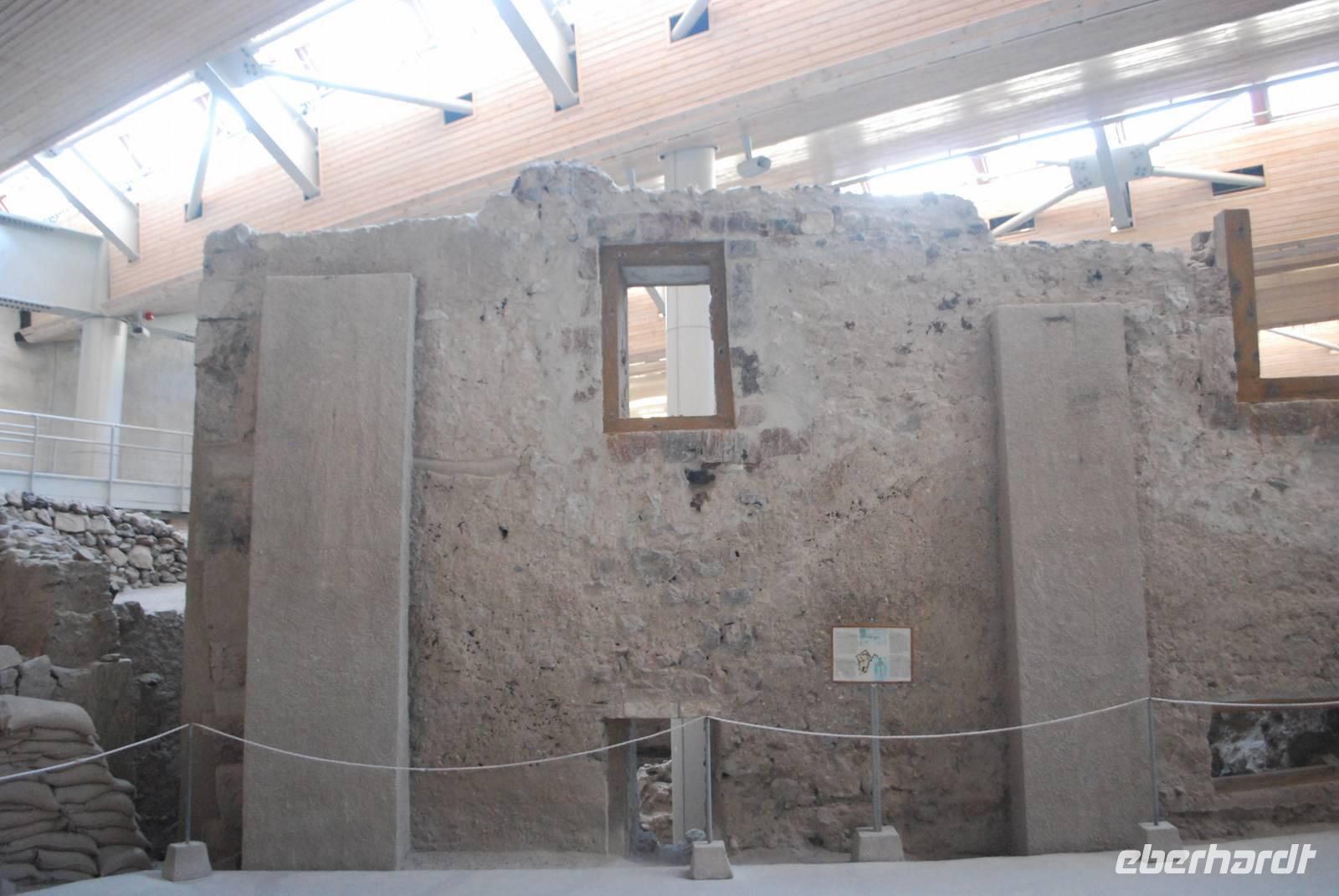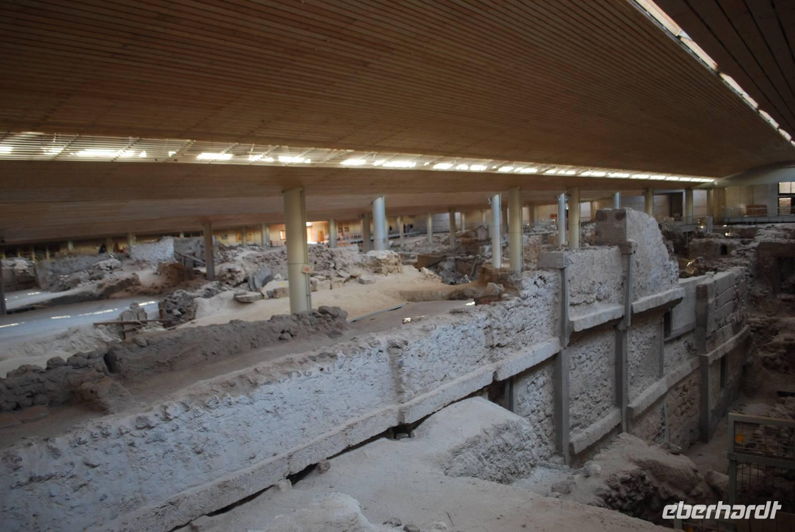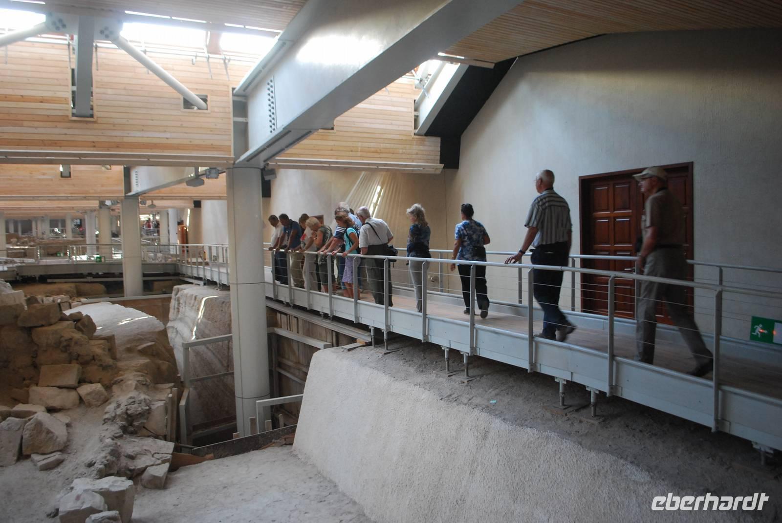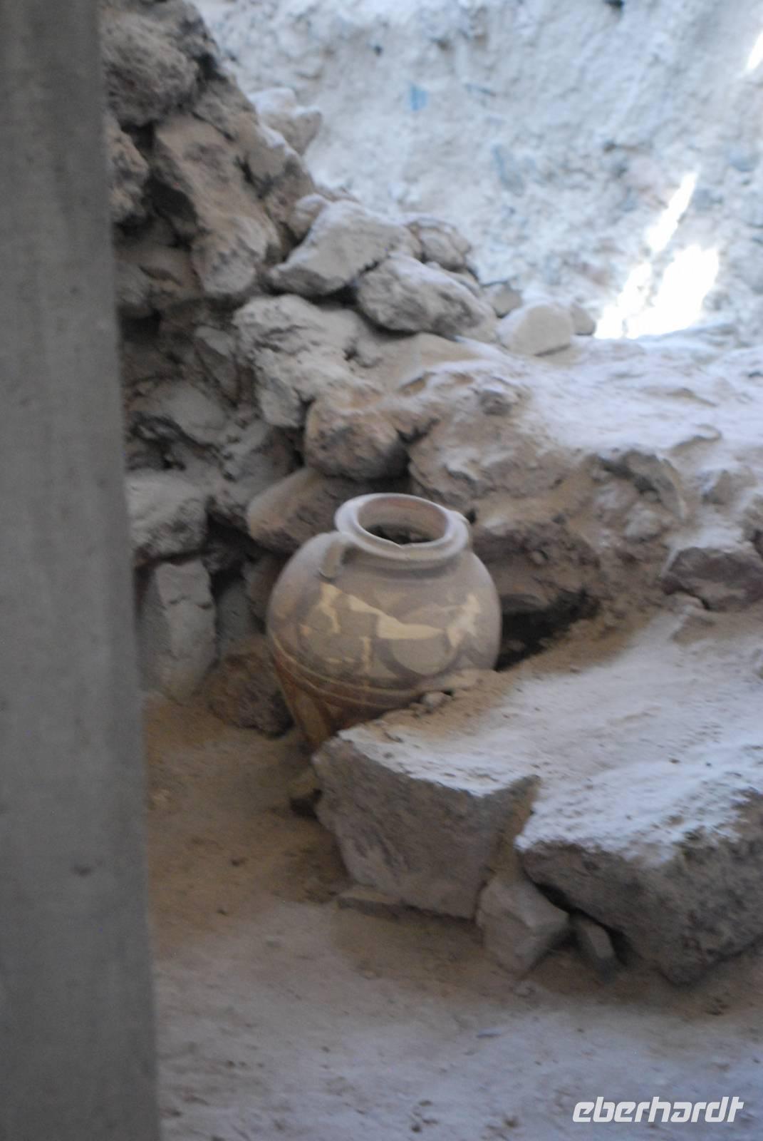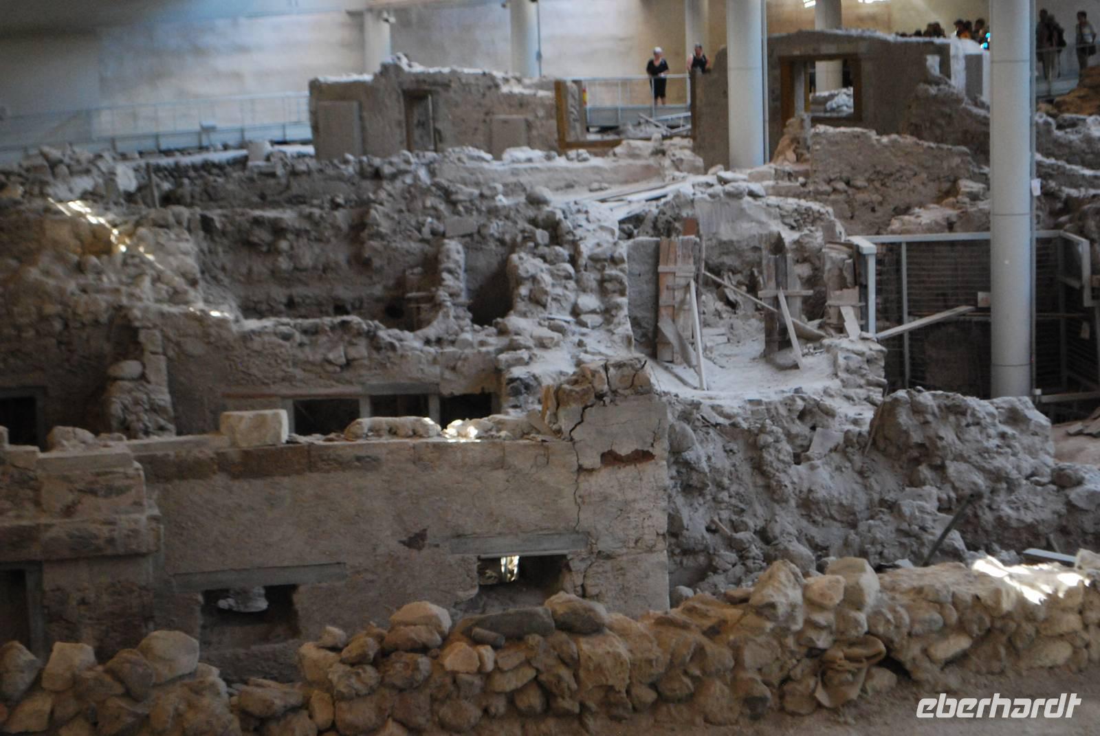 Die letzte Sehenswürdigkeit unserer schönen Reise war die Ausgrabungsstätte von Akrotiri im Süden von Santorini. Im 17. Jahrhundert vor Christus wurde eine ganze Stadt durch einen Vulkanausbruch verschüttet, der gleiche Vulkanausbruch durch den das ganze Zentrum Santorinis ins Meer gesunken ist und der Insel ihre heutige Form gab. Bei einem Rundgang in der ehemaligen minoischen Stadt erfahren wir mehr über die Kultur während dieser Zeit vorherrschte. Um unsere Reise auf den Kykladen richtig ausklingen zu lassen bekamen wir noch Freizeit in Fira und in Oia, um zu bummeln, bevor wir in einer typischen Taverne in Oia unser Abendessen einnahmen. Während unseres Menüs gab es unter anderem die „Fava", Hülsenfrüchte die eine Spezialität der Insel sind.