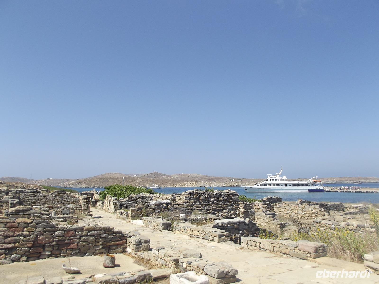 Geweckt von dem Meeresrauschen und den Sonnenstrahlen, findet sich die Gruppe am Frühstückstisch zusammen. Heute findet unser Ausflug nach Mykonos und Delos statt. Der Katamaran fährt um 9 Uhr vom Hafen ab und wir lassen uns ein warmes Lüftchen um die Ohren wehen. Circa eineinhalb Stunden später erreichen wir Delos: die Insel auf der nur noch gelegentlich einzelne Wächter wohnen. Wir staunen über die Mosaiken, die ausgegrabenen Hausmauern und die erhaltenen Säulenkonstruktionen. Besonders beeindruckend ist der Isis-Tempel, in dessen Inneren die Statue der göttlichen Schutzpatronin steht. Mit vielen neuen Eindrücken fahren wir mit dem Katamaran weiter nach Mykonos und genießen die Freizeit: manche Gäste spazieren zu den bekannten Windmühlen, um ein Foto zu schießen, und andere gönnen sich ein leckeres Eis mit Blick auf den Hafen und das dortige Treiben. Am frühen Abend treten wir die Rückfahrt an und lassen uns das Abendessen schmecken - in geselliger Runde und bei guten Gesprächen.