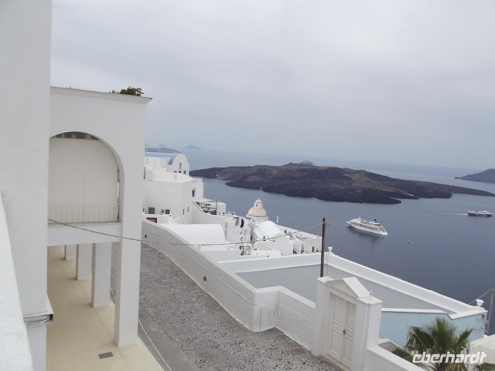 Heute besuchen wir noch einmal den Ort Parikia, da wir mittags mit der Fähre nach Santorin übersetzen wollen. In Parikia hat die Gruppe noch genügend Freizeit, um ein paar Souvenirs zu kaufen oder den Reiseleiter bis zu einem Aussichtspunkt zu begleiten. Um halb 12 treffen wir uns am Fährhafen und betreten unseren schwimmenden Untersatz für die nächsten drei Stunden. Auf unserer letzten Insel angekommen, fahren wir mit einem Bus die Serpentinen hinauf bis zu einem fantastischen Aussichtspunkt vor dem Kloster Profitis Ilias (Prophet Elias). Danach machen wir mit dem Reiseleiter zusammen einen gemächlichen Gang durch den Ort Pyrgos - ein Traum für jeden Fotografen. Ein begeisterndes Motiv nach dem anderen. Bevor wir in unser Hotel für die nächsten drei Nächte fahren, machen wir eine kleine Trinkpause in einem schattigen Café unten im Ort. Erfrischt gehen wir zurück zum Bus und erreichen am Abend unser Hotel, welches direkt an einem Strand gelegen ist. Unser Abendessen genießen wir in einer Taverne mit Blick auf das Meer und sind sehr gespannt, was der nächste Reisetag auf Santorin für uns bereithält.