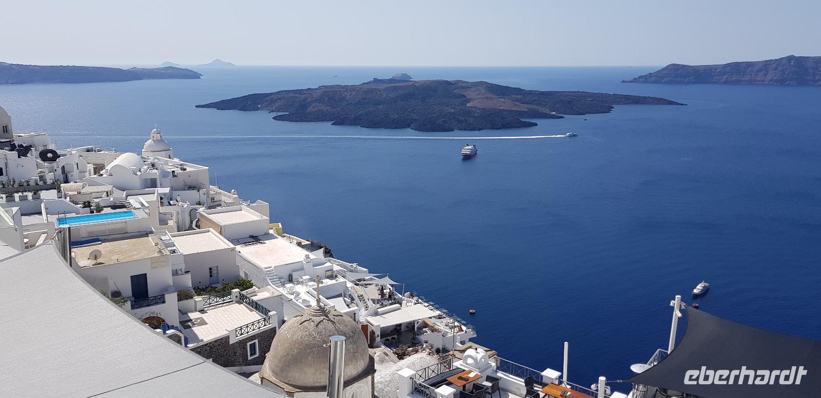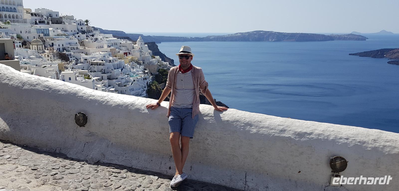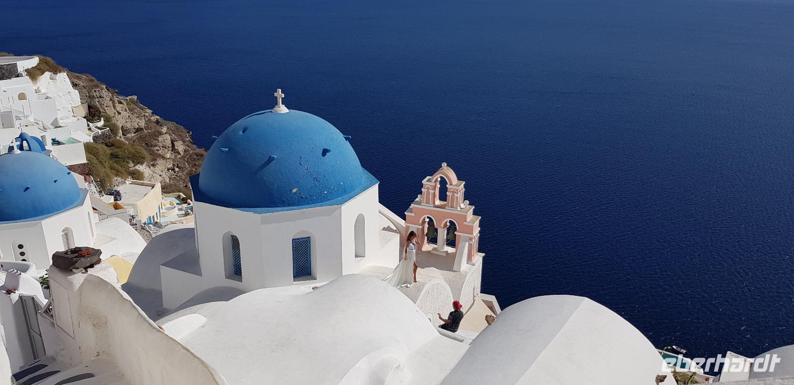 Am frühen Nachmittag fuhren wir noch zu einem weiteren Foto-Hotspot: zum Panathinaikos-Stadion am Stadtrand von Athen. Das Stadion war Schauplatz der ersten Olympischen Sommerspiele der Neuzeit im Jahr 1896 und ist ein beeindruckendes Denkmal der Antike. Unser kurzer Aufenthalt in Athen war damit schon vorbei, denn am Nachmittag ging es mit dem Flieger nach Santorin - eine der bekanntesten griechischen Inseln in einem Traum aus blau und weiß. Nach Ankunft und Check-In im Hotel verschafften wir uns einen ersten Eindruck der Umgebung bei einem Spaziergang zu unserem Restaurant für das Abendessen. Santorin versprüht einen wirklich einmaligen, zauberhaften Charme, alle Gäste waren direkt angetan.