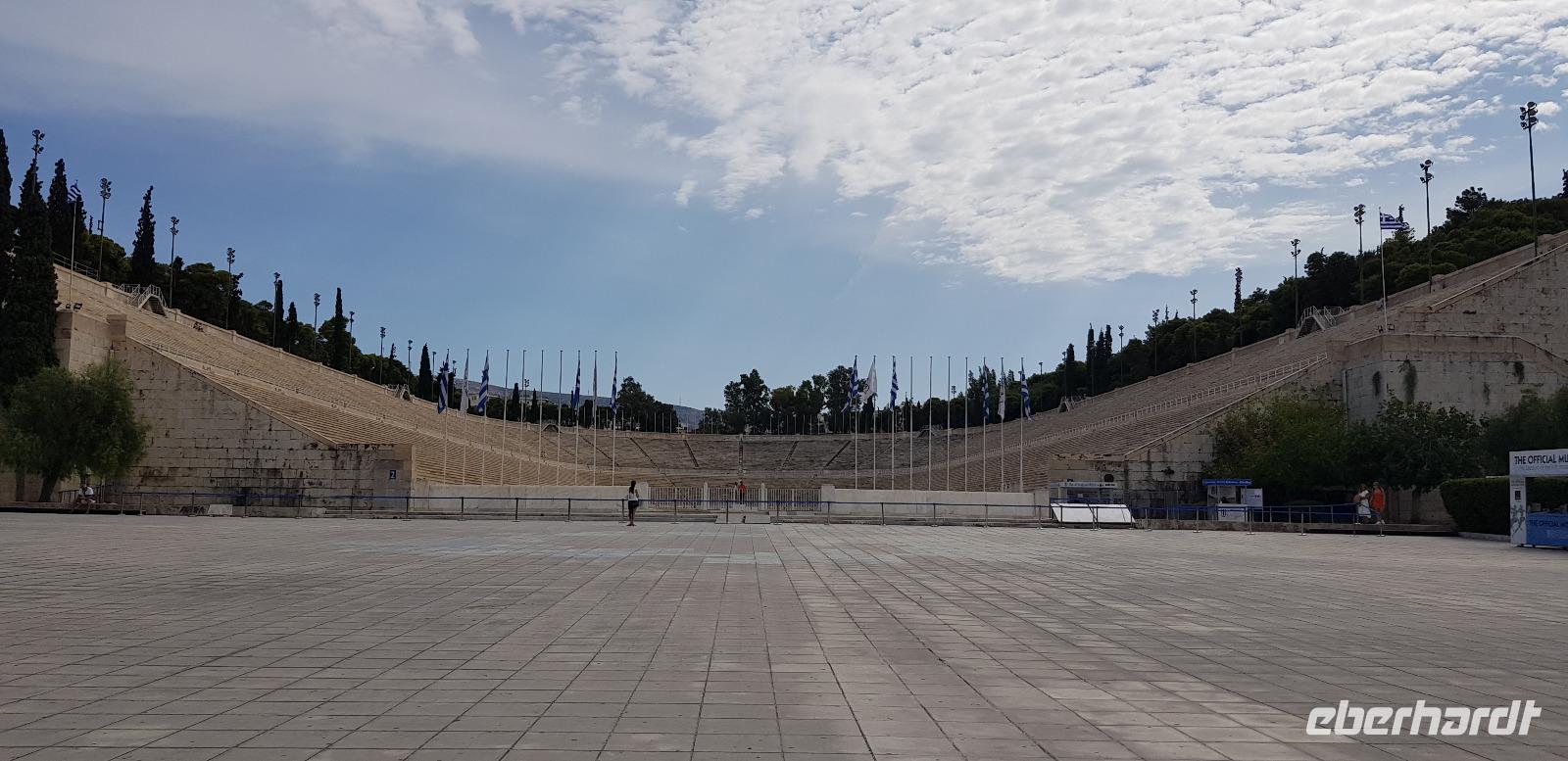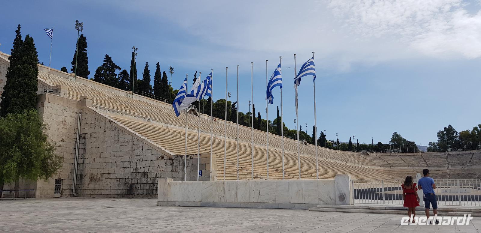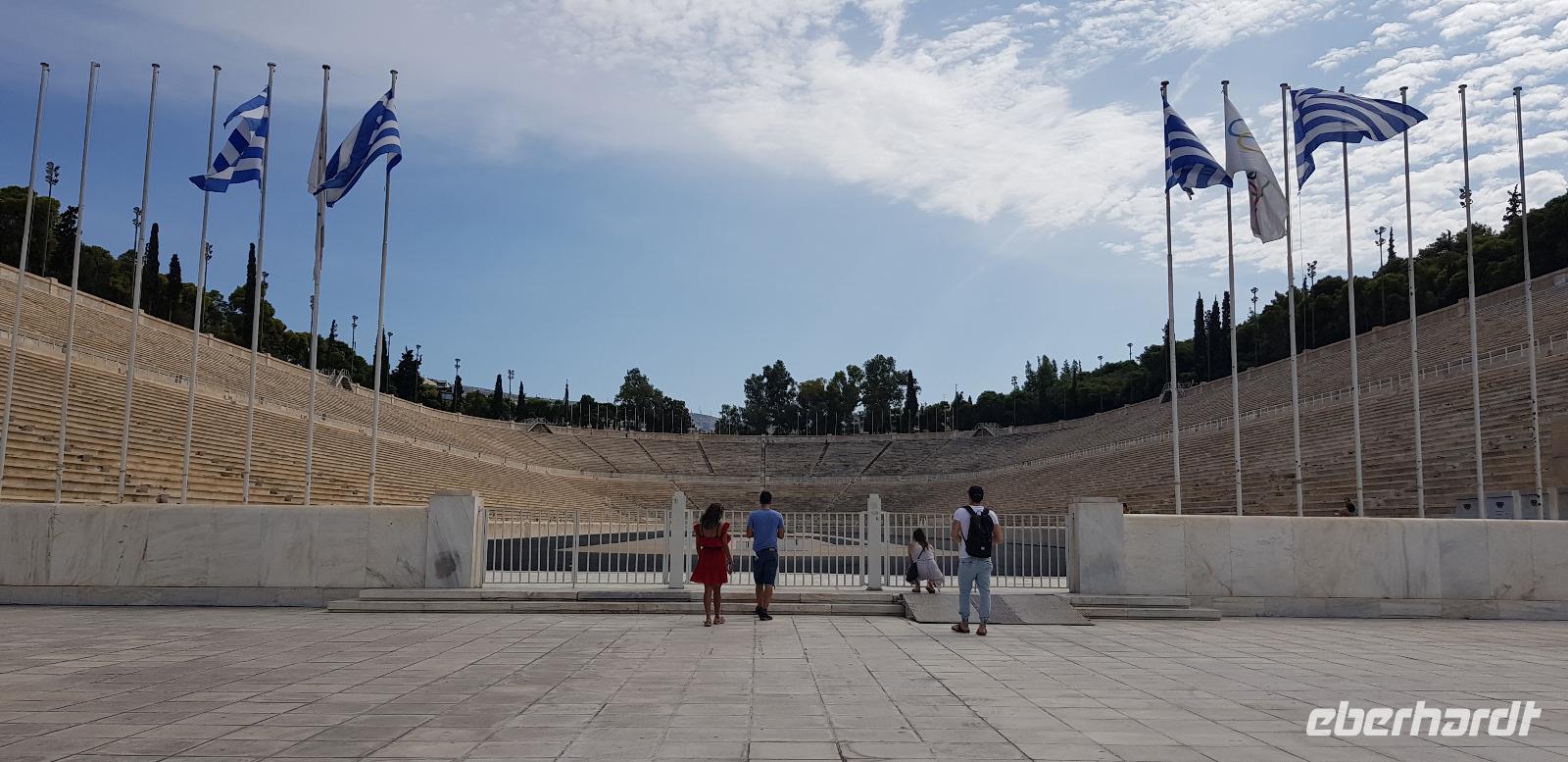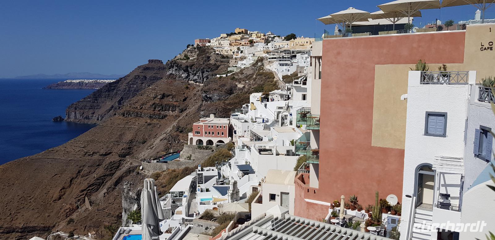 Am frühen Nachmittag fuhren wir noch zu einem weiteren Foto-Hotspot: zum Panathinaikos-Stadion am Stadtrand von Athen. Das Stadion war Schauplatz der ersten Olympischen Sommerspiele der Neuzeit im Jahr 1896 und ist ein beeindruckendes Denkmal der Antike. Unser kurzer Aufenthalt in Athen war damit schon vorbei, denn am Nachmittag ging es mit dem Flieger nach Santorin - eine der bekanntesten griechischen Inseln in einem Traum aus blau und weiß. Nach Ankunft und Check-In im Hotel verschafften wir uns einen ersten Eindruck der Umgebung bei einem Spaziergang zu unserem Restaurant für das Abendessen. Santorin versprüht einen wirklich einmaligen, zauberhaften Charme, alle Gäste waren direkt angetan.