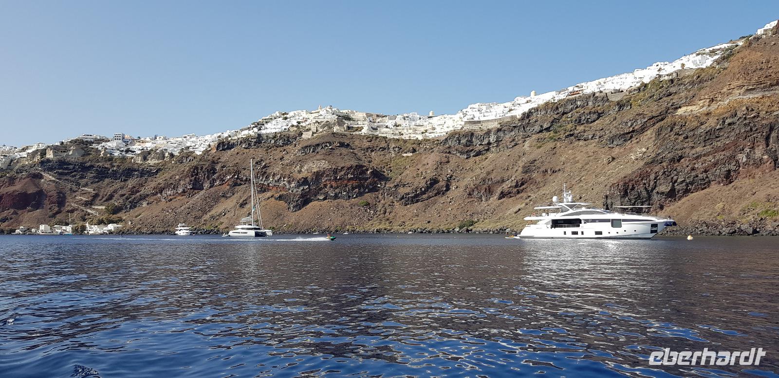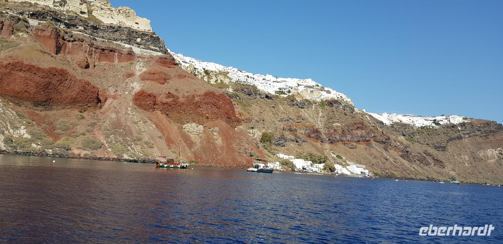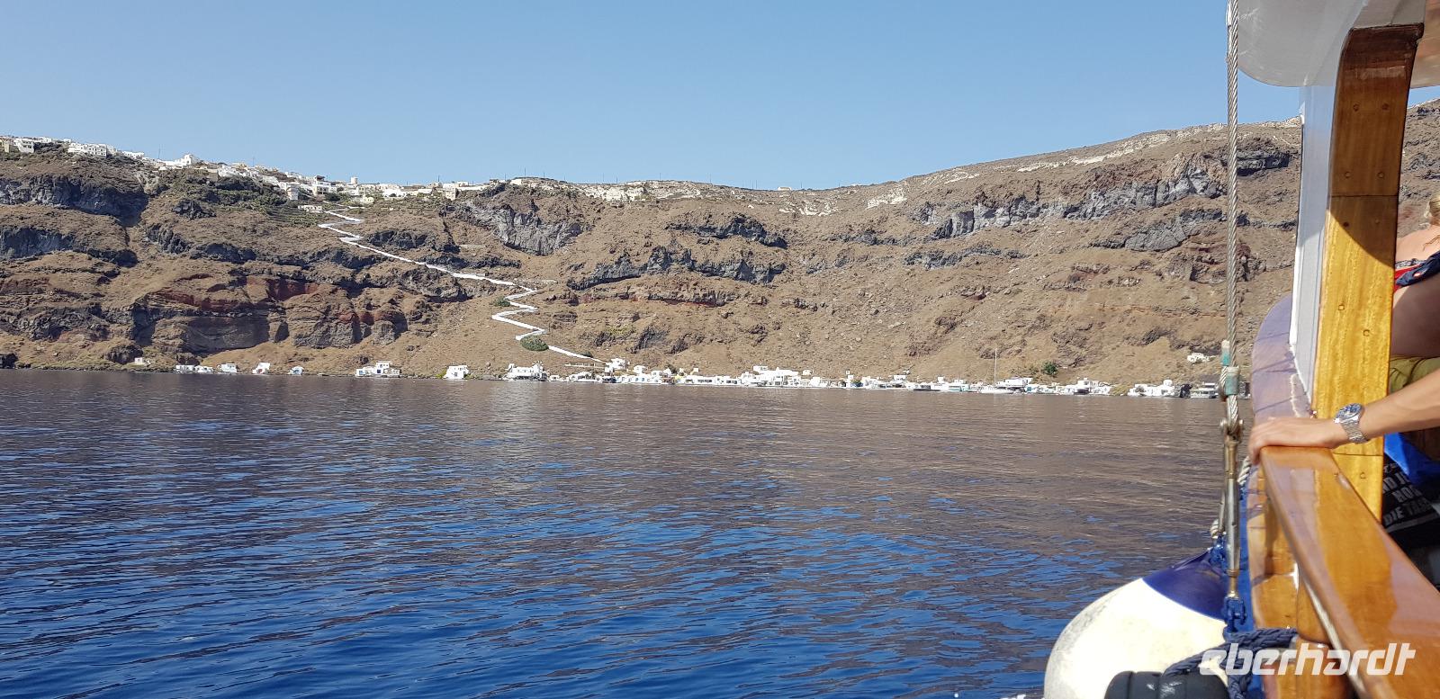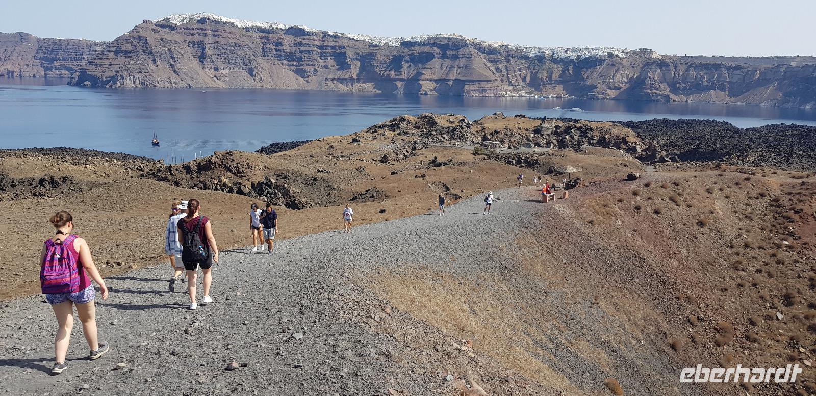An Tag 4 unserer Reise ging es mit 8 Gästen ab auf's Boot. Nach einer kurzen Fahrt auf die andere Seite der Insel, legte unser Ausflugsboot gegen 10 Uhr ab. Unser erster Stopp: Die Vulkan-Insel Nea Kameni. Hier hatten wir Zeit für den Aufstieg auf den Vulkangipfel und genossen sowohl dieses landschaftliche Highlight als auch den großartigen Ausblick. Um diese einzigartige Landschaft einzufangen. Hier ließ ich doch gleich einmal meine Videodrohne steigen tolle Fotos und Videos vom Vulkankrater aufzunehmen. ;-)