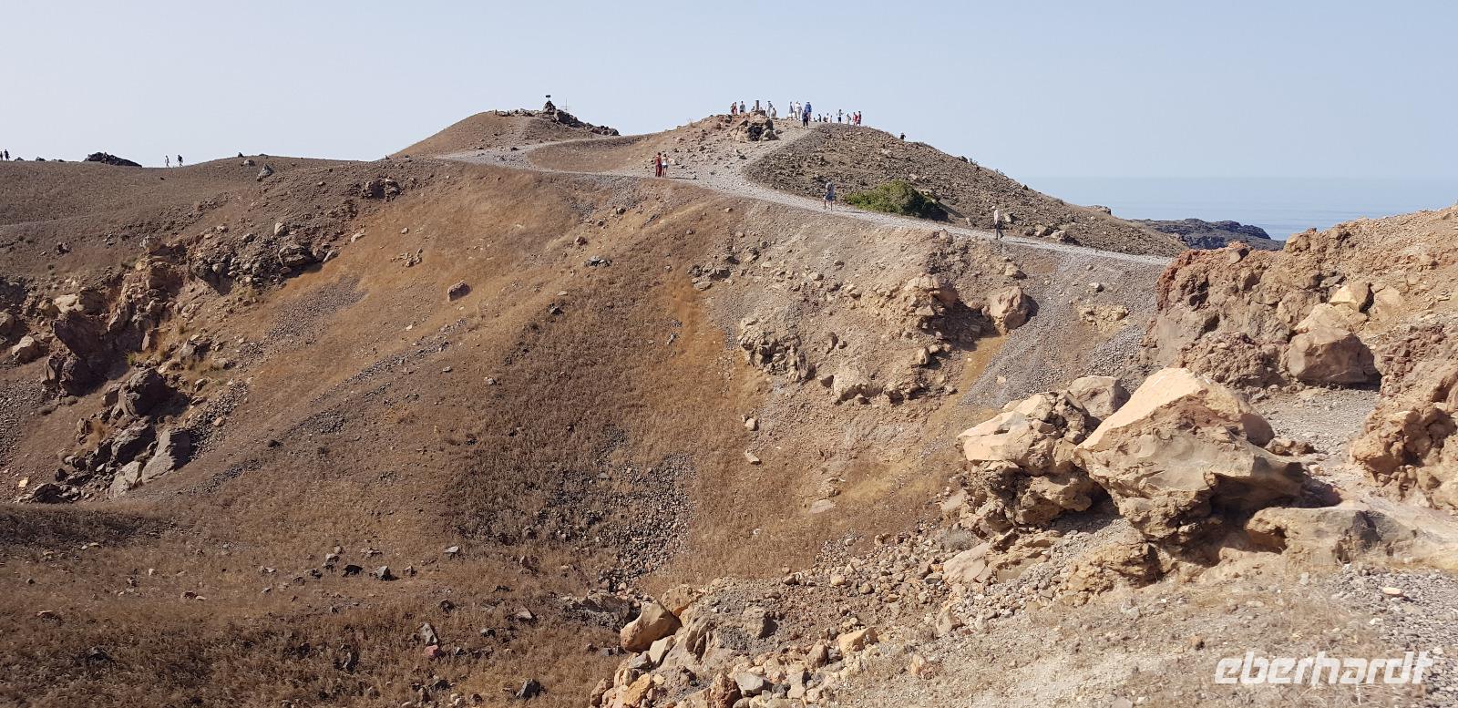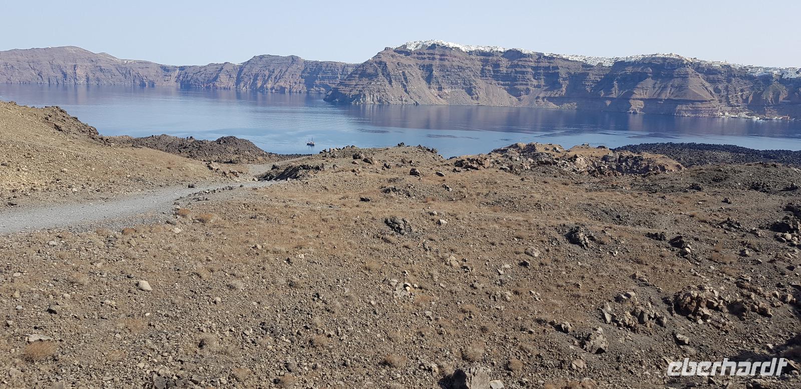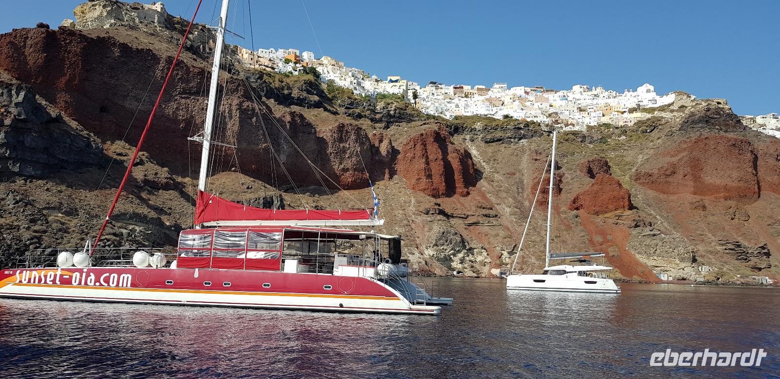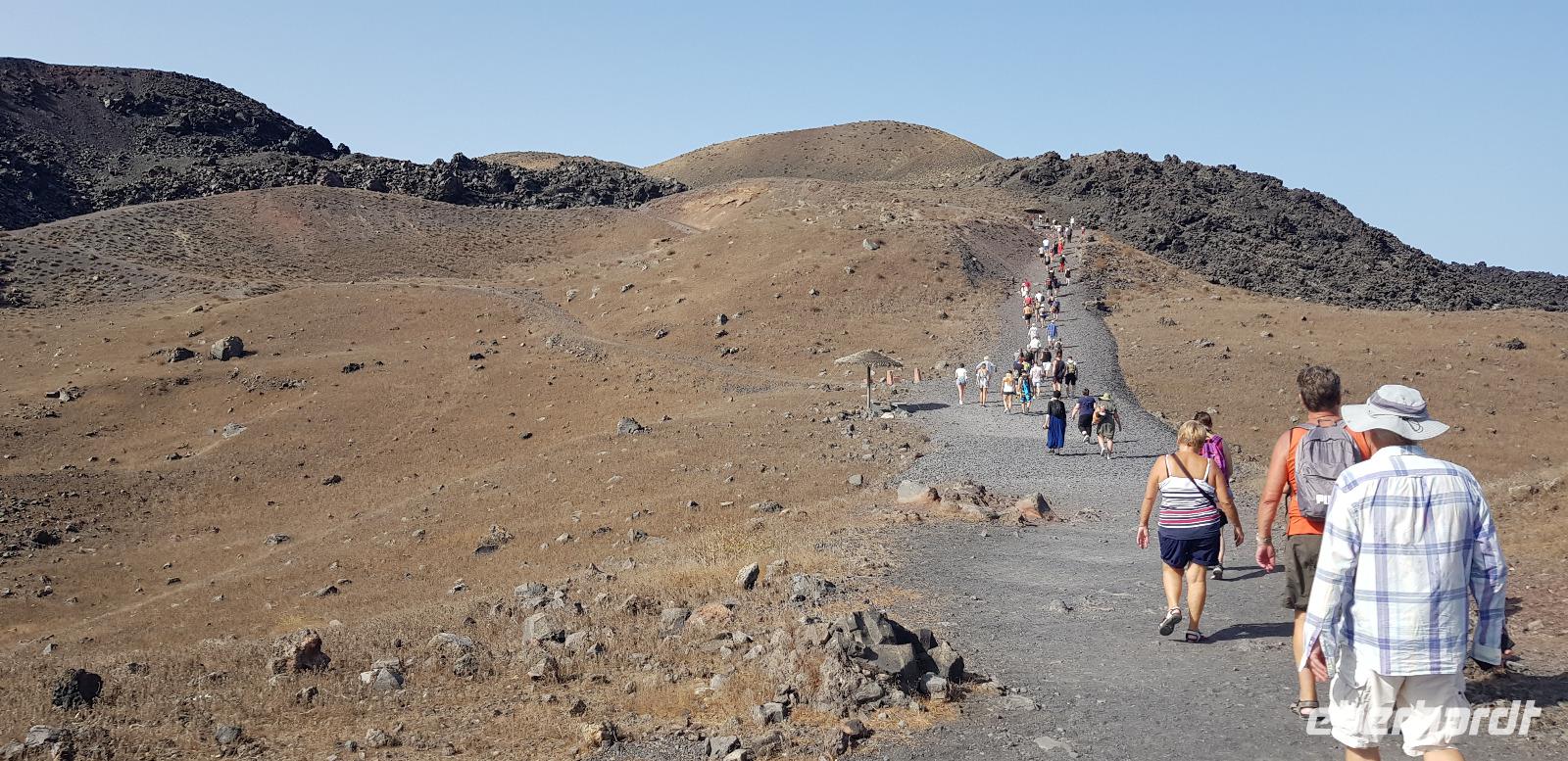An Tag 4 unserer Reise ging es mit 8 Gästen ab auf's Boot. Nach einer kurzen Fahrt auf die andere Seite der Insel, legte unser Ausflugsboot gegen 10 Uhr ab. Unser erster Stopp: Die Vulkan-Insel Nea Kameni. Hier hatten wir Zeit für den Aufstieg auf den Vulkangipfel und genossen sowohl dieses landschaftliche Highlight als auch den großartigen Ausblick. Um diese einzigartige Landschaft einzufangen. Hier ließ ich doch gleich einmal meine Videodrohne steigen tolle Fotos und Videos vom Vulkankrater aufzunehmen. ;-)