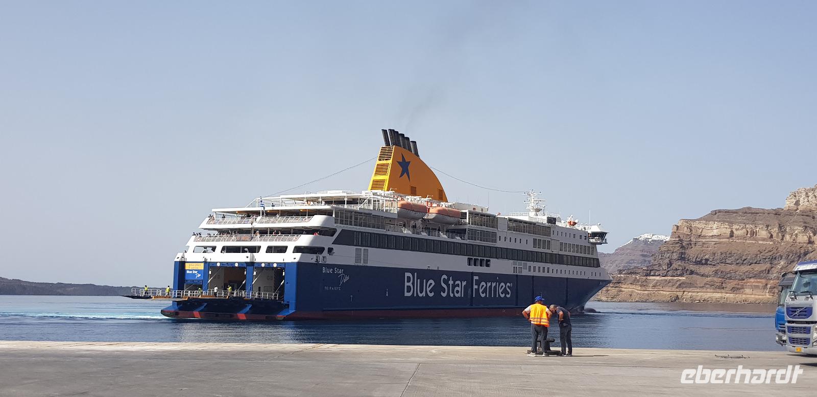 Mit gepackten Koffern reisten wir an Tag 5 unseres Griechenland-Trips weiter nach Alt-Thera, die antike Stadt auf dem Grat des 360 Meter hohen Berges Mesa Vouno.. Hier besuchten wir zunächst die historischen Ausgrabungsstätten. Wieder erklärte uns Anastasia alles Wissenswerte rund um dieses Kultur-Highlight. Anschließend ging es für die Gruppe in das beschauliche Dorf Pyrgos, wo die Gruppe Zeit zum Bummeln und Mittagessen hat. Um die nächste Insel auf der Reise zu erreichen, mussten wir die Blue Star Fähre vom Hafen in Santorin nehmen. Auch hier waren ausgefüllte Corona-Formulare, die am Vorabend ausgehändigt wurden, unausweichlich. Generell bemüht sich die griechische Regierung sehr um die Gesundheit der Urlauber und Urlauberinnen und versucht das Infektionsrisiko zu minimieren. Wir haben uns sehr sicher gefühlt.