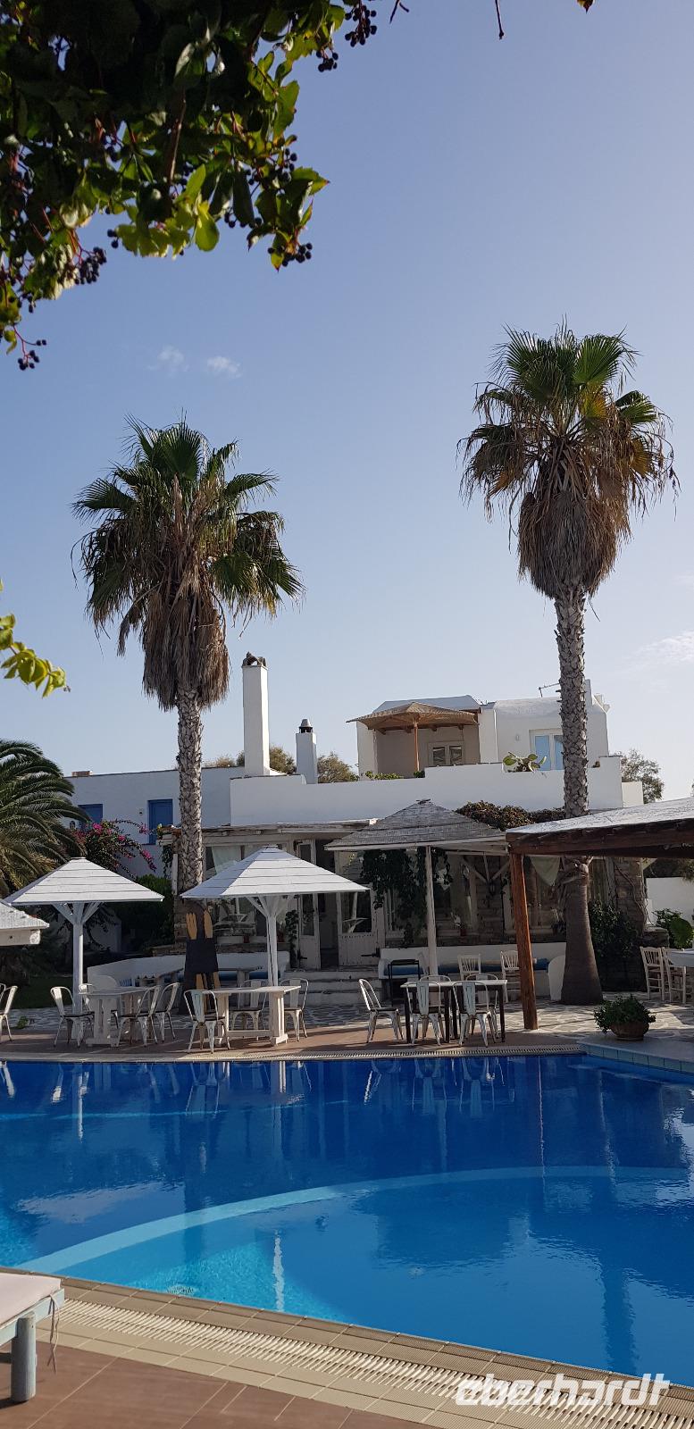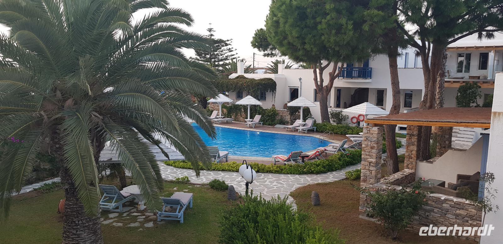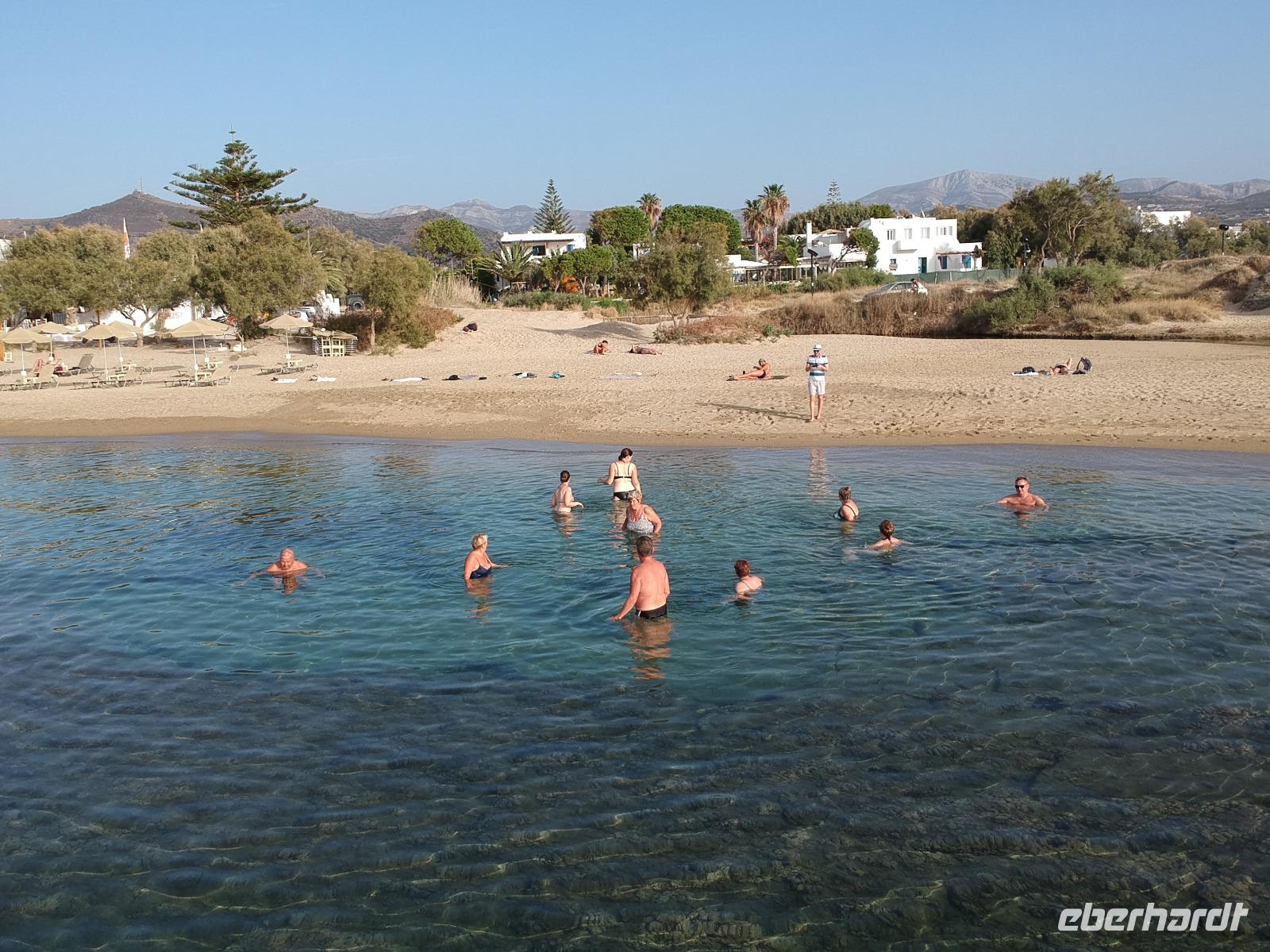 Nach einem kleinen Rundgang in dem beeindruckenden Gebäude hieß es danach Freizeit zum Bummeln und Mittagessen wer wollte. Anschließend traf sich die Gruppe am Nachmittag wieder um gemeinsam zur Unterkunft - dem „Zefi Hotel" in Naoussa zu fahren. Naoussa ist eine kleine Hafenstadt im Norden der Insel und bietet sich hervorragend zum Baden an. Einige Gäste nutzten die hervorragende Lage während der Freizeit am Nachmittag zum Entspannen am und im Mittelmeer. Nach dem gemeinsamen Abendessen verabschiedeten wir den Tag bei einem gemütlichen Glas Wein miteinander.