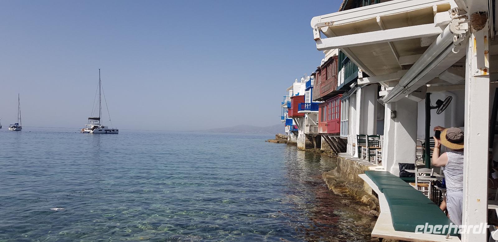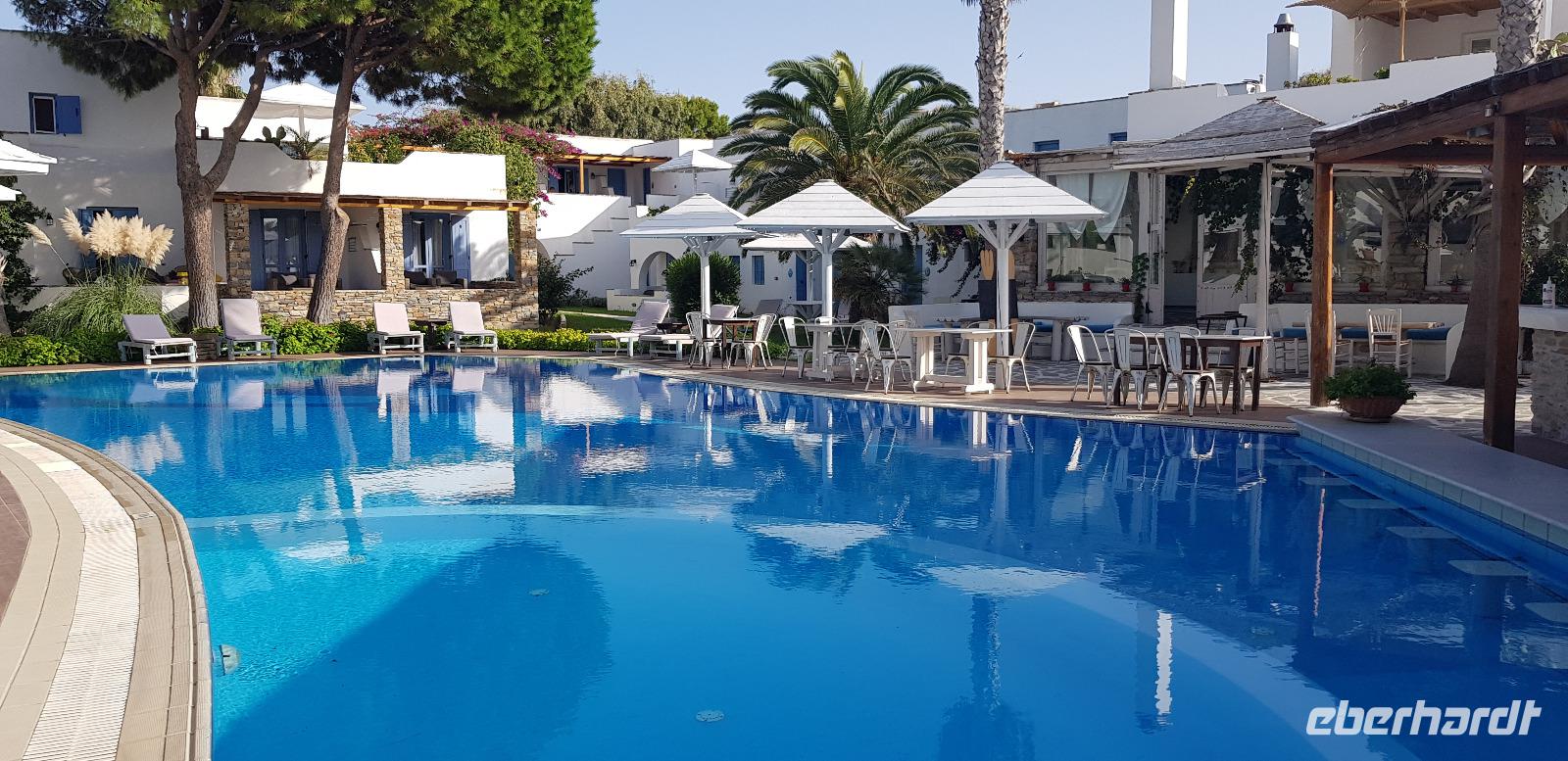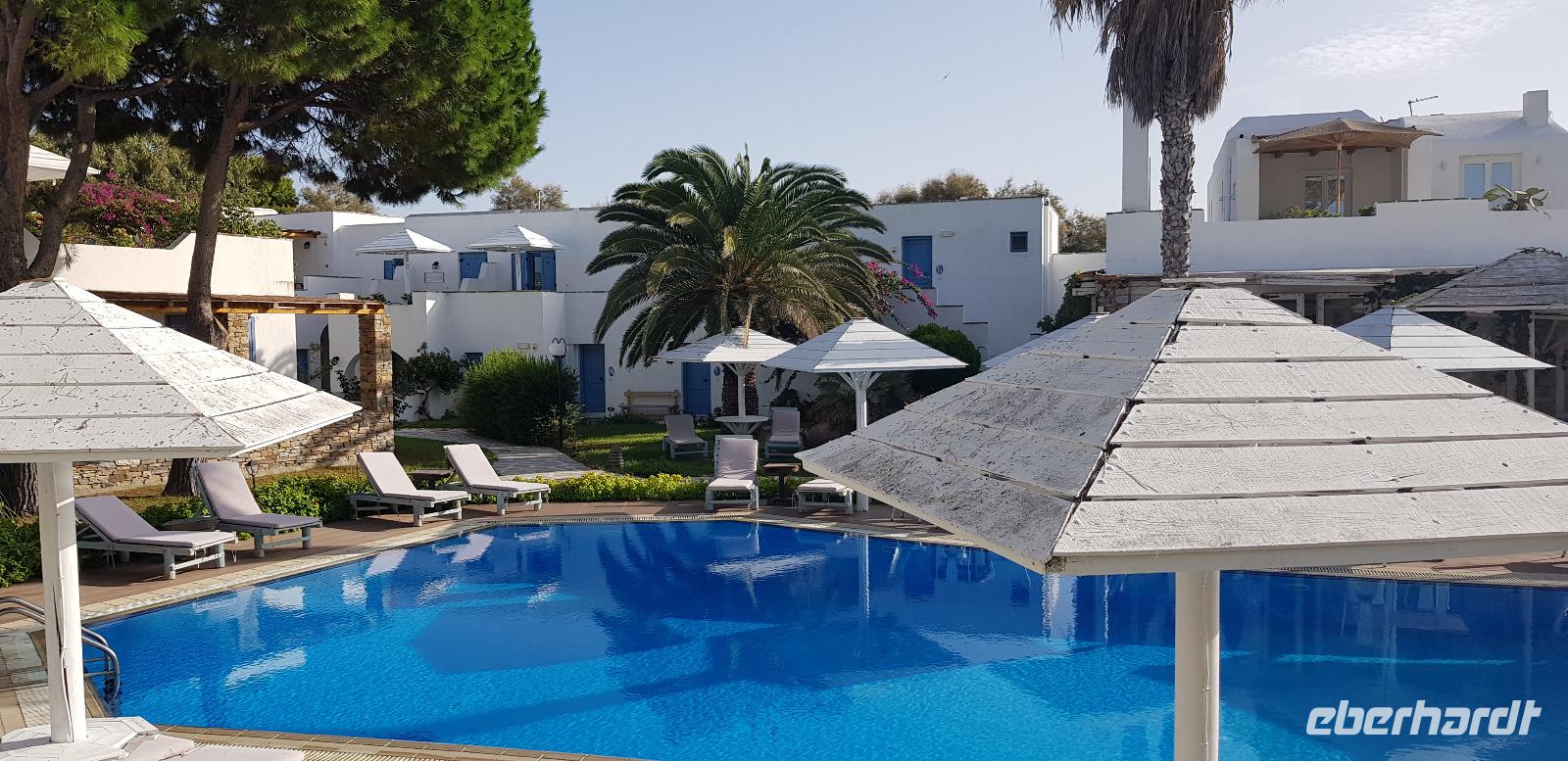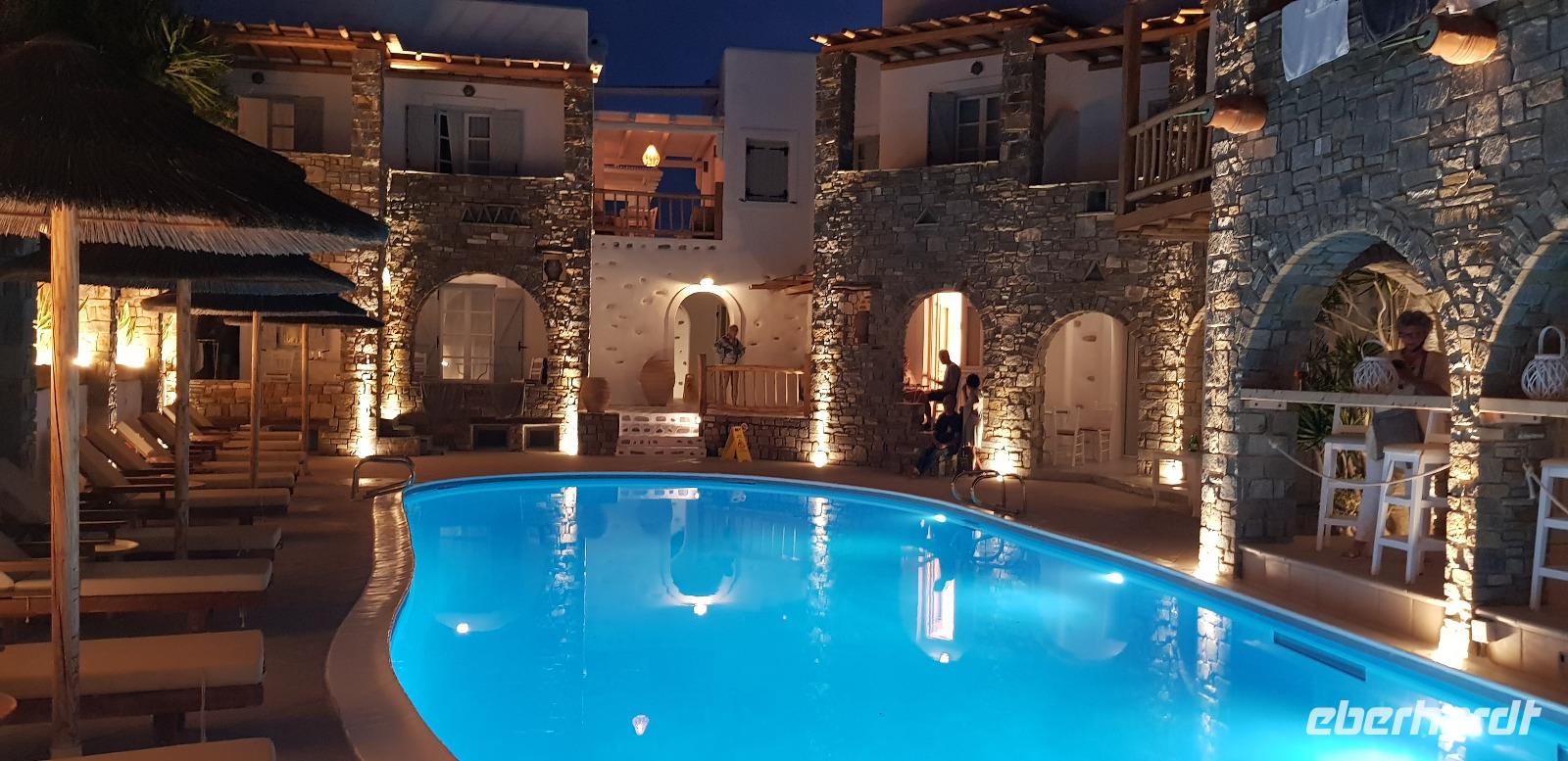 Nach einem kleinen Rundgang in dem beeindruckenden Gebäude hieß es danach Freizeit zum Bummeln und Mittagessen wer wollte. Anschließend traf sich die Gruppe am Nachmittag wieder um gemeinsam zur Unterkunft - dem „Zefi Hotel" in Naoussa zu fahren. Naoussa ist eine kleine Hafenstadt im Norden der Insel und bietet sich hervorragend zum Baden an. Einige Gäste nutzten die hervorragende Lage während der Freizeit am Nachmittag zum Entspannen am und im Mittelmeer. Nach dem gemeinsamen Abendessen verabschiedeten wir den Tag bei einem gemütlichen Glas Wein miteinander.