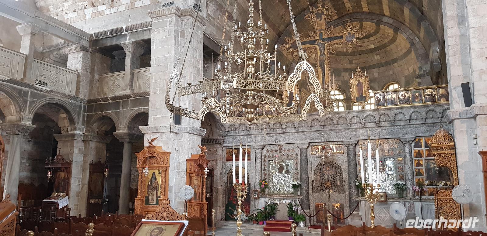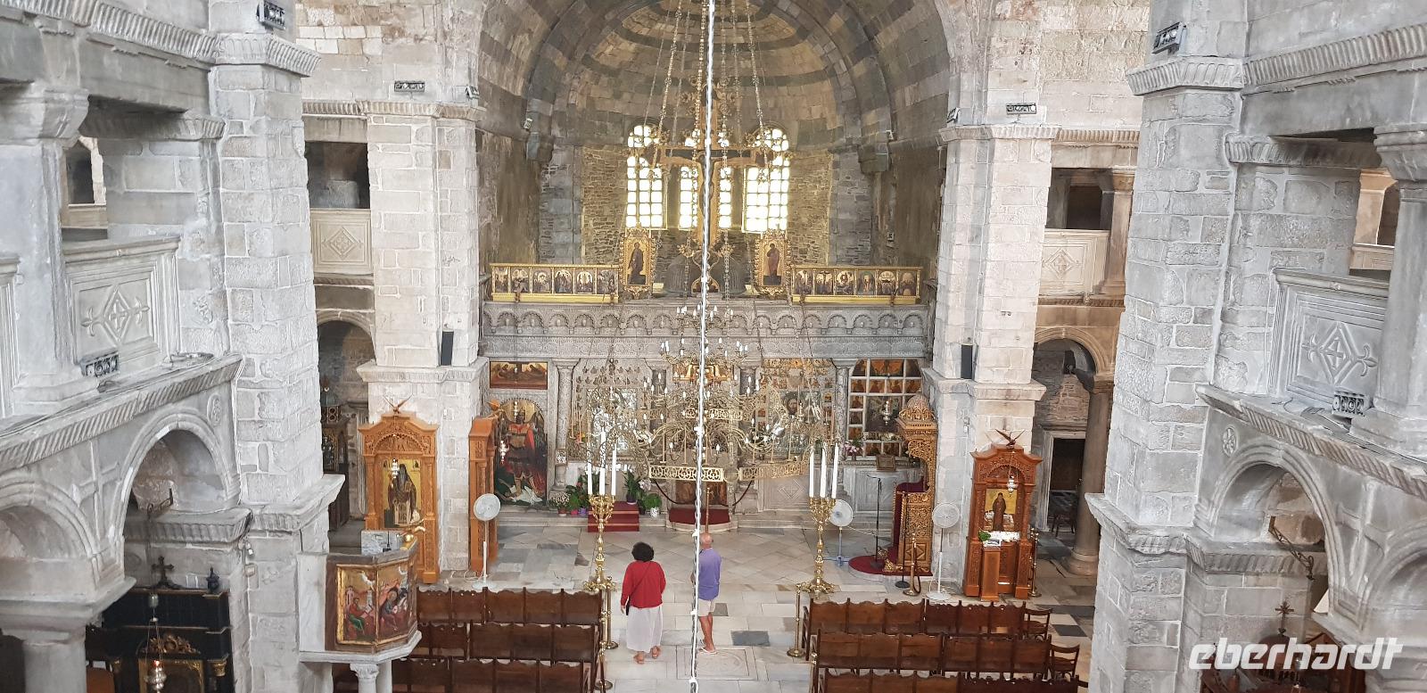 Weiter ging es mit unserem Reisebus zum verlassenen Marathi Marmor Steinbruch, wo uns Anastasia einiges über den Marmor Abbau erklärte. In der Antike galt der Marmor als Rohstoff für Skulpturen und Tempelanlagen, heute sind die meisten Marmorsteinbrüche stillgelegt und dienen mehr als Touristenattraktionen. Weiter ging es mit dem Bus ins idyllische Bergdorf Lefkes, wo als erstes auch wieder ein entspannter Rundgang anstand. Das Highlight zum Schluss ist die beeindruckende „Agia Triada" Kirche aus dem Jahr 1835. Die dreischiffige Basilika ist die zweitgrößte Kirche der Insel und Motiv vieler Postkarten. Leider kommen wir nicht hinein aber alleine der Anblick von außen verzauberte uns alle. Anschließend kehrten wir etwas weiter oberhalb vom Dorf in ein Grill Restaurant ein, um uns eine entspannte Mittagspause zu gönnen. Nach einem Ouzo auf Kosten von Herrn Eberhardt, ging es weiter ins nächste Bergdorf nach Maripissa. Auch hier unternahmen wir einen gemütlichen Spaziergang durch die engen Gassen, wo es nach jeder Ecke etwas Neues zu entdecken gab. Für die Fotografen ein echtes Eldorado. :-)