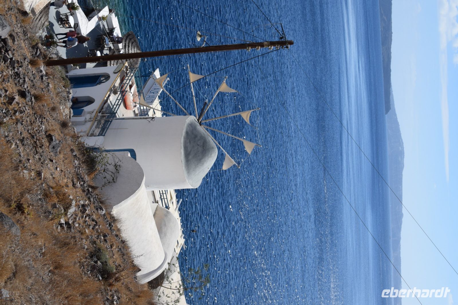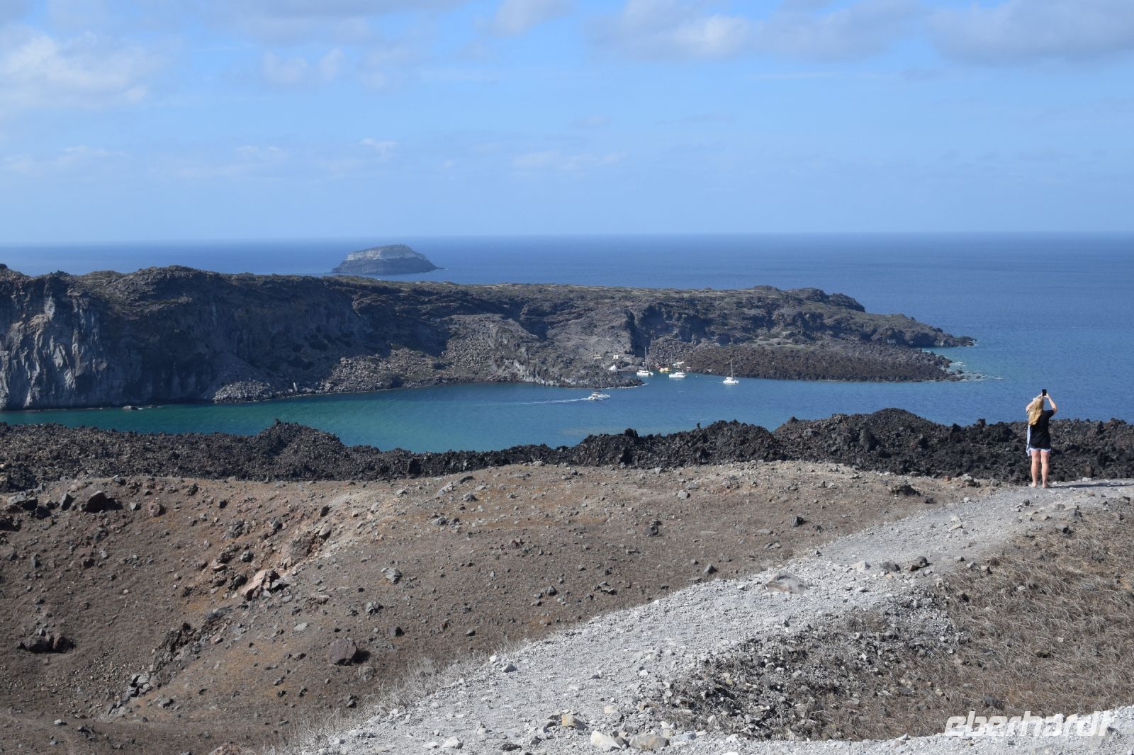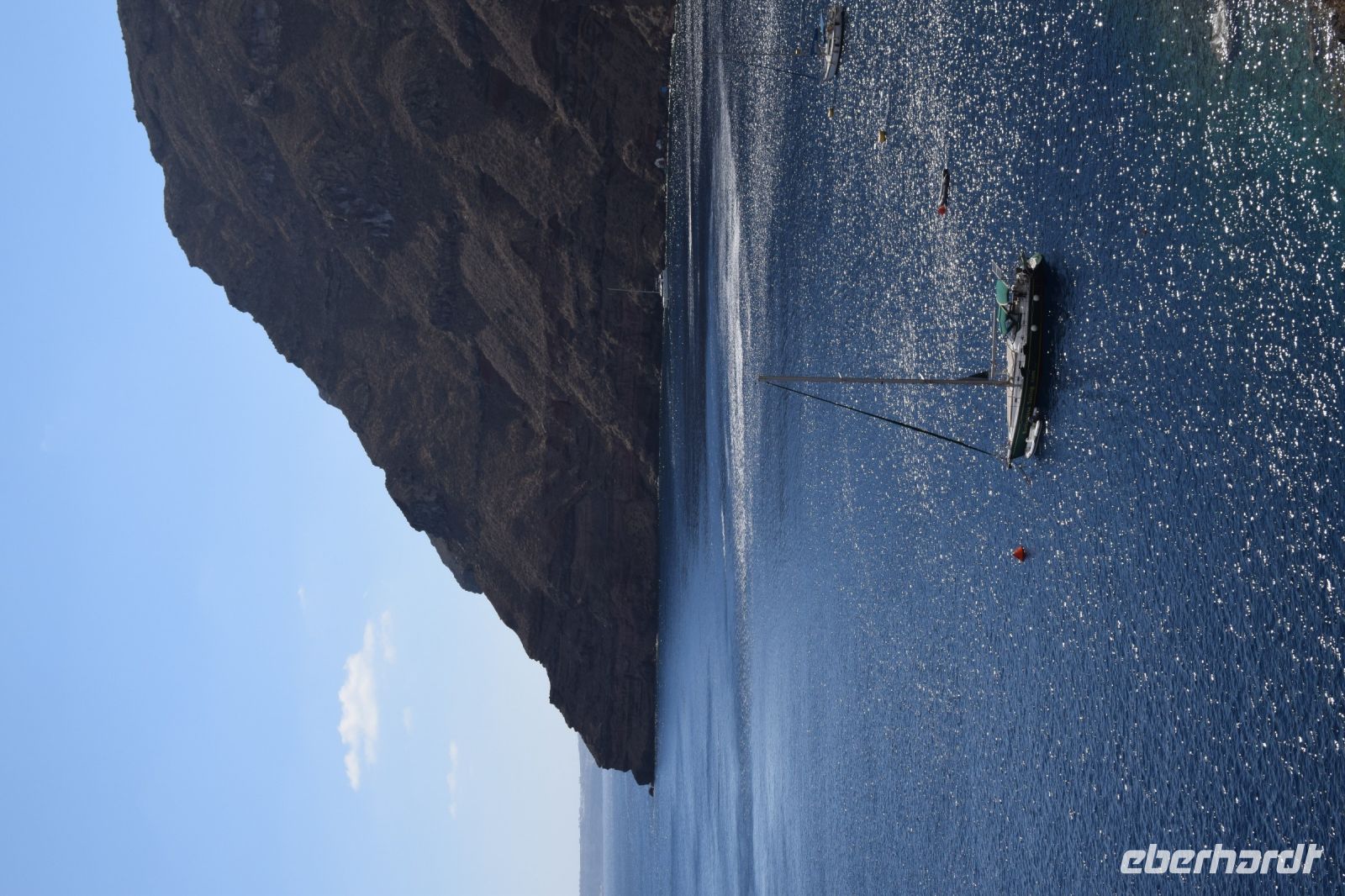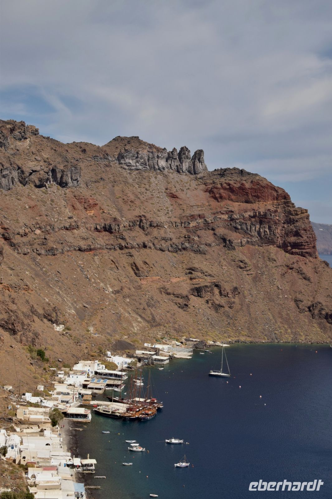 Am vierten Tag unsere Reise, stand der erste fakultative Ausflug zu den Kameni-Inseln an. Fast alle nahmen daran teil. Die anderen legten heute einen entspannten Tag am wunderschönen Strand von Kamari ein. Zuerst fuhr uns der Bus mit zum Inselhafen von Santorin. Hier erwartet uns, dass Ausflugsboot, welcher in der Art an ein Segelschiff erinnerte. Mit leichten Seegang durch den Wind bedingt, fuhren wir als Erstes nach Nea-Kameni um den Krater der Caldera zu besuchen. Der Aufstieg zum Krater war etwas mühsam, wurde aber mit einen wunderbaren Blick belohnt. Zudem konnte man noch ein paar Schwefelaustritte sehen, welche auf die leichte Aktivität noch verweist. Nachdem alle wieder an Bord waren, schipperten wir weiter um die Insel und ankerten auf der Rückseite von Nea Kameni. Wer mutig war und Badesachen dabei hatte, konnte ins Wasser springen und zu einer heißen Quelle in der Nähe der Insel schwimmen. Einige unserer Gruppen wagten den Sprung ins kühle Nass und kamen danach begeistert zurück. Zum Abschluss fuhren wir noch zum westlichen Inselteil der Caldera, genannt Theresia. Wer noch Kraft hatte, konnte sich die steile Treppe hinauf zum Ort Manolas wagen. Alle anderen blieben am Hafen und genossen ein leckeres Mittag mit Blick auf Santorin und Nea Kameni. Am späten Nachmittag legte das Boot wieder in Richtung Santorin ab und fuhr entlang der Küste, um noch einmal den Blick auf Oia und Fira aus einer anderen Perspektive zu haben. Das Abendessen gab es wieder in unserer Taverne vom Vortag. Diesmal wurde als Hauptgang ein vorzüglicher Fisch gereicht und wir genossen den letzten Abend auf Santorin.