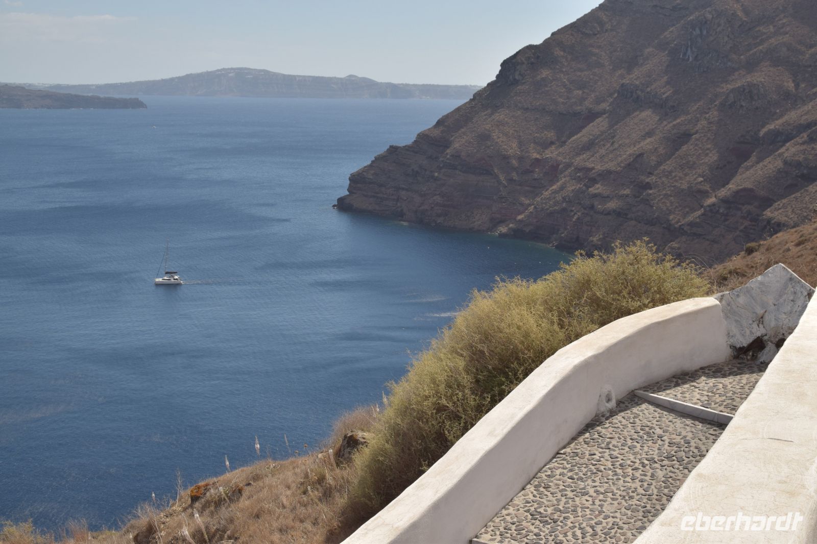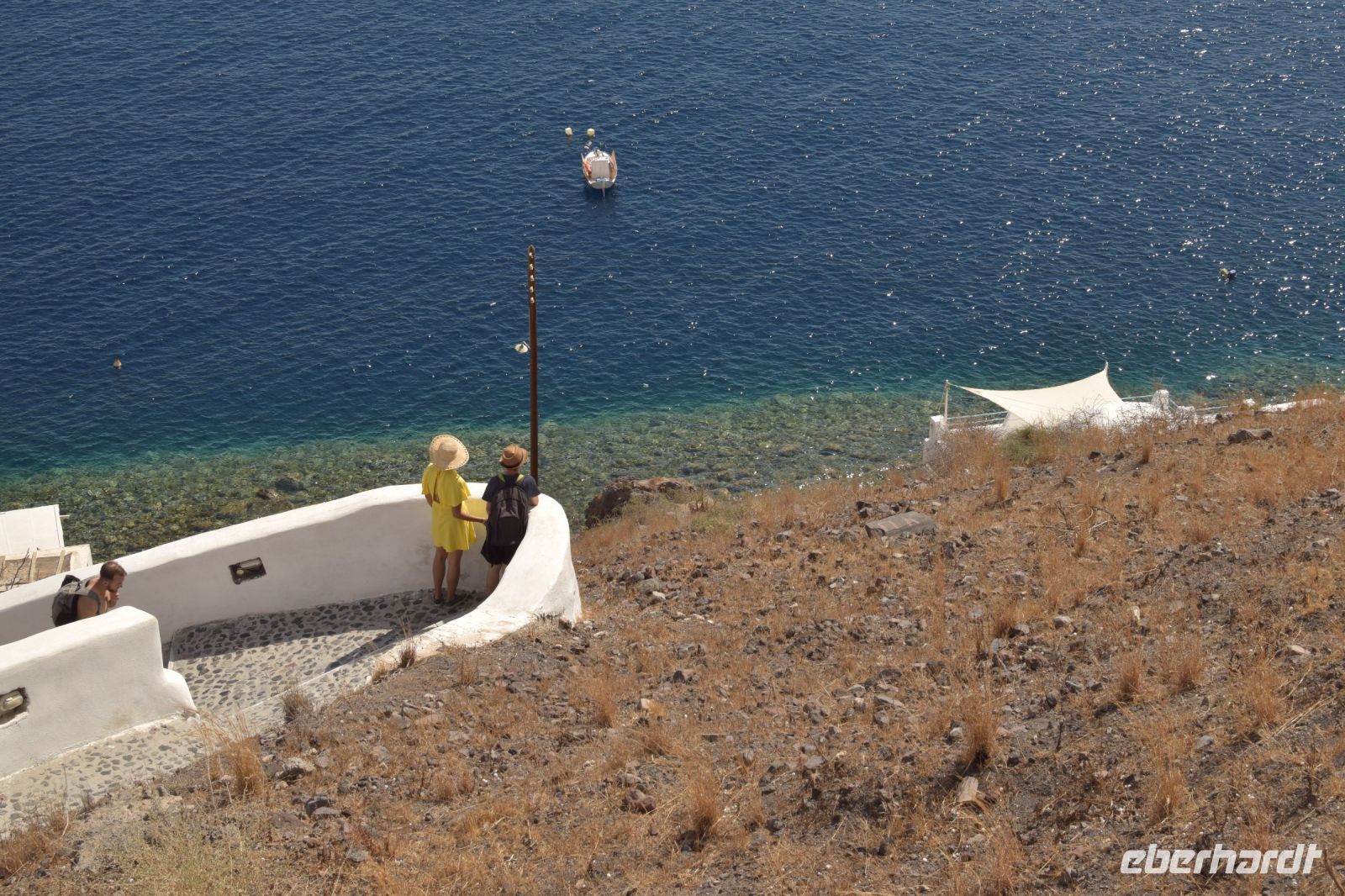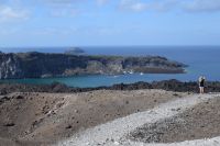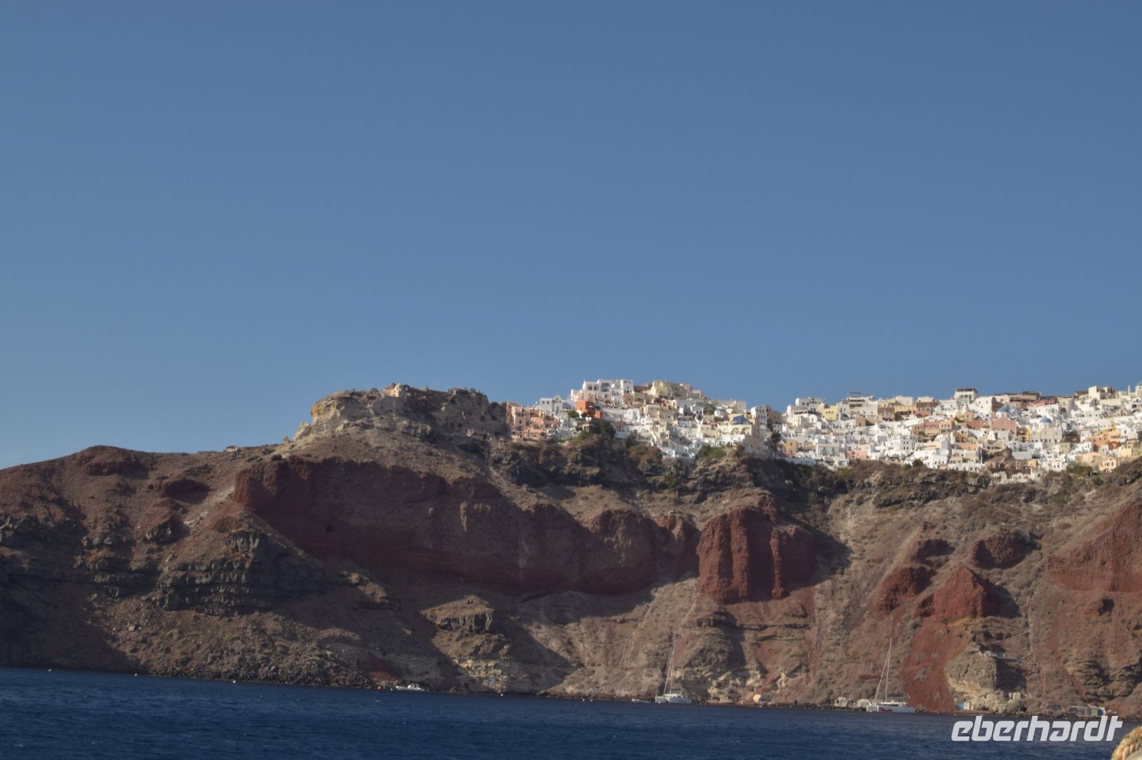 Am vierten Tag unsere Reise, stand der erste fakultative Ausflug zu den Kameni-Inseln an. Fast alle nahmen daran teil. Die anderen legten heute einen entspannten Tag am wunderschönen Strand von Kamari ein. Zuerst fuhr uns der Bus mit zum Inselhafen von Santorin. Hier erwartet uns, dass Ausflugsboot, welcher in der Art an ein Segelschiff erinnerte. Mit leichten Seegang durch den Wind bedingt, fuhren wir als Erstes nach Nea-Kameni um den Krater der Caldera zu besuchen. Der Aufstieg zum Krater war etwas mühsam, wurde aber mit einen wunderbaren Blick belohnt. Zudem konnte man noch ein paar Schwefelaustritte sehen, welche auf die leichte Aktivität noch verweist. Nachdem alle wieder an Bord waren, schipperten wir weiter um die Insel und ankerten auf der Rückseite von Nea Kameni. Wer mutig war und Badesachen dabei hatte, konnte ins Wasser springen und zu einer heißen Quelle in der Nähe der Insel schwimmen. Einige unserer Gruppen wagten den Sprung ins kühle Nass und kamen danach begeistert zurück. Zum Abschluss fuhren wir noch zum westlichen Inselteil der Caldera, genannt Theresia. Wer noch Kraft hatte, konnte sich die steile Treppe hinauf zum Ort Manolas wagen. Alle anderen blieben am Hafen und genossen ein leckeres Mittag mit Blick auf Santorin und Nea Kameni. Am späten Nachmittag legte das Boot wieder in Richtung Santorin ab und fuhr entlang der Küste, um noch einmal den Blick auf Oia und Fira aus einer anderen Perspektive zu haben. Das Abendessen gab es wieder in unserer Taverne vom Vortag. Diesmal wurde als Hauptgang ein vorzüglicher Fisch gereicht und wir genossen den letzten Abend auf Santorin.