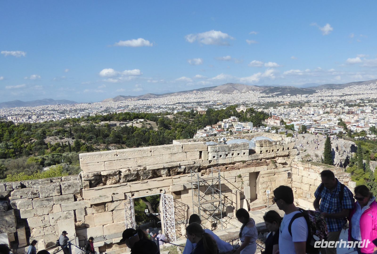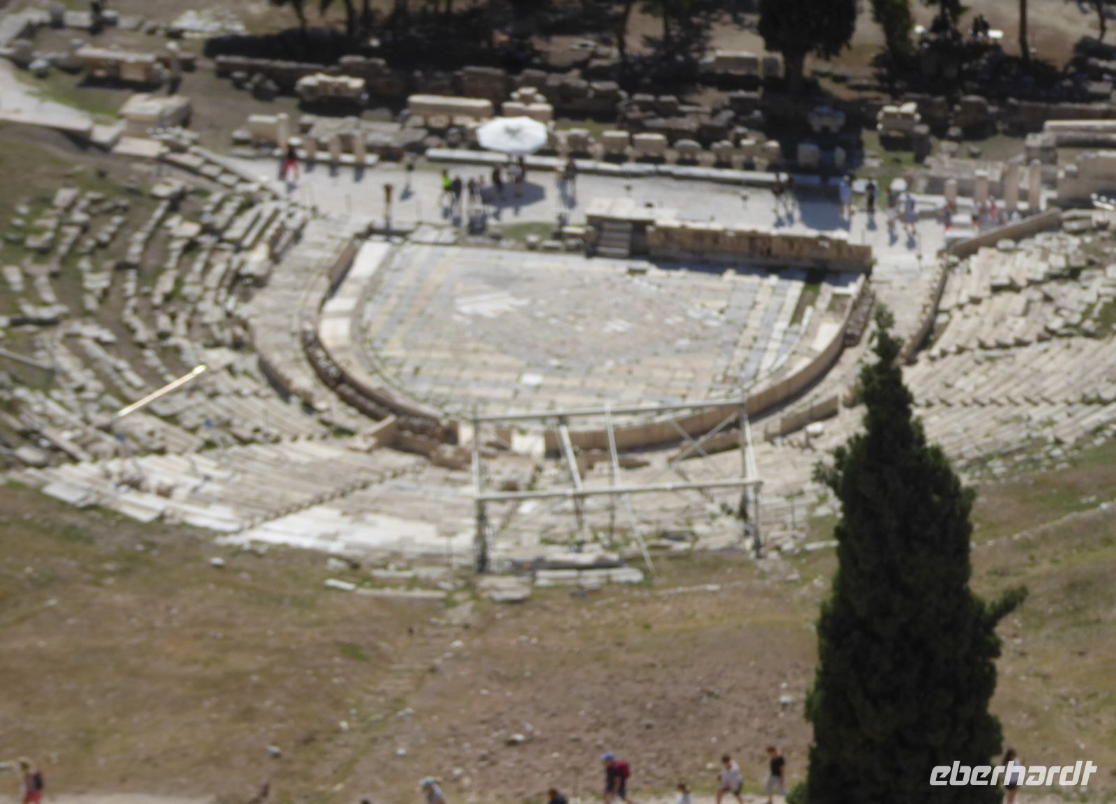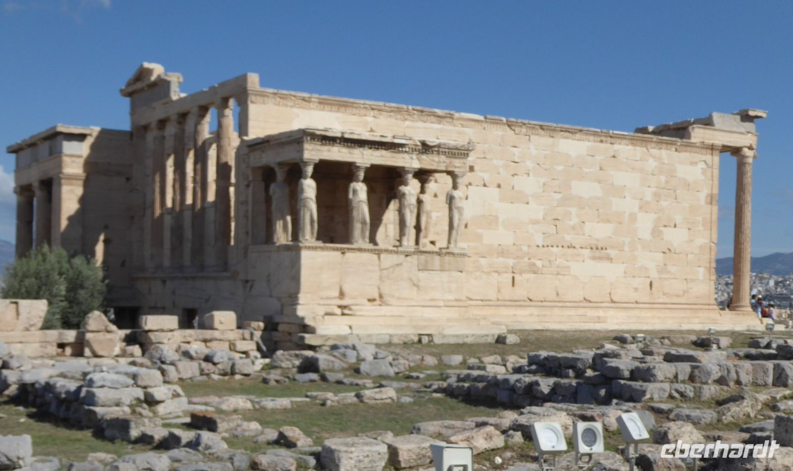 Nach dem sehr langen Tag gestern können wir es heute etwas ruhiger angehen lassen. Das Frühstück in diesem doch in die Jahre gekommenden Hotels ist sehr gut. Also: gemütlich frühstücken und auf Athen freuen. Erst um 10.00 h laden wir wieder unsere Koffer in den Bus, da wir das Hotel nochmal wechseln, um die letzte Nacht im bereits bekannten Hotel Titania zu verbringen. Aber vorher wartet die griechische Landeshauptstadt auf uns. Wir beginnen mit der Akropolis, dem Wahrzeichen der Stadt. Unser Guide Nikkos führt uns auf den Hügel und erklärt die verschiedenen Tempel, besonders natürlich den Parthenon, den Tempel der Göttin Pallas Athena Parthenos. Dann die Propyläen, den Tempel der Athena Nike, das Erechtheion mit den Karyatiden, sowie das von oben sichtbare Theater des Dionysius.