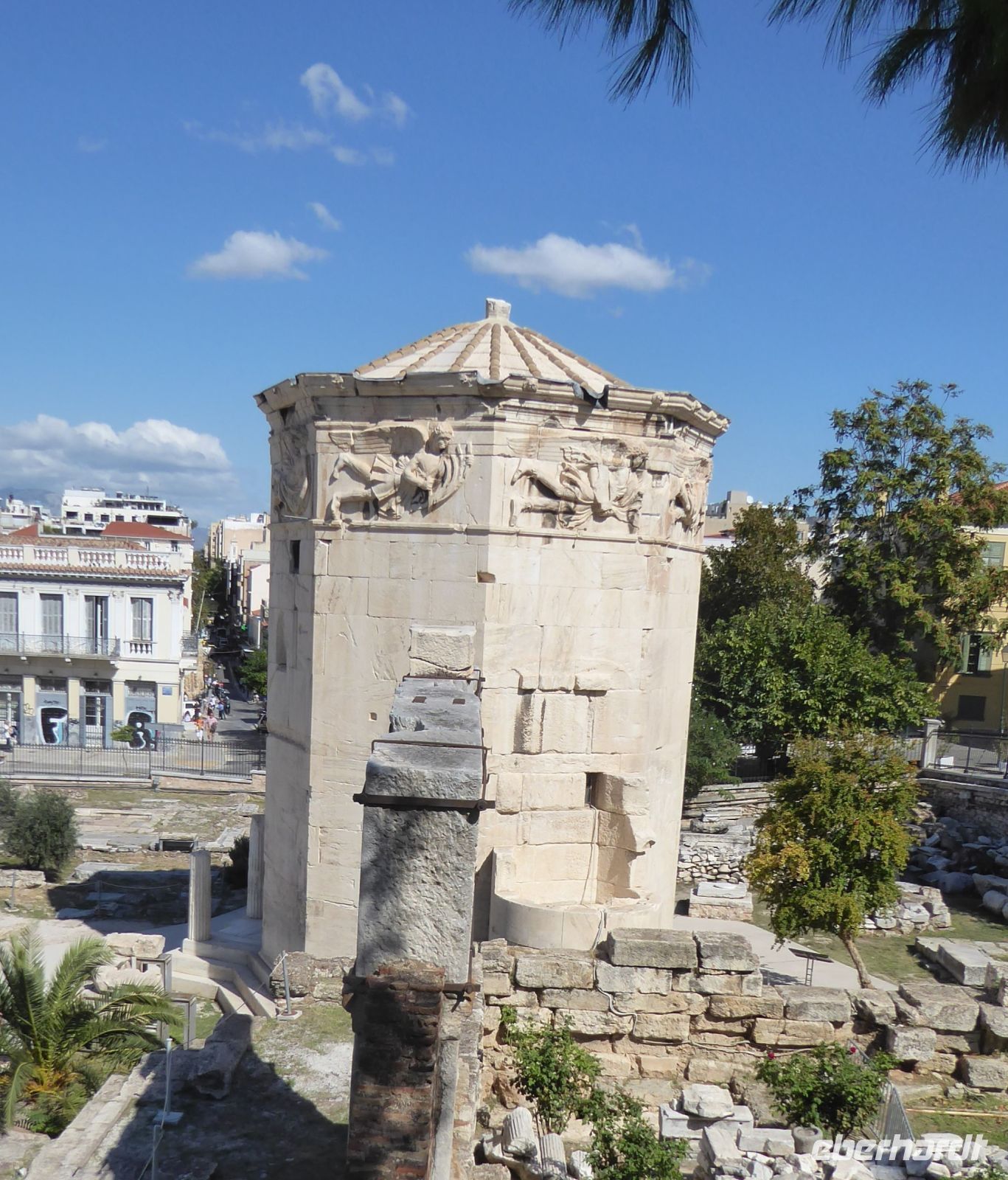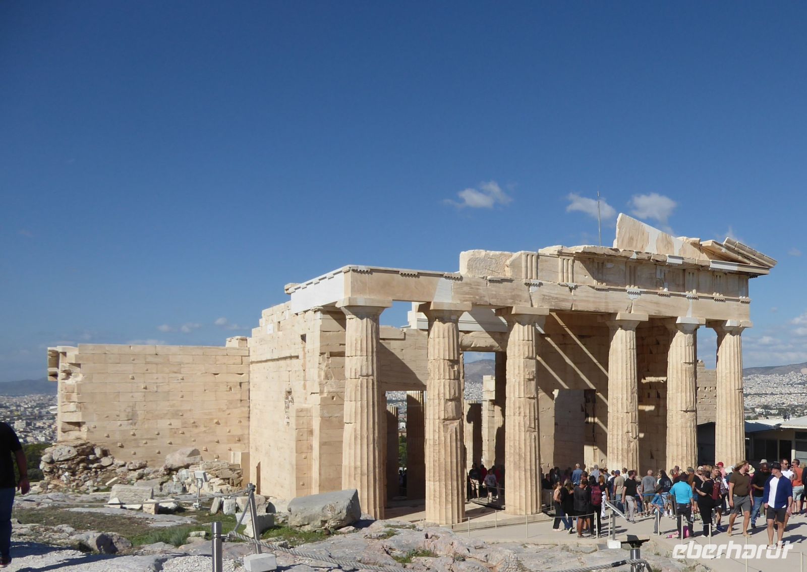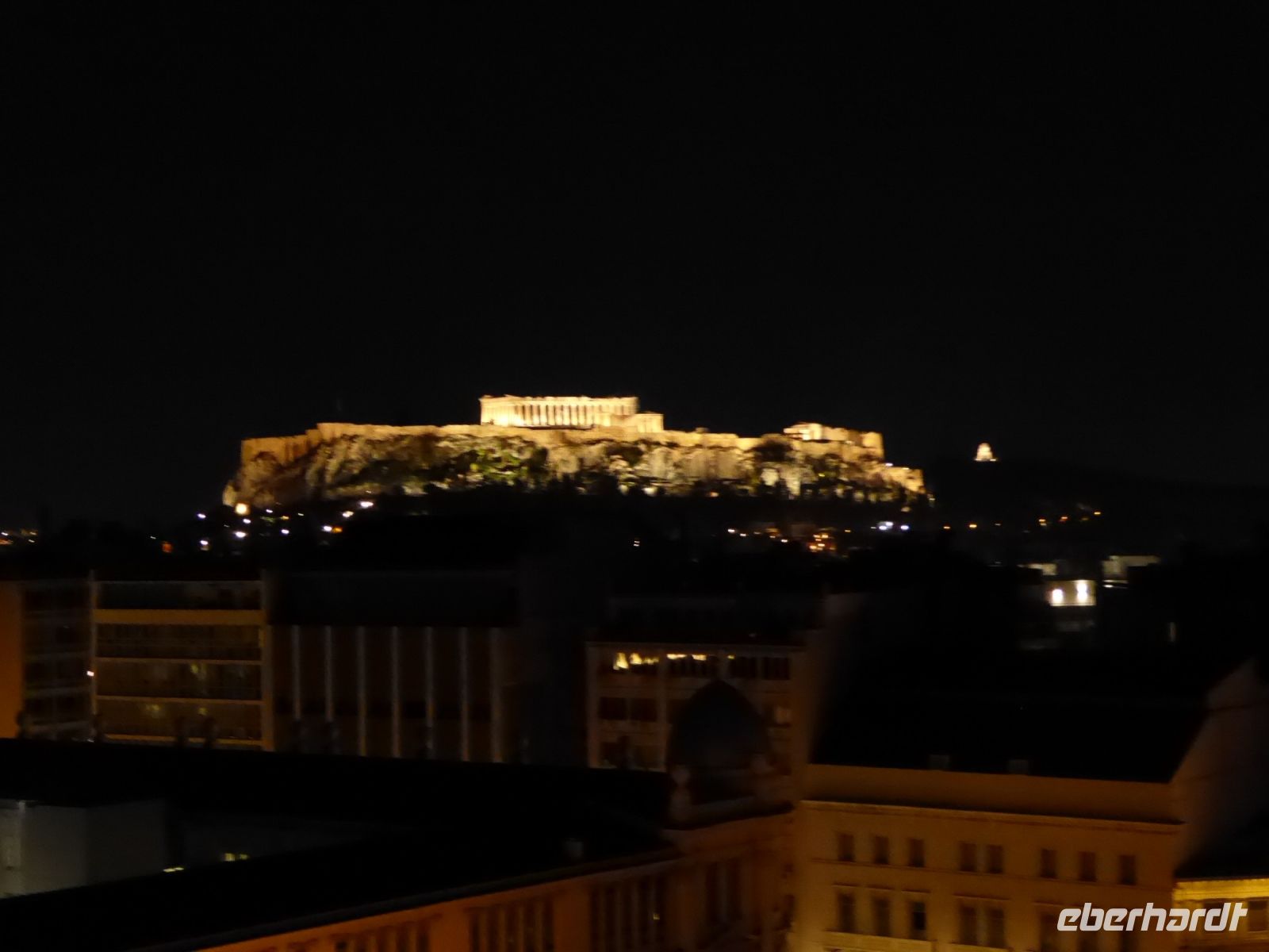 Nach dem sehr langen Tag gestern können wir es heute etwas ruhiger angehen lassen. Das Frühstück in diesem doch in die Jahre gekommenden Hotels ist sehr gut. Also: gemütlich frühstücken und auf Athen freuen. Erst um 10.00 h laden wir wieder unsere Koffer in den Bus, da wir das Hotel nochmal wechseln, um die letzte Nacht im bereits bekannten Hotel Titania zu verbringen. Aber vorher wartet die griechische Landeshauptstadt auf uns. Wir beginnen mit der Akropolis, dem Wahrzeichen der Stadt. Unser Guide Nikkos führt uns auf den Hügel und erklärt die verschiedenen Tempel, besonders natürlich den Parthenon, den Tempel der Göttin Pallas Athena Parthenos. Dann die Propyläen, den Tempel der Athena Nike, das Erechtheion mit den Karyatiden, sowie das von oben sichtbare Theater des Dionysius.