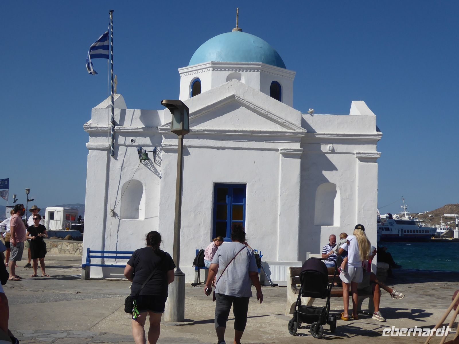 Um 14.00 h brachte uns unser Ausflugsboot die kurze Strecke hinüber nach Mykonos, eine der Tourismus-Hochburgen Griechenlands. Wir verbrachten unsere Zeit im malerischen Chora/Hora/Mykonos Stadt. Nikkos führte uns vom Hafen durch die Gassen zwischen weißgetünchten Kubushäuschen zur Panagie-Paraportani-Kirche, die aus 5 einzelnen Kirchen zu diesem heutigen Komplex „zusammen gewachsen“ ist.