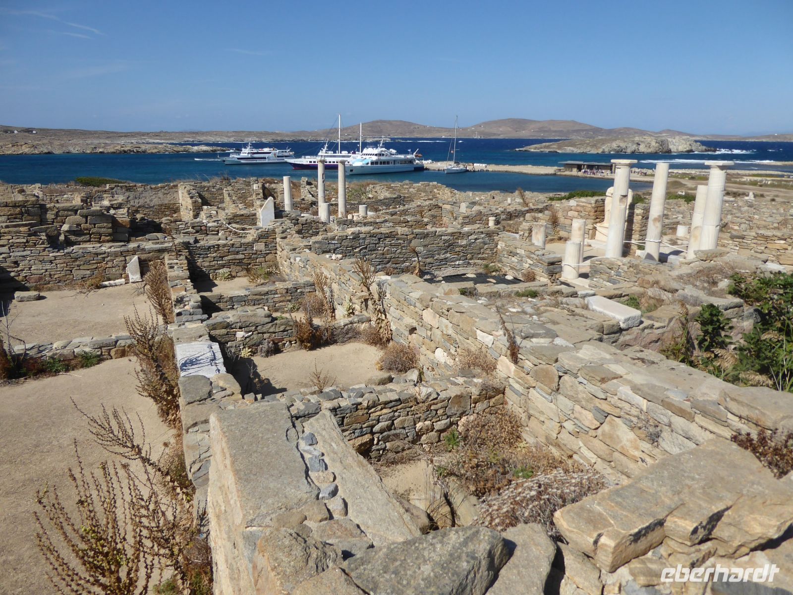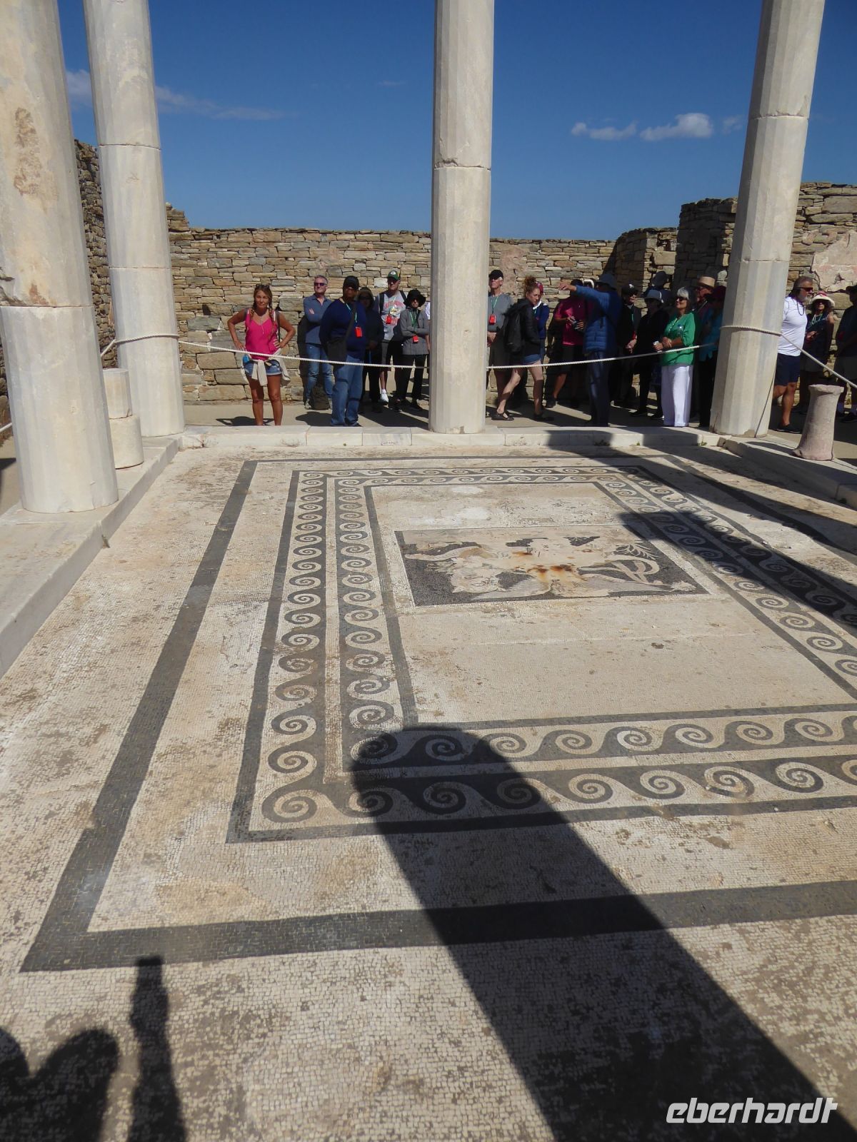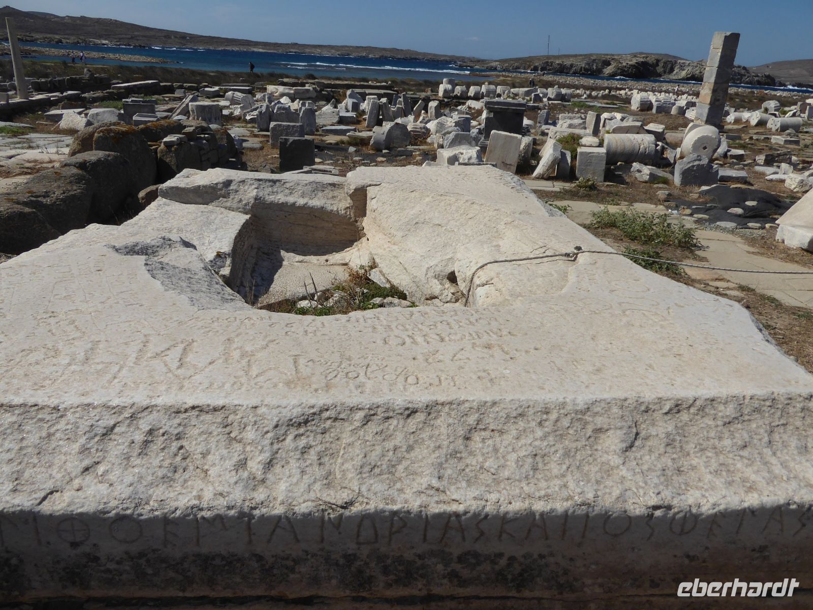 Kurz vor Mittag erreichte das Schiff den Hafen der unbewohnten Insel Delos. Der Geschichte nach war diese Insel das Zentrum der Kykladen, Geburtsstätte der antiken Götter Apollon und Artemis – eine heilige Insel, auf der Sterbliche nicht gestorben und nicht geboren werden durften. Die ganze Insel ist seit 1990 auf der Liste der UNESCO als Weltkulturerbe.
