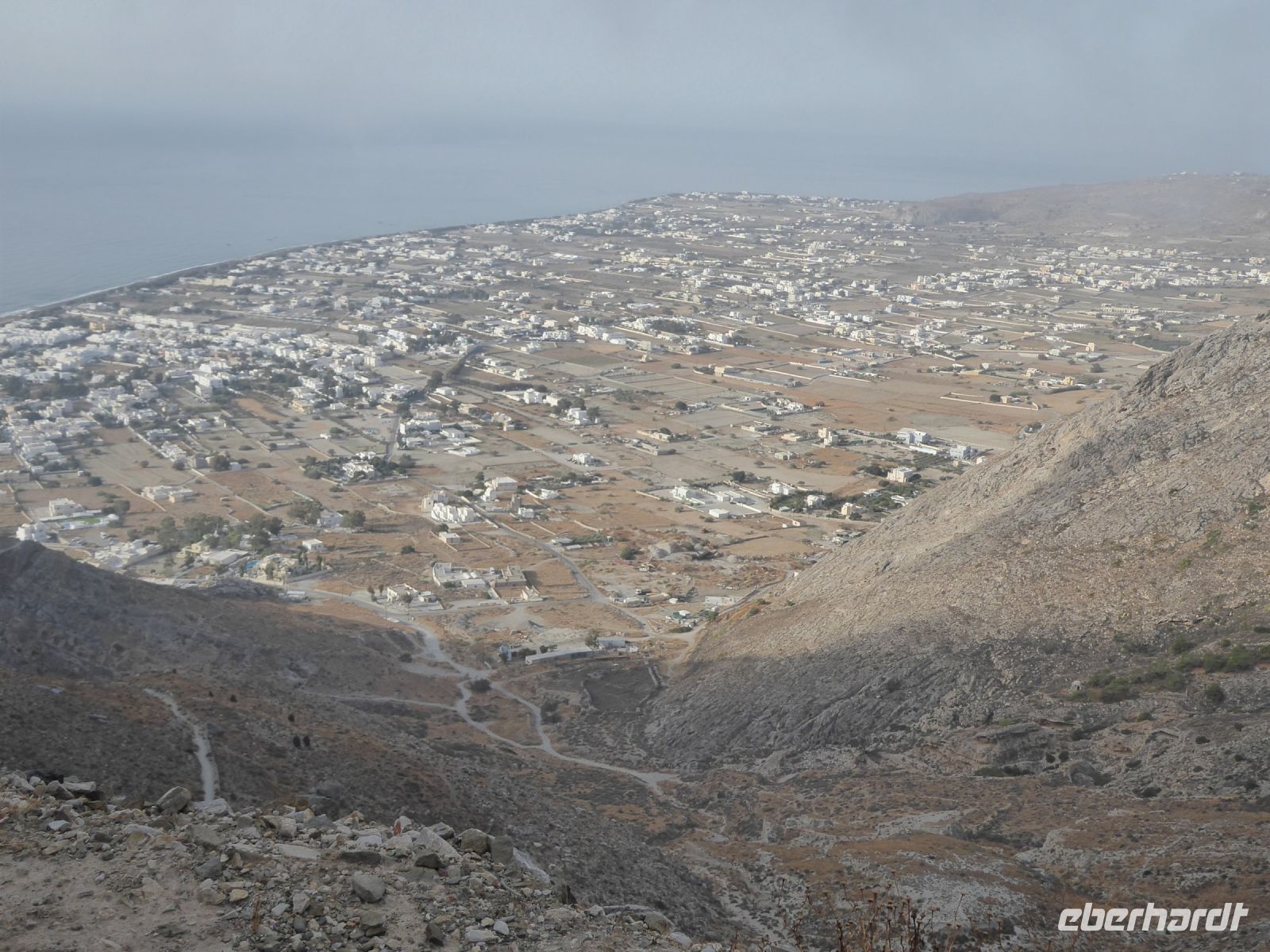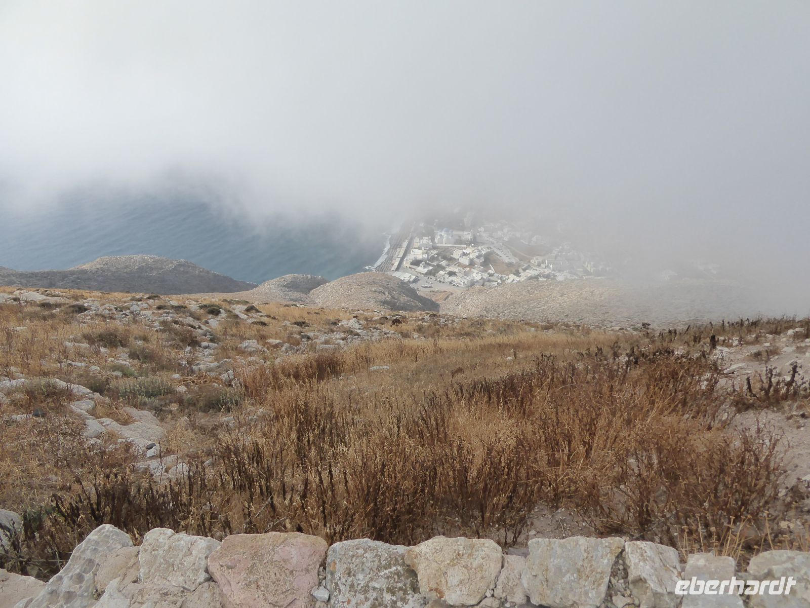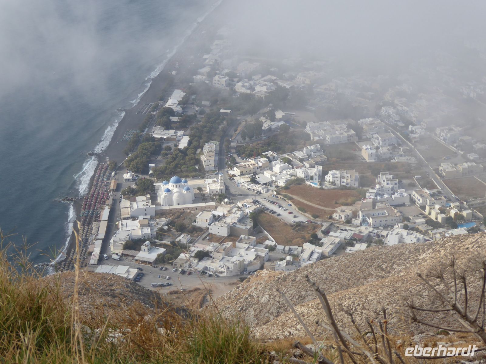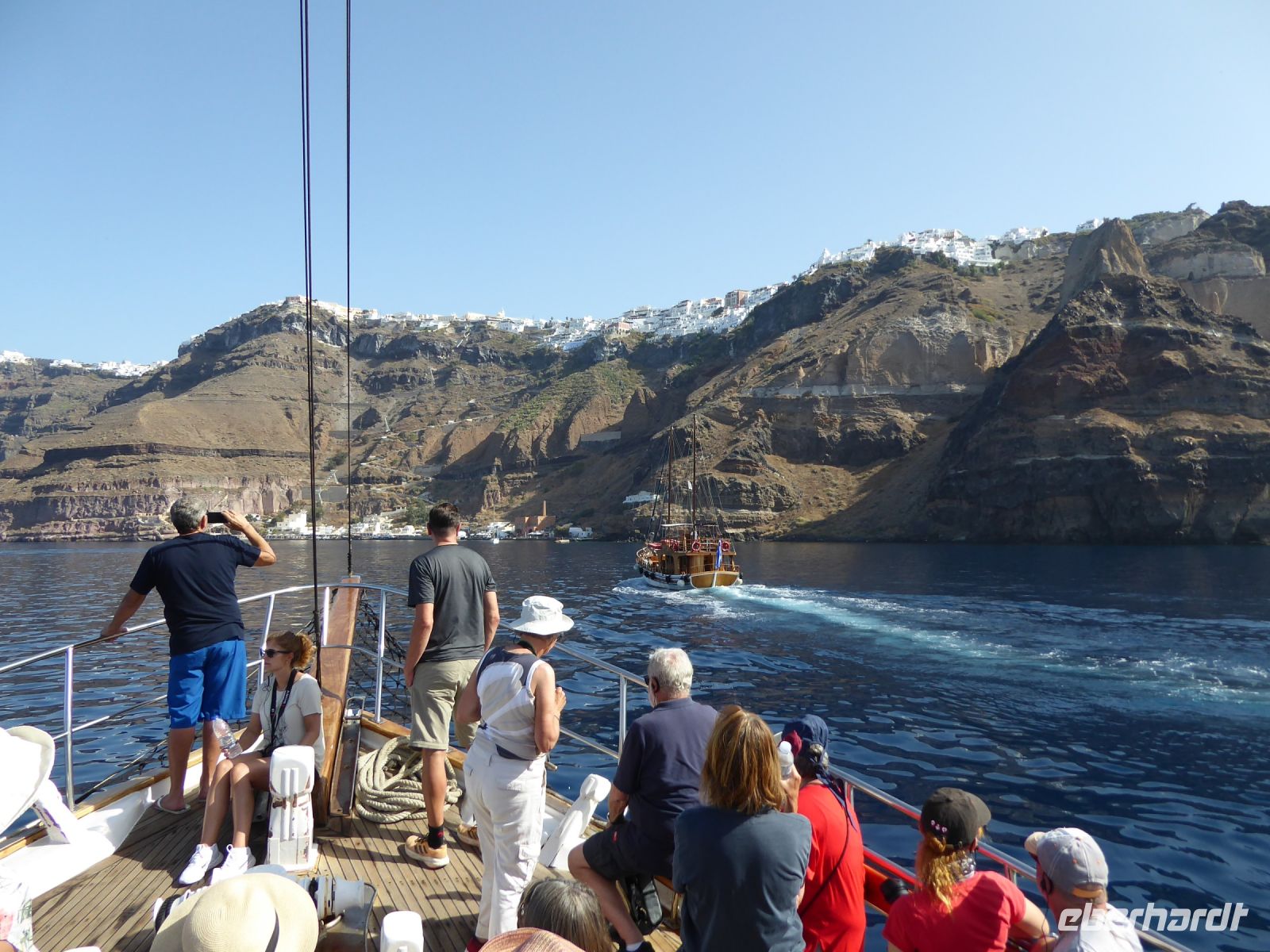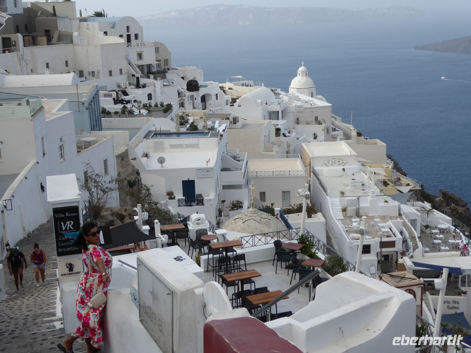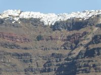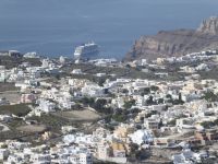 Vom Busparkplatz müssen noch etwa 100 Höhenmeter über steinigen, zum Teil steilen Weg zurückgelegt werden. An diesem Morgen hängen die Wolken tief, und erstmals können wir nichts bis nicht viel von hier oben sehen. Ein frischer Wind bläst die Wolken von Norden über den Berg. Nicht alle schaffen den Weg hinauf bis zu den Ausgrabungen. Nach ca. einer Stunde bläst der Wind die Wolken=Nebel weg und gibt die Sicht frei. Für alle, die oben ankamen, gab eine interessante Führung durch die Zeugnisse mehrerer Epochen, der Dorer, Römer, und Byzantiner, die entlang der Heiligen Straße, die den Ort durchzog, Thermen, Theater, Tempel und Häuser hinterlassen haben. Auf den Weg nach Oios/IA legen wir einen Stopp ein auf einem toll gelegenen Weingut hoch über der Ebene. Es gibt vier verschiedene Weine und einen Imbiss, der das Mittagessen fast ersetzt. Anschließend fahren wir weiterRichtung Norden nach OIA/IA, dem Städtchen ganz im Norden der Insel auf ca. 100 m Höhe über dem Meer am Rand der Caldera. Nikkos führt uns vom Busparkplatz auf etwa halber Höhe hinauf zum Hauptplatz des Ortes. Hier gibt es dann Freizeit über zwei Stunden. Oia/Ia ist halt der Inbegriff der Postkarten-Motive von Santorini. Hier ist dann auch noch Zeit, für diejenigen die möchten, ein Mittagessen einzunehmen, andere nutzen Zeit im Ort weiter zum Bummeln und Fotografieren. Um 15.00 h ist dann Abfahrt zurück im Hotel Makarios in Kamari.