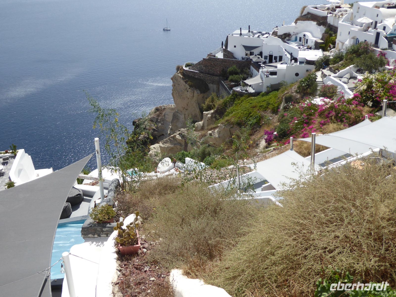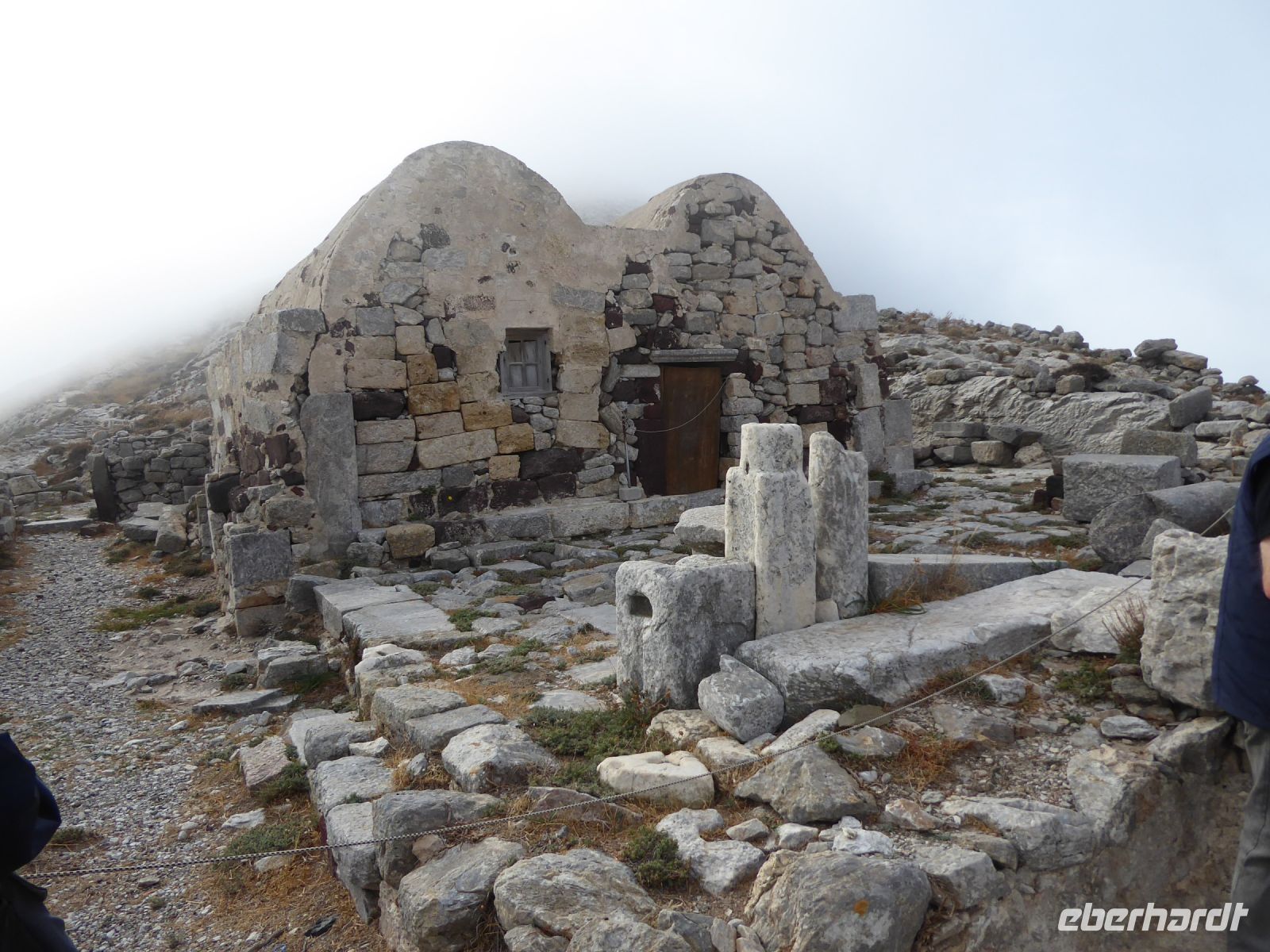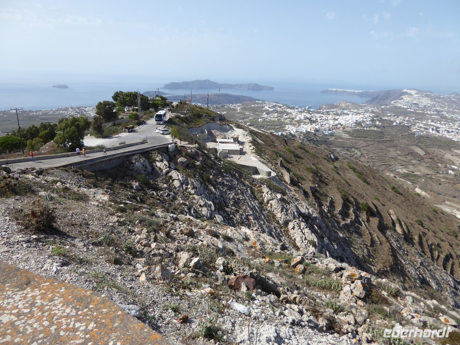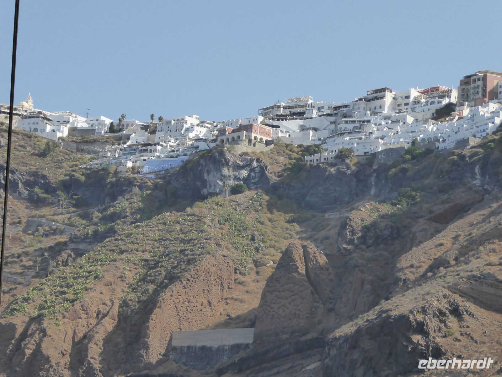Vom Busparkplatz müssen noch etwa 100 Höhenmeter über steinigen, zum Teil steilen Weg zurückgelegt werden. An diesem Morgen hängen die Wolken tief, und erstmals können wir nichts bis nicht viel von hier oben sehen. Ein frischer Wind bläst die Wolken von Norden über den Berg. Nicht alle schaffen den Weg hinauf bis zu den Ausgrabungen. Nach ca. einer Stunde bläst der Wind die Wolken=Nebel weg und gibt die Sicht frei. Für alle, die oben ankamen, gab eine interessante Führung durch die Zeugnisse mehrerer Epochen, der Dorer, Römer, und Byzantiner, die entlang der Heiligen Straße, die den Ort durchzog, Thermen, Theater, Tempel und Häuser hinterlassen haben. Auf den Weg nach Oios/IA legen wir einen Stopp ein auf einem toll gelegenen Weingut hoch über der Ebene. Es gibt vier verschiedene Weine und einen Imbiss, der das Mittagessen fast ersetzt. Anschließend fahren wir weiterRichtung Norden nach OIA/IA, dem Städtchen ganz im Norden der Insel auf ca. 100 m Höhe über dem Meer am Rand der Caldera. Nikkos führt uns vom Busparkplatz auf etwa halber Höhe hinauf zum Hauptplatz des Ortes. Hier gibt es dann Freizeit über zwei Stunden. Oia/Ia ist halt der Inbegriff der Postkarten-Motive von Santorini. Hier ist dann auch noch Zeit, für diejenigen die möchten, ein Mittagessen einzunehmen, andere nutzen Zeit im Ort weiter zum Bummeln und Fotografieren. Um 15.00 h ist dann Abfahrt zurück im Hotel Makarios in Kamari.