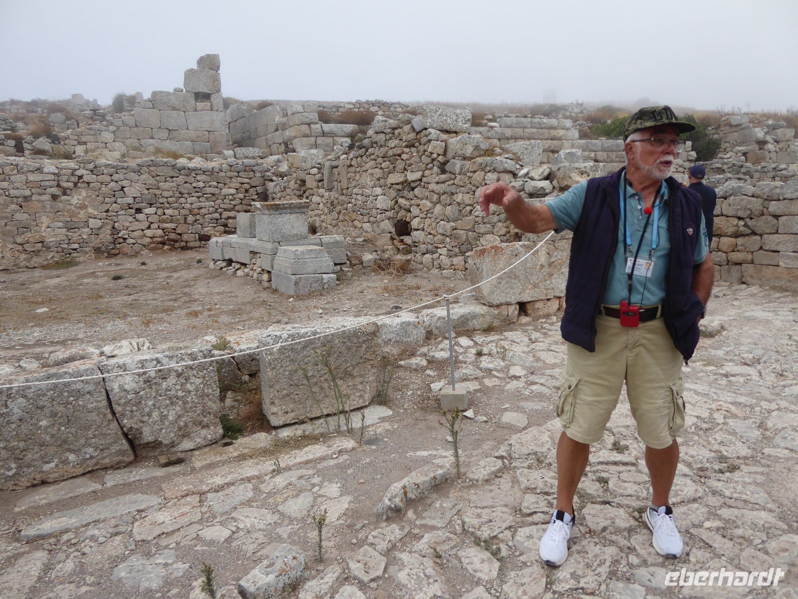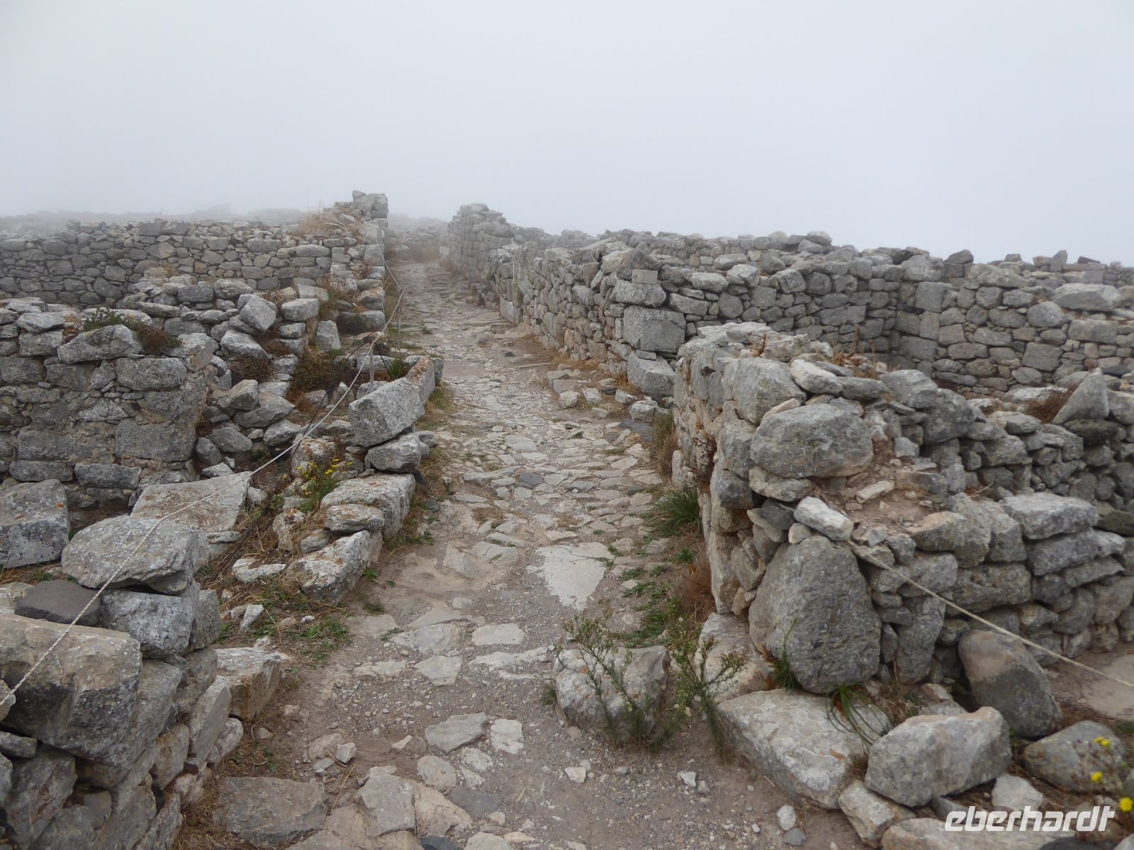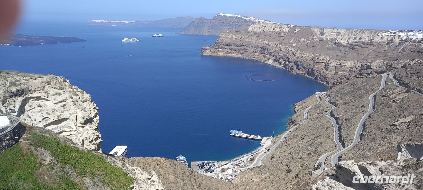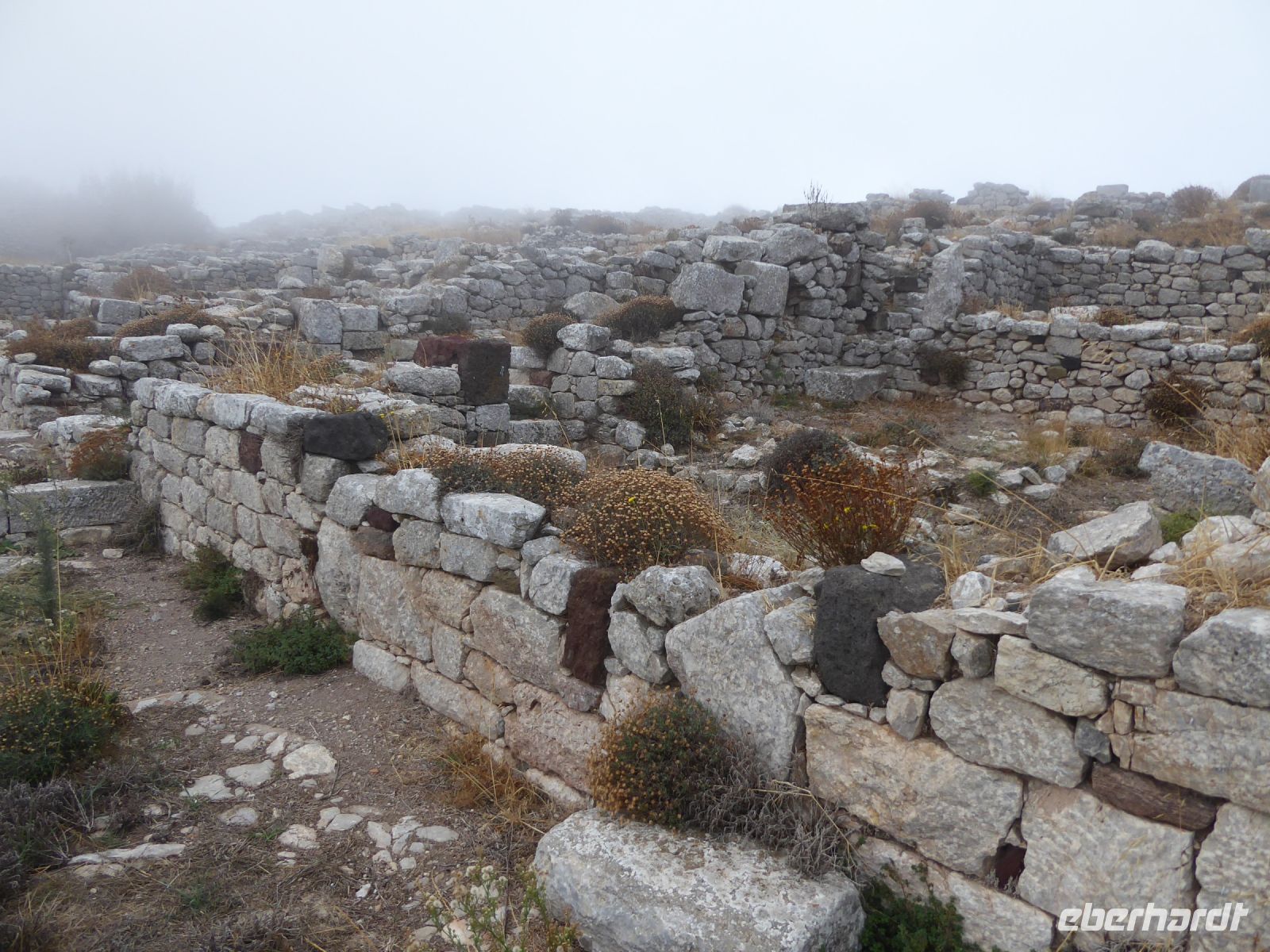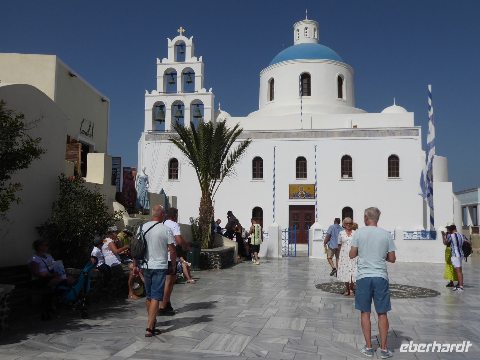 Vom Busparkplatz müssen noch etwa 100 Höhenmeter über steinigen, zum Teil steilen Weg zurückgelegt werden. An diesem Morgen hängen die Wolken tief, und erstmals können wir nichts bis nicht viel von hier oben sehen. Ein frischer Wind bläst die Wolken von Norden über den Berg. Nicht alle schaffen den Weg hinauf bis zu den Ausgrabungen. Nach ca. einer Stunde bläst der Wind die Wolken=Nebel weg und gibt die Sicht frei. Für alle, die oben ankamen, gab eine interessante Führung durch die Zeugnisse mehrerer Epochen, der Dorer, Römer, und Byzantiner, die entlang der Heiligen Straße, die den Ort durchzog, Thermen, Theater, Tempel und Häuser hinterlassen haben. Auf den Weg nach Oios/IA legen wir einen Stopp ein auf einem toll gelegenen Weingut hoch über der Ebene. Es gibt vier verschiedene Weine und einen Imbiss, der das Mittagessen fast ersetzt. Anschließend fahren wir weiterRichtung Norden nach OIA/IA, dem Städtchen ganz im Norden der Insel auf ca. 100 m Höhe über dem Meer am Rand der Caldera. Nikkos führt uns vom Busparkplatz auf etwa halber Höhe hinauf zum Hauptplatz des Ortes. Hier gibt es dann Freizeit über zwei Stunden. Oia/Ia ist halt der Inbegriff der Postkarten-Motive von Santorini. Hier ist dann auch noch Zeit, für diejenigen die möchten, ein Mittagessen einzunehmen, andere nutzen Zeit im Ort weiter zum Bummeln und Fotografieren. Um 15.00 h ist dann Abfahrt zurück im Hotel Makarios in Kamari.