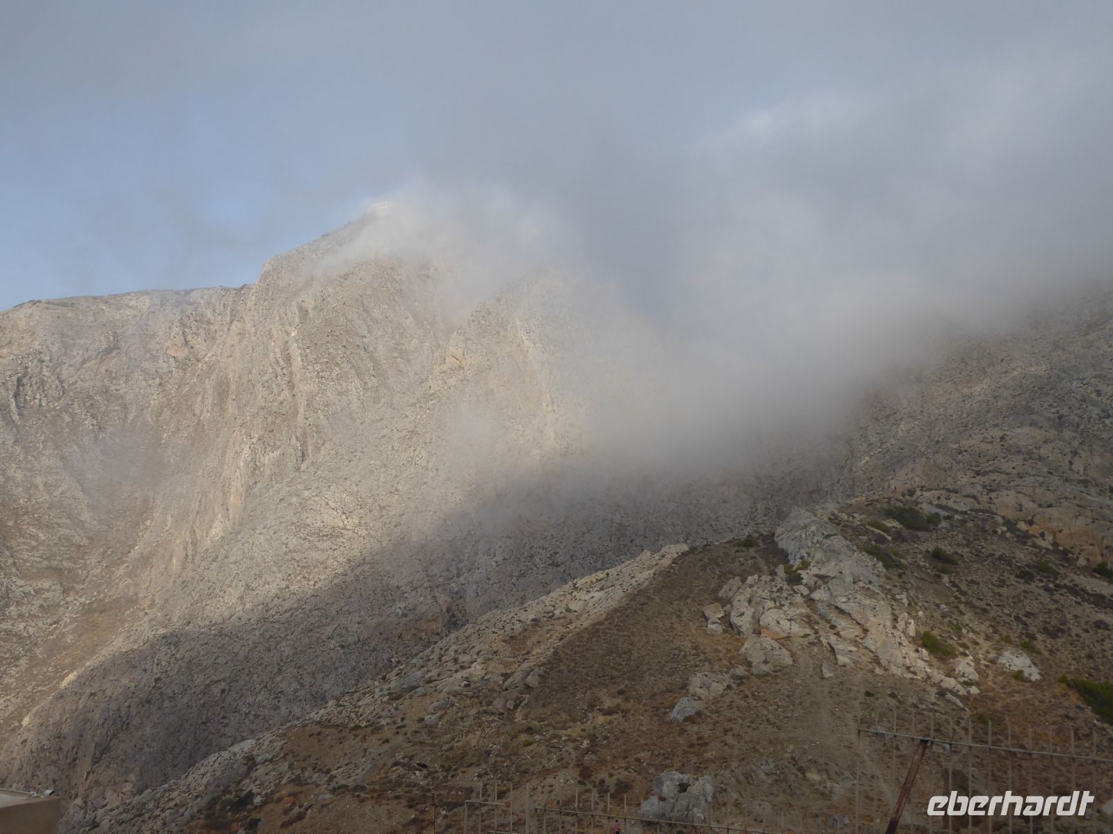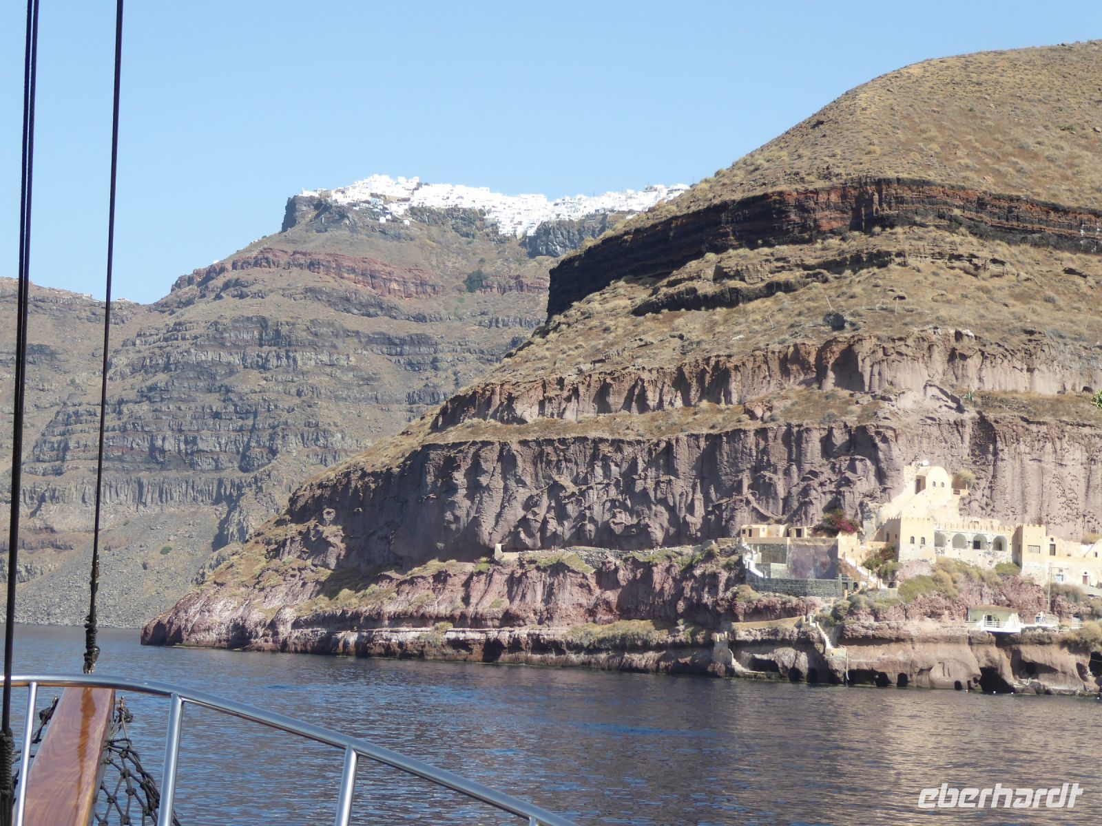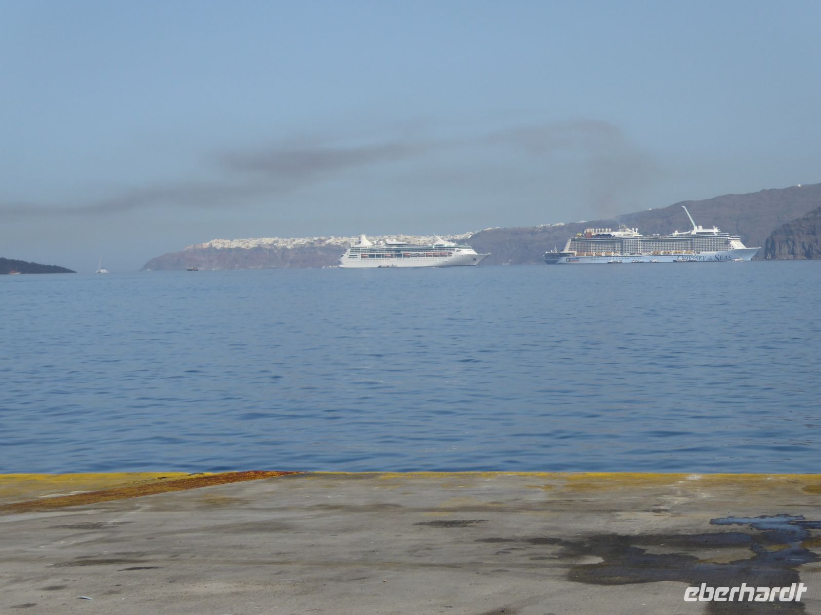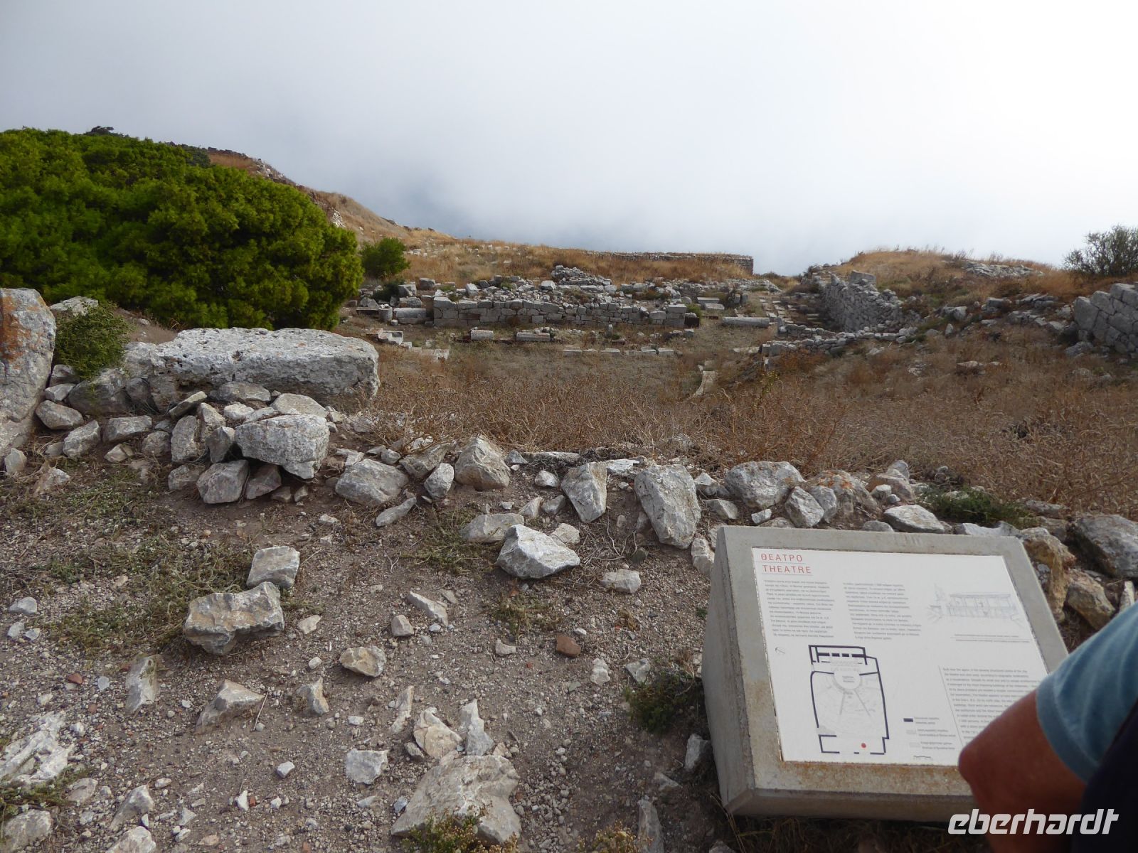 Vom Busparkplatz müssen noch etwa 100 Höhenmeter über steinigen, zum Teil steilen Weg zurückgelegt werden. An diesem Morgen hängen die Wolken tief, und erstmals können wir nichts bis nicht viel von hier oben sehen. Ein frischer Wind bläst die Wolken von Norden über den Berg. Nicht alle schaffen den Weg hinauf bis zu den Ausgrabungen. Nach ca. einer Stunde bläst der Wind die Wolken=Nebel weg und gibt die Sicht frei. Für alle, die oben ankamen, gab eine interessante Führung durch die Zeugnisse mehrerer Epochen, der Dorer, Römer, und Byzantiner, die entlang der Heiligen Straße, die den Ort durchzog, Thermen, Theater, Tempel und Häuser hinterlassen haben. Auf den Weg nach Oios/IA legen wir einen Stopp ein auf einem toll gelegenen Weingut hoch über der Ebene. Es gibt vier verschiedene Weine und einen Imbiss, der das Mittagessen fast ersetzt. Anschließend fahren wir weiterRichtung Norden nach OIA/IA, dem Städtchen ganz im Norden der Insel auf ca. 100 m Höhe über dem Meer am Rand der Caldera. Nikkos führt uns vom Busparkplatz auf etwa halber Höhe hinauf zum Hauptplatz des Ortes. Hier gibt es dann Freizeit über zwei Stunden. Oia/Ia ist halt der Inbegriff der Postkarten-Motive von Santorini. Hier ist dann auch noch Zeit, für diejenigen die möchten, ein Mittagessen einzunehmen, andere nutzen Zeit im Ort weiter zum Bummeln und Fotografieren. Um 15.00 h ist dann Abfahrt zurück im Hotel Makarios in Kamari.