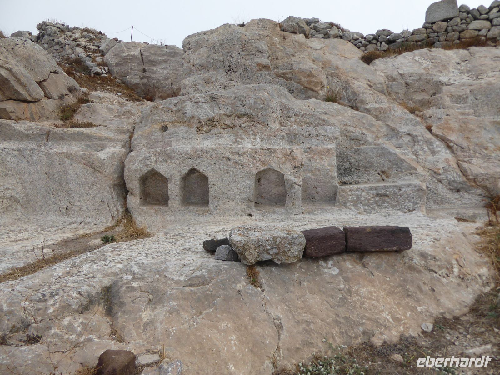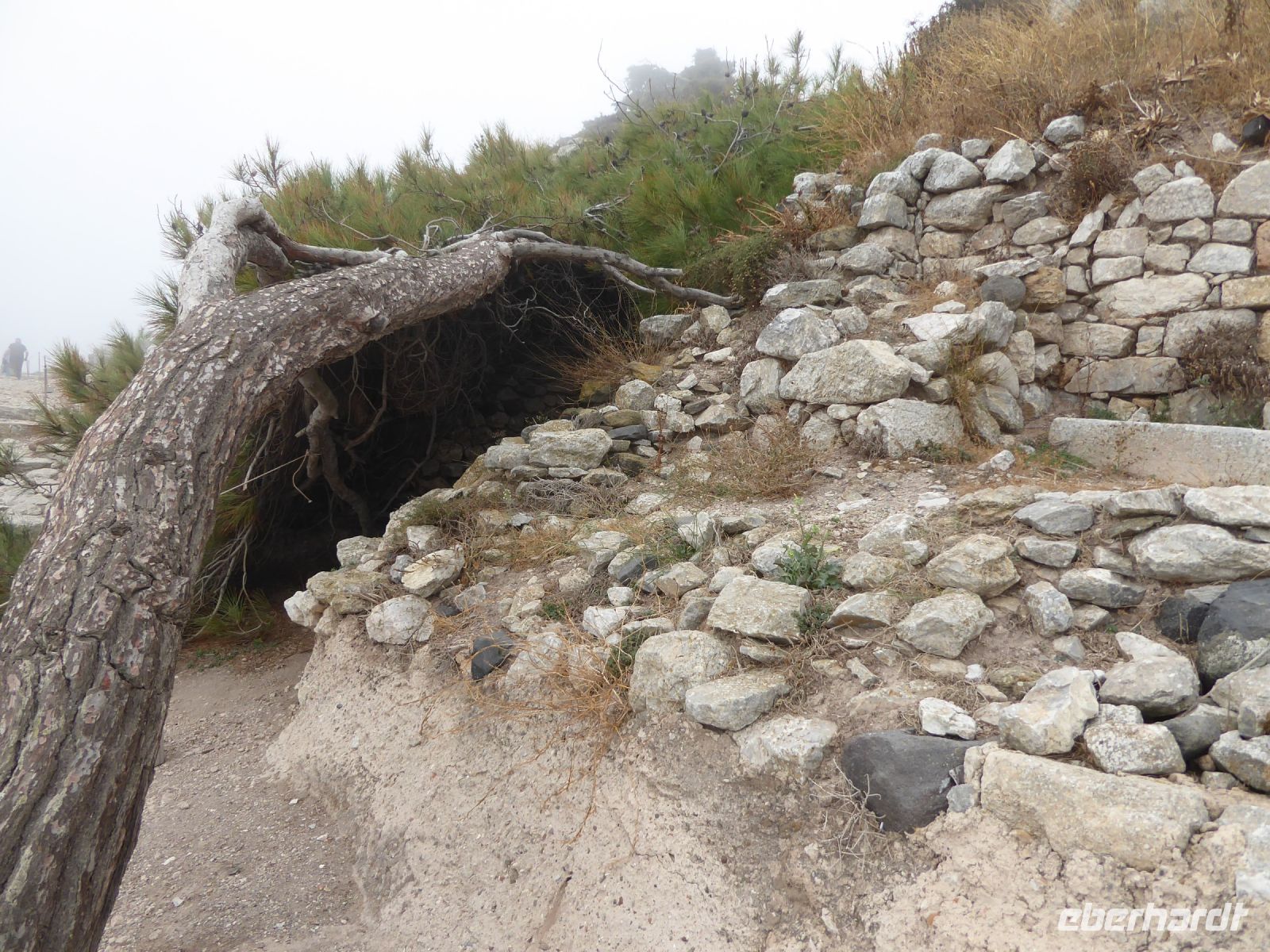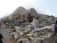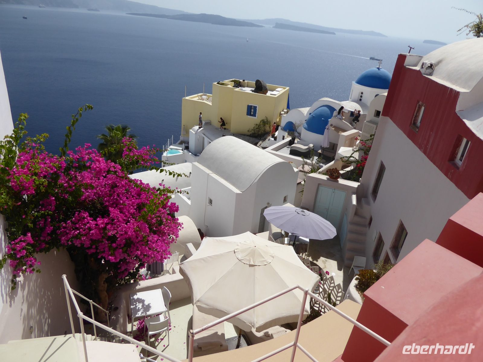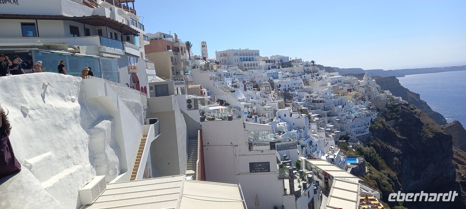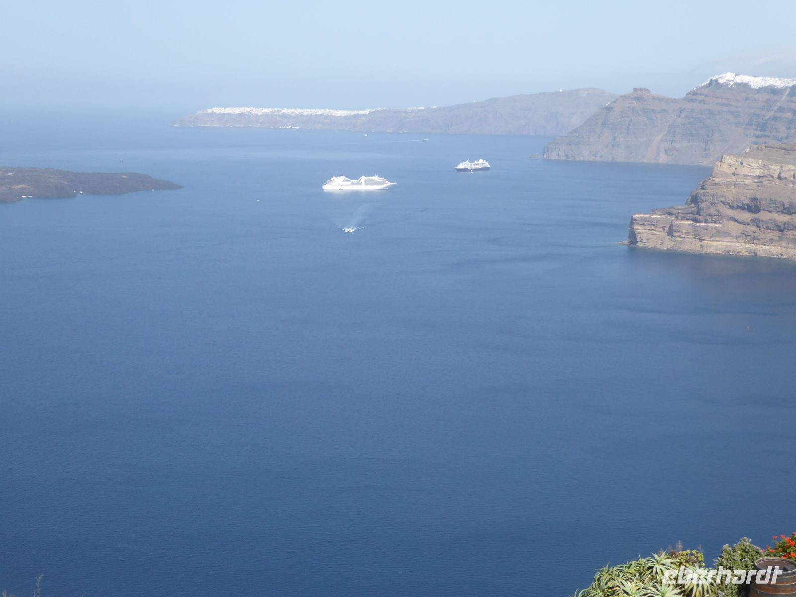 Vom Busparkplatz müssen noch etwa 100 Höhenmeter über steinigen, zum Teil steilen Weg zurückgelegt werden. An diesem Morgen hängen die Wolken tief, und erstmals können wir nichts bis nicht viel von hier oben sehen. Ein frischer Wind bläst die Wolken von Norden über den Berg. Nicht alle schaffen den Weg hinauf bis zu den Ausgrabungen. Nach ca. einer Stunde bläst der Wind die Wolken=Nebel weg und gibt die Sicht frei. Für alle, die oben ankamen, gab eine interessante Führung durch die Zeugnisse mehrerer Epochen, der Dorer, Römer, und Byzantiner, die entlang der Heiligen Straße, die den Ort durchzog, Thermen, Theater, Tempel und Häuser hinterlassen haben. Auf den Weg nach Oios/IA legen wir einen Stopp ein auf einem toll gelegenen Weingut hoch über der Ebene. Es gibt vier verschiedene Weine und einen Imbiss, der das Mittagessen fast ersetzt. Anschließend fahren wir weiterRichtung Norden nach OIA/IA, dem Städtchen ganz im Norden der Insel auf ca. 100 m Höhe über dem Meer am Rand der Caldera. Nikkos führt uns vom Busparkplatz auf etwa halber Höhe hinauf zum Hauptplatz des Ortes. Hier gibt es dann Freizeit über zwei Stunden. Oia/Ia ist halt der Inbegriff der Postkarten-Motive von Santorini. Hier ist dann auch noch Zeit, für diejenigen die möchten, ein Mittagessen einzunehmen, andere nutzen Zeit im Ort weiter zum Bummeln und Fotografieren. Um 15.00 h ist dann Abfahrt zurück im Hotel Makarios in Kamari.