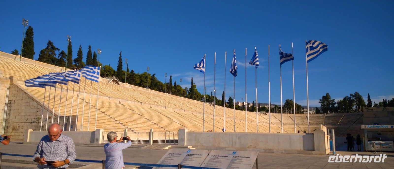 Der Großteil der Reisegruppe trifft sich zur vereinbarten Zeit im Berliner Flughafen BER mit der Reisebegleitung. Es geht los mit der ersten Menschenschlange bei der Gepäckabgabe/Check-in. Hier konnten wir gerade noch verhindern, dass das Gepäck nach Santorin durchgecheckt wurde, obwohl unsere Boardingcards nur nach Athen ausgestellt waren. Anschließend gab es die zweite, noch größere Schlange vor dem Sicherheitscheck. Zuletzt waren dann doch alle pünktlich am Gate um geringfügig verspätet nach Athen zu starten. Der Flieger war zwar voll, trotzdem war es ein entspannter Flug. In Athen an der Gepäckausgabe trafen wir dann unsere Gäste aus Hamburg, die fast zeitgleich in Athen gelandet sind. Leider sind insgesamt drei Koffer nicht in Athen eingetroffen. Während unser lokaler Reiseleiter Nikkos die meisten Gäste außerhalb des Sicherheitsbereichs in Empfang nehmen konnte, mussten die „Kofferlosen“ mit zum Lost & Found um die Suchanzeigen aufzugeben. Man machte uns Hoffnung , dass die Koffer wahrscheinlich auf Santorini auftauchen würden… Letztlich konnten wir alle zum Bus und mit unserem Guide zu einer Stadtrundfahrt durch Athen zu starten. Im Vorbeifahren sahen wir das moderne Athen und machten einen Fotostopp am alten Panathenaik Stadion . Hier werden heute zwar keine Wettkämpfe abgehalten, dafür aber Festivals und Konzerte, und die Olympische Flamme, die bekanntlich in Olympia auf der Peloponnes entzündet wird, wird hier in Athen den internationalen Staffeln übergeben. - Weiter ging es vorbei an der „Athener Trilogie“ vorbei zu unserem Hotel „Titania“. Nach einem schnellen und problemlosen Check-in gab es erst einmal einen Willkommens-Ouzo vom Hotelmanagement, dann konnten alle Zimmer bezogen werden. Ein erstes griechisches Abendessen gab es im Kongresssaal des Hotel, den Abschluss des Tages machte ein Besuch auf der Dachterrasse des Hotel mit einem atemberaubenden Blick über die Stadt und die angestrahlte Akropolis.